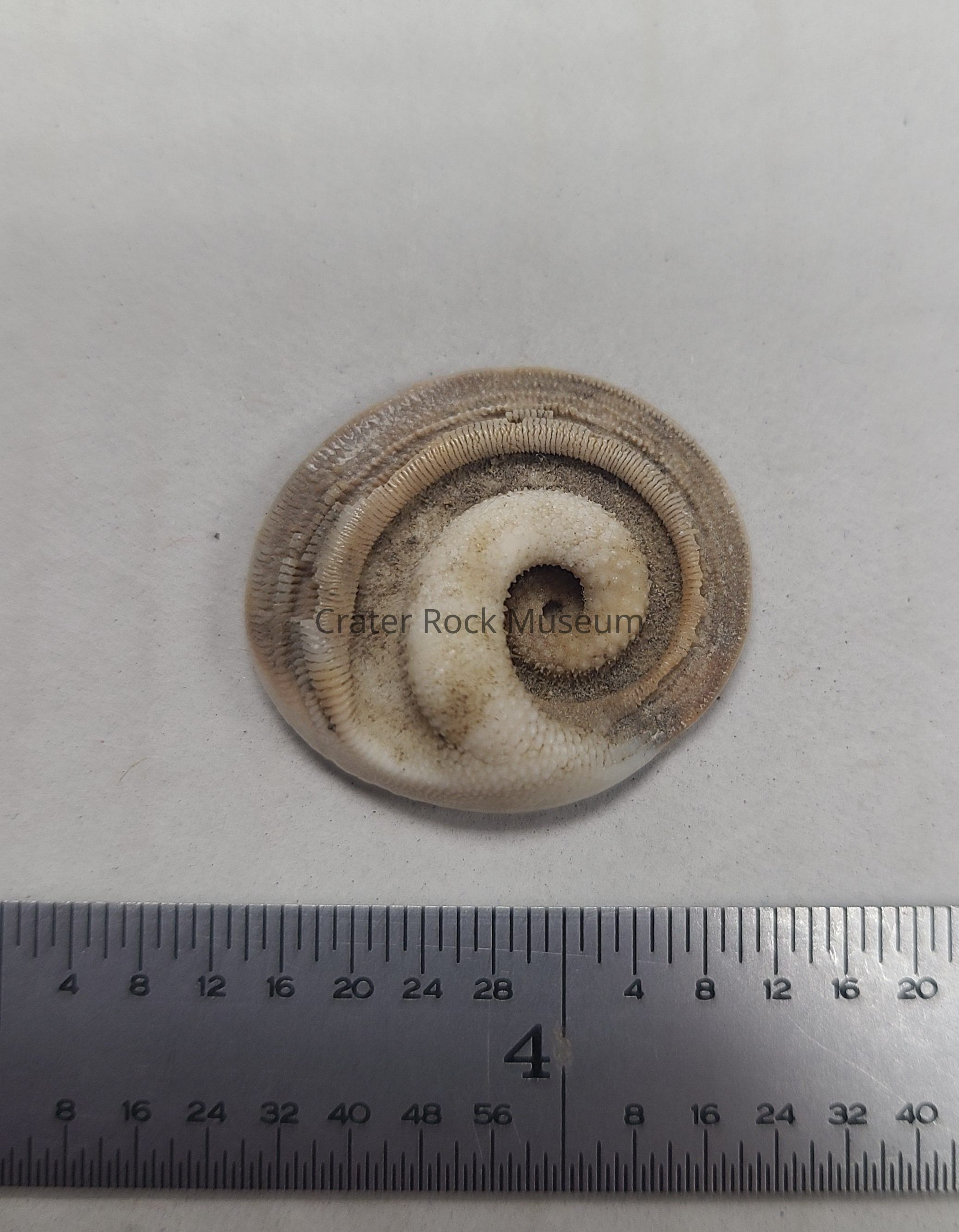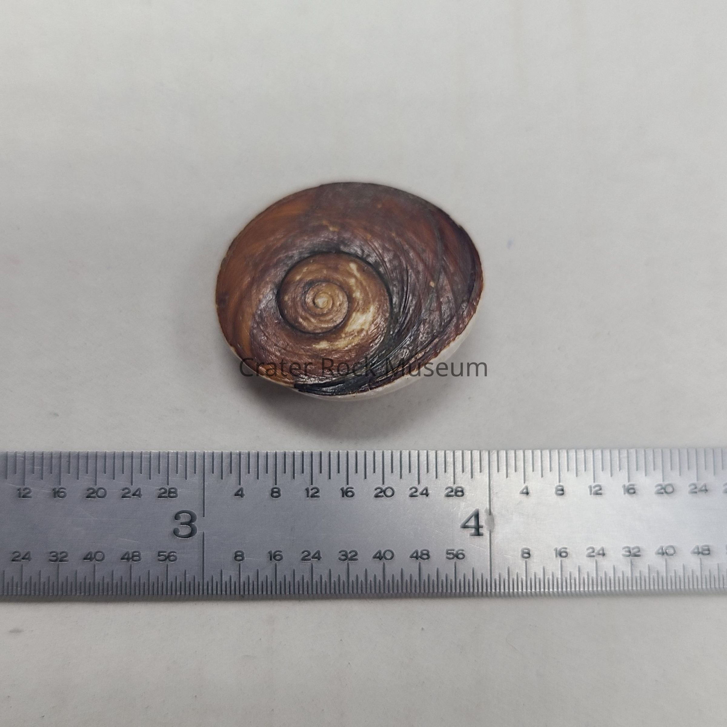 An operculum is a hard protective covering that grows with the snail and acts a protective stopper when the soft interior of the animal is retracted into the shell. When the snail dies, these round white 'shells' with brown whorls on the underside are often found washed up on beaches and used for jewelry.Location