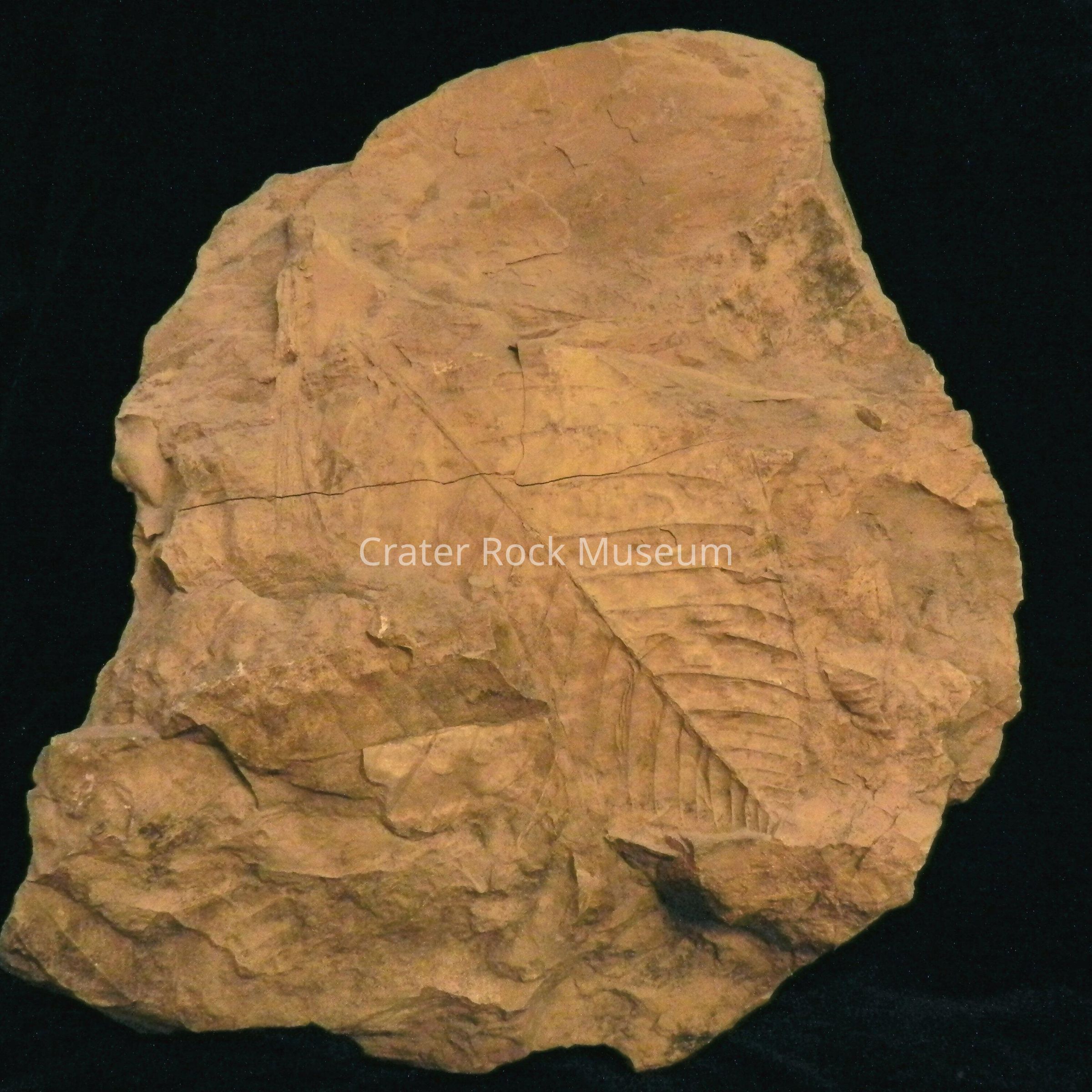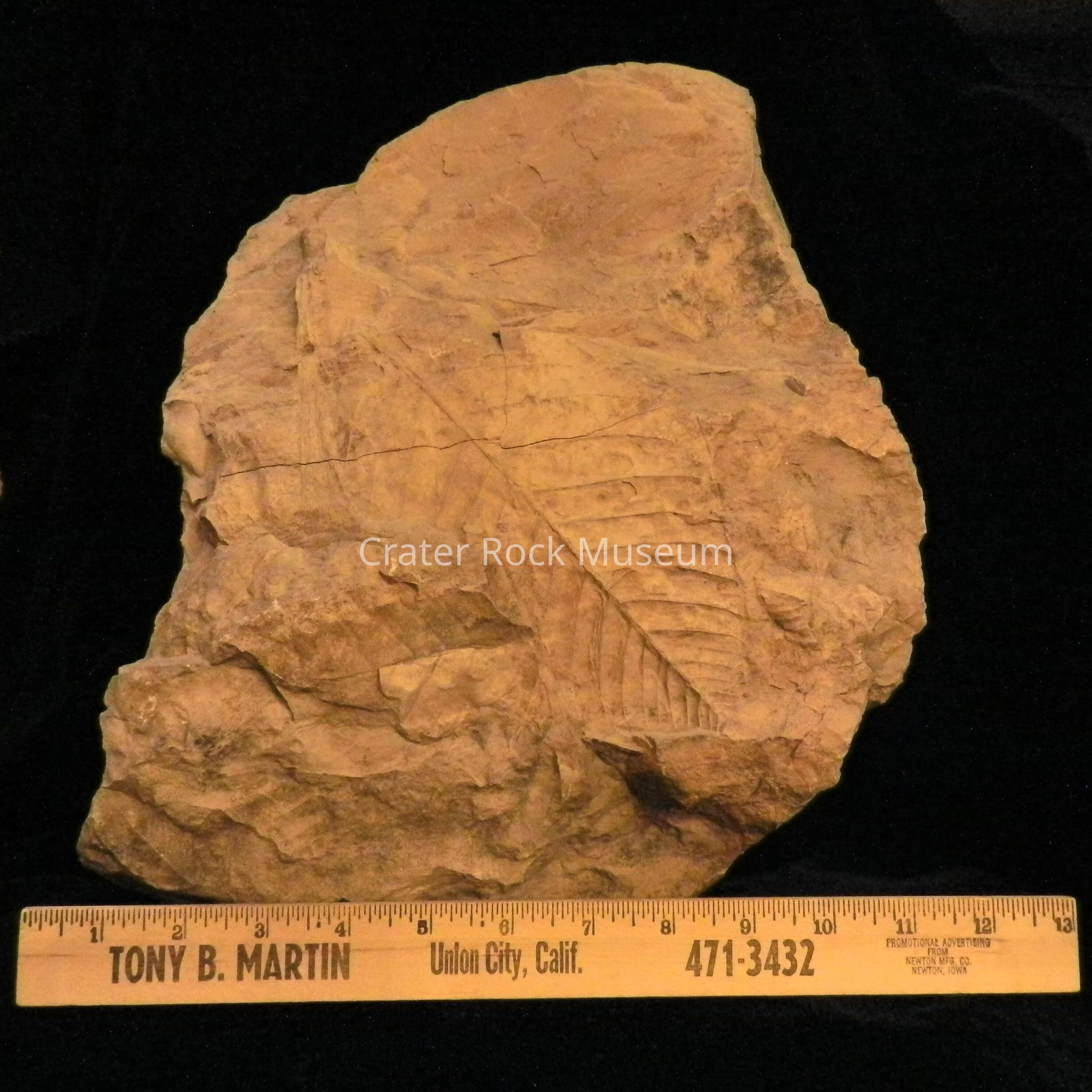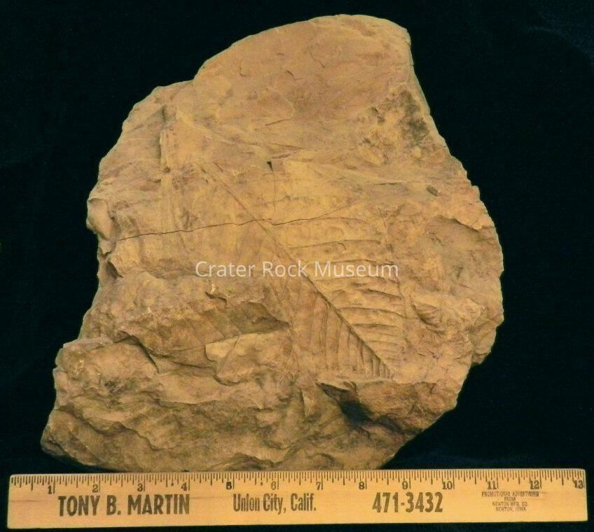 Description: Large, rough boulder with multiple fossil leaf impressions, including (1) large one (approx. 6.500"). Light to dark tan in color.