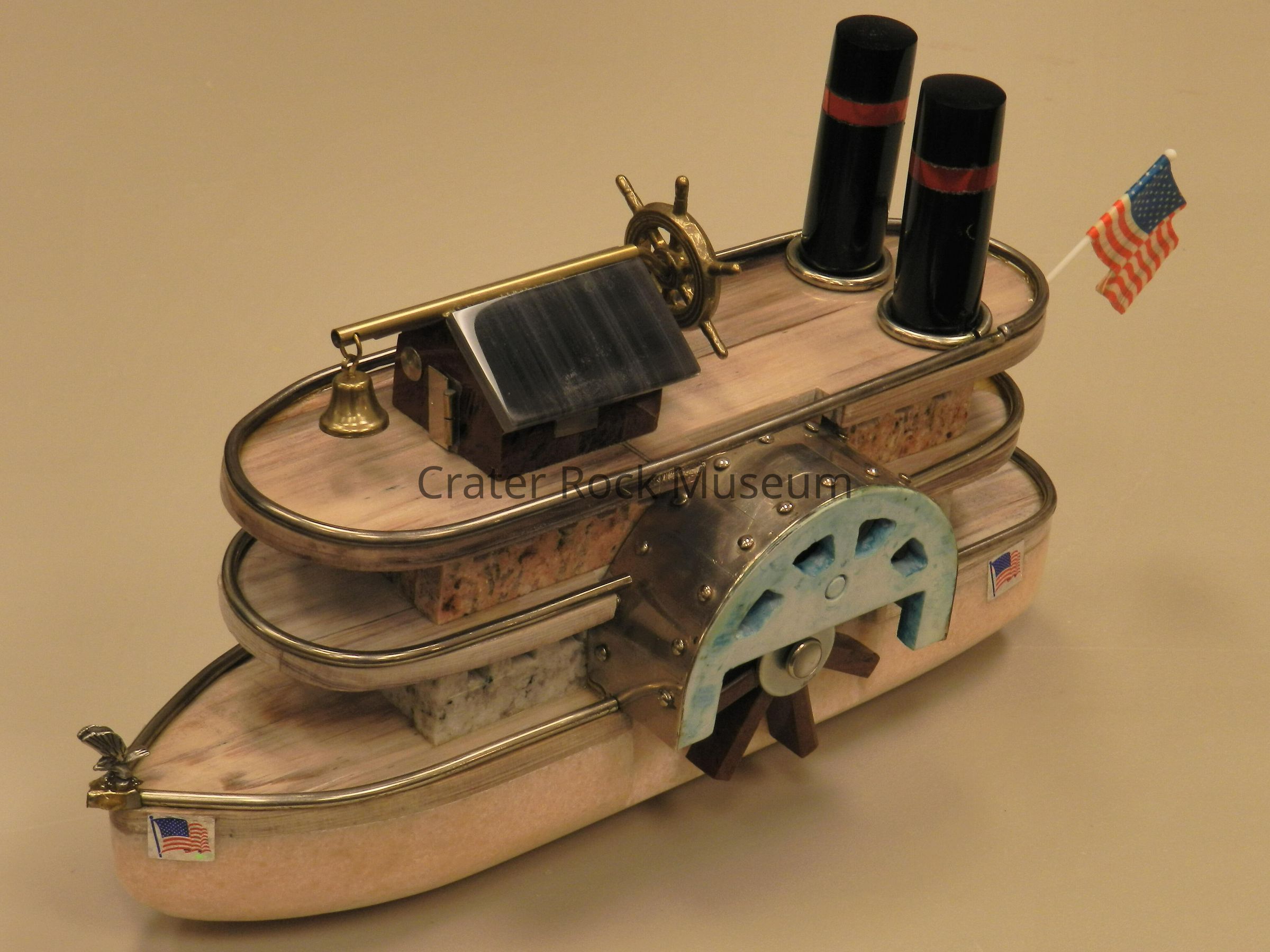 Paddle-wheel Steamboat: Hull and deck floors are white quartz. Cabins are pink and white granite. Wheelhouse and paddle-wheels are mahogony obsidian. Wheelhouse roof is rainbow obsidian. Paddle-wheel sprayguard is dyed howlite (sky blue). Smokestacks are obsidian with inlaid red glass. Gold-colored wheel, bell, railings, and trim. Silver-colored eagle on bow. Paper American flag on stern. American flag stick-ons on bow and stern of hull.Collection