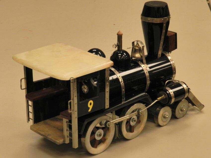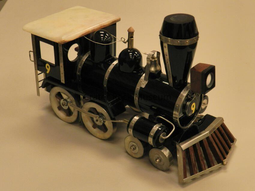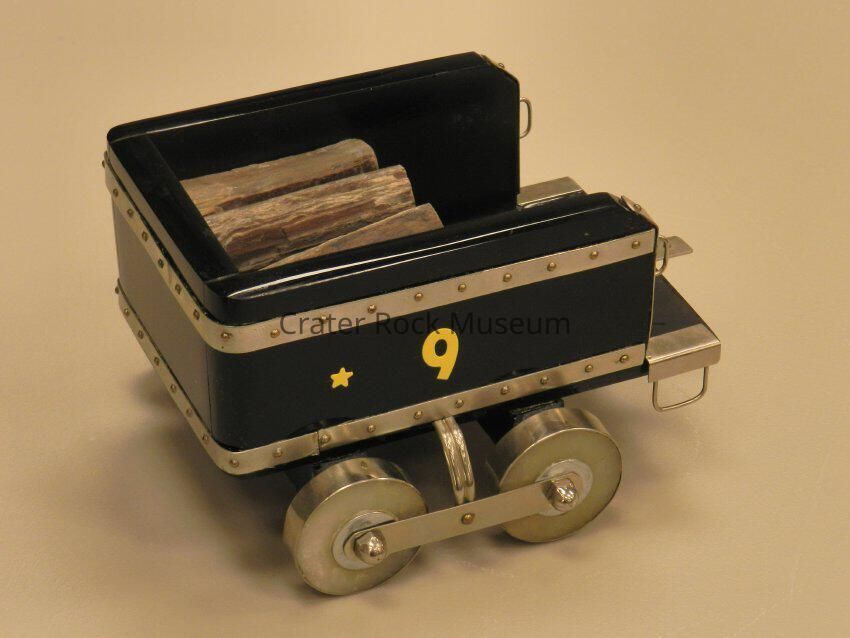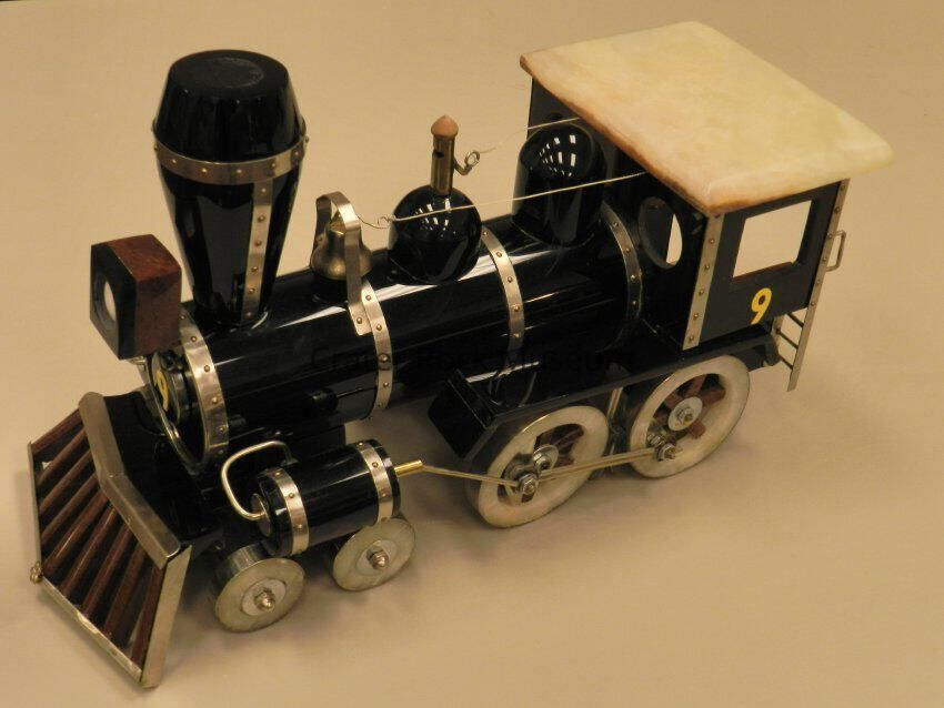 Steam Locomotive and Fuel Tender: Bodies of locomotive and tender are obsidian. Roof and wheels are onyx. Logs are petrified wood. Train-light casing is obsidian, mahogany obsidian, and onyx. Cow-catcher is obsidian. Both have varied metal trim. Yellow "9" on both. As received, smoke stack was detached and was re-glued. Rods to cylinders were detached and were re-attached.Collection