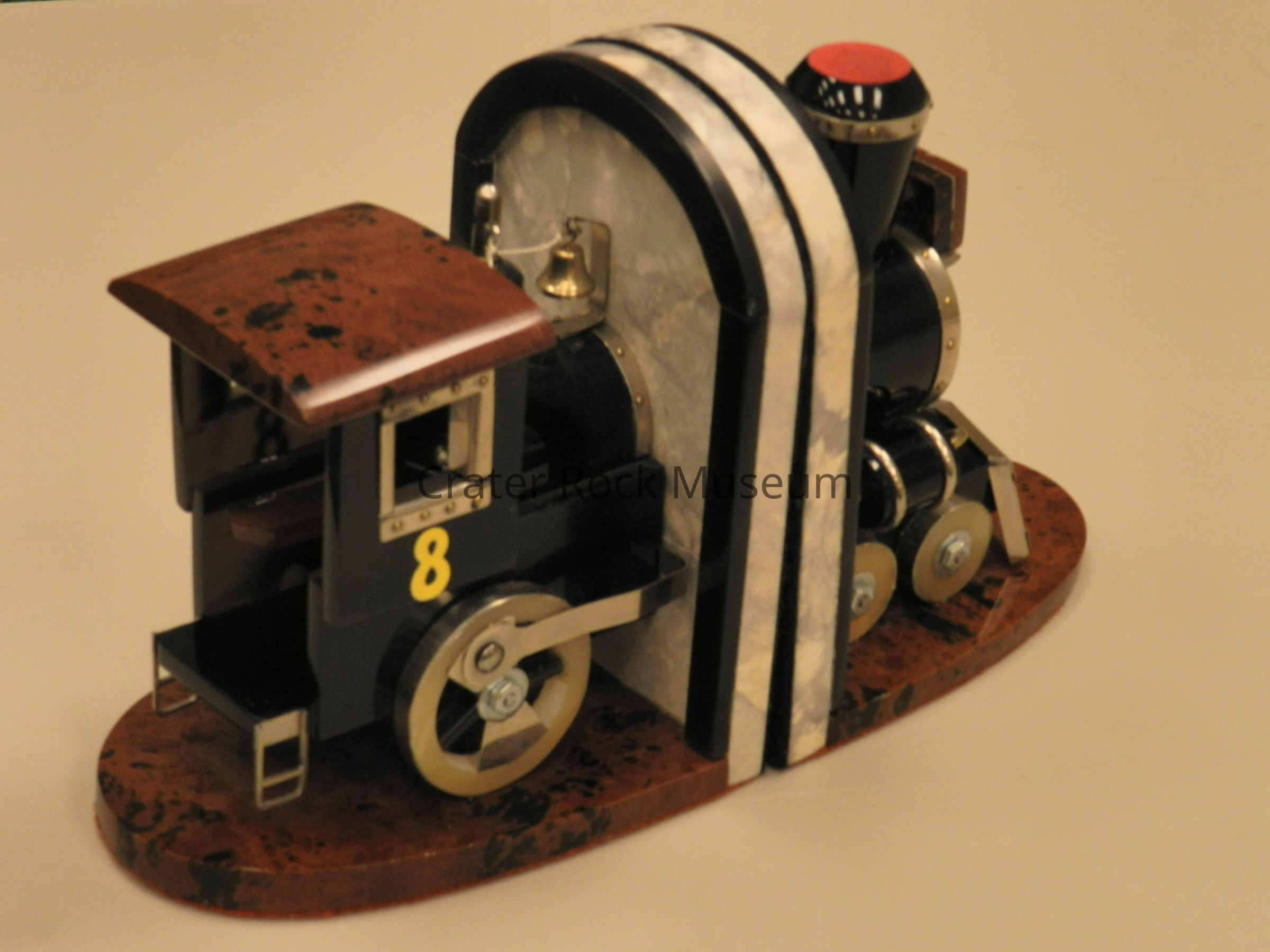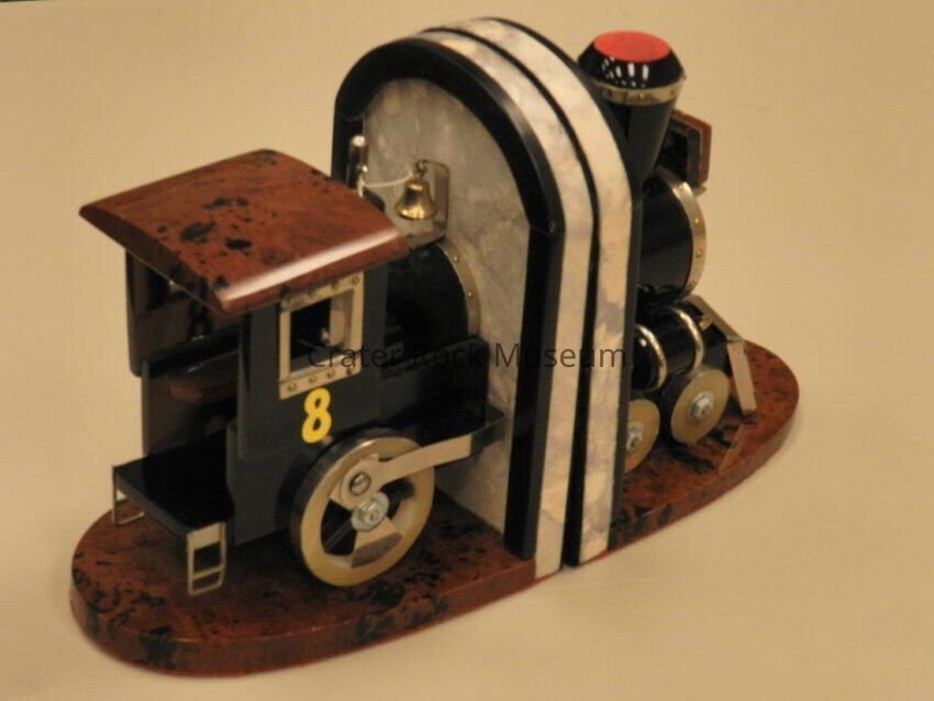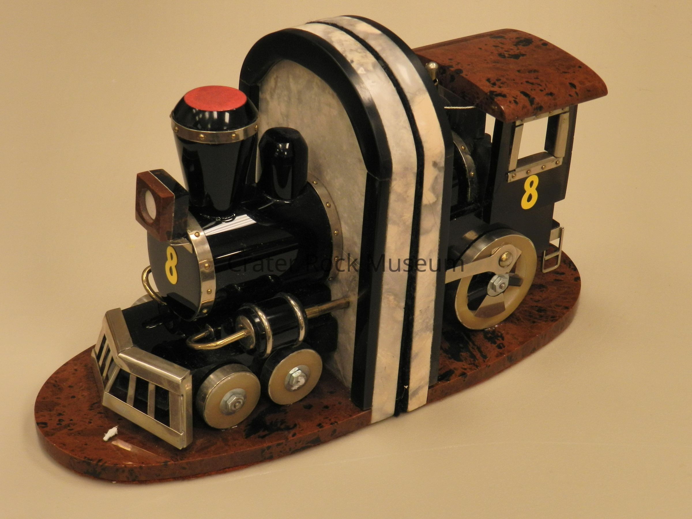 Steam Locomotive Bookends: (2 sections). Body, smokestack, and domes are obsidian. Cab roof and base are mahogany obsidian. Train-light casing is obsidian, mahogony obsidian, and onyx. Bookends are marble. Varied metal trim throughtout.Collection