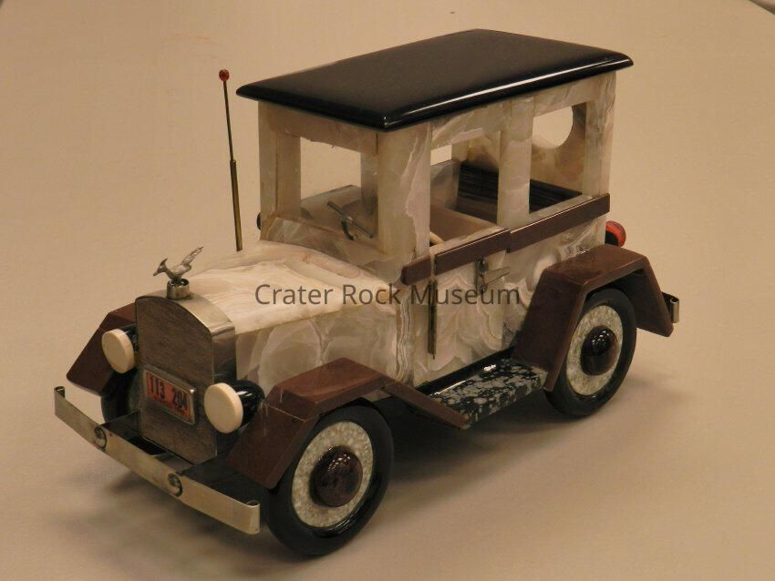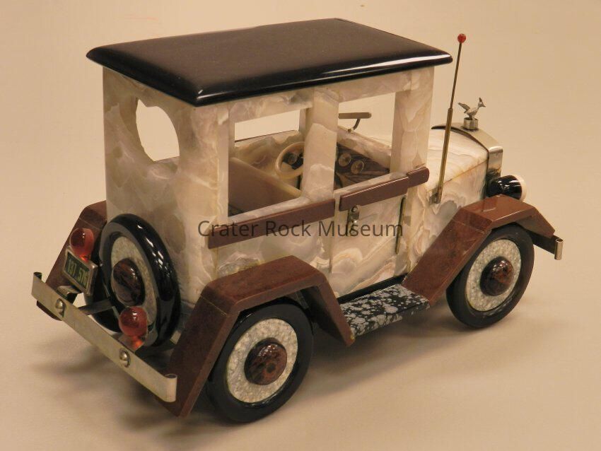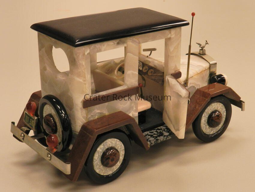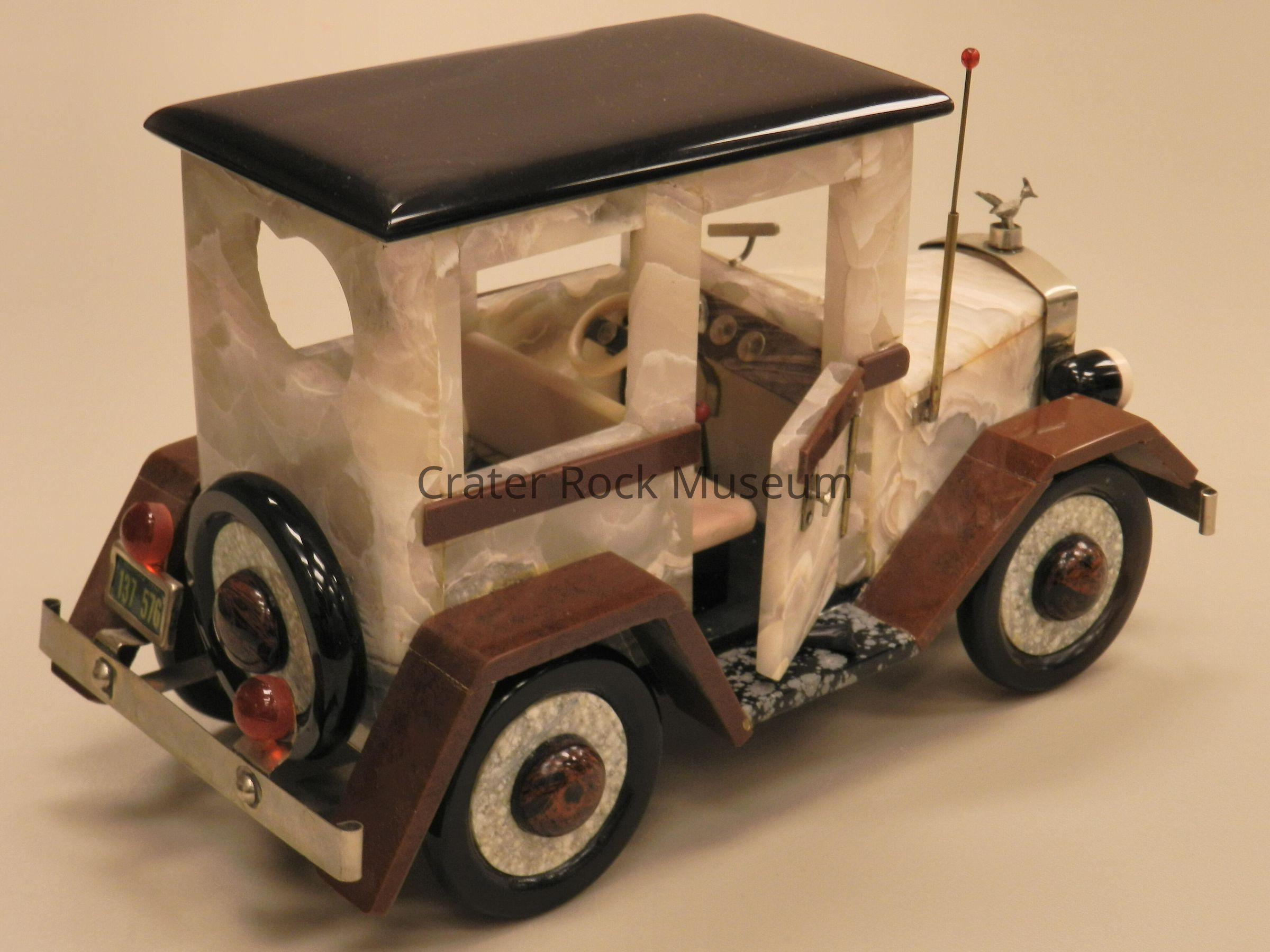 Town Car: Body is lace agate. Fenders are mahogony obsidian. Runnung boards are snowflake obsidian. Roof is obsidian. Wheel, rims are granite. Tires are obsidian. Hubs are mahogony obsidian. Seats and grill are petrified wood. Trim is mahogony obsidian. Varied metal trim. Roadrunner hood ornament. Red glass tailights.Collection