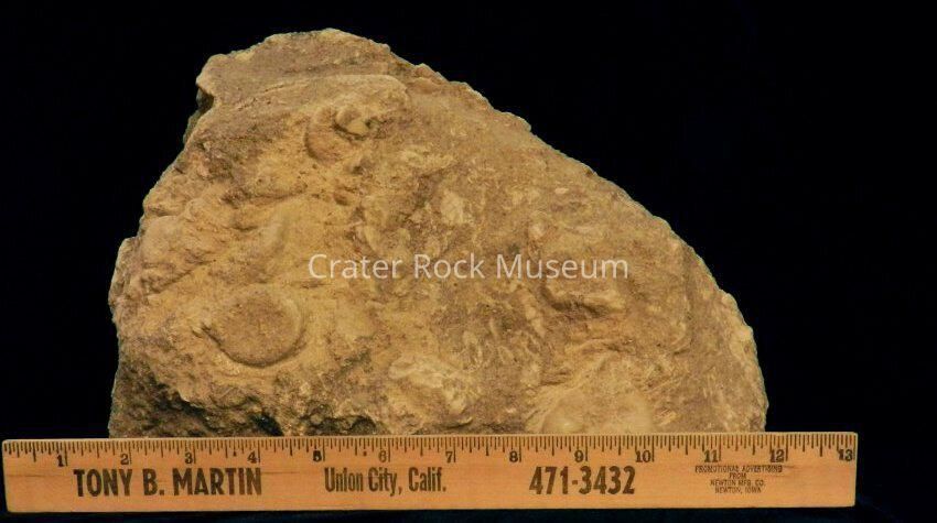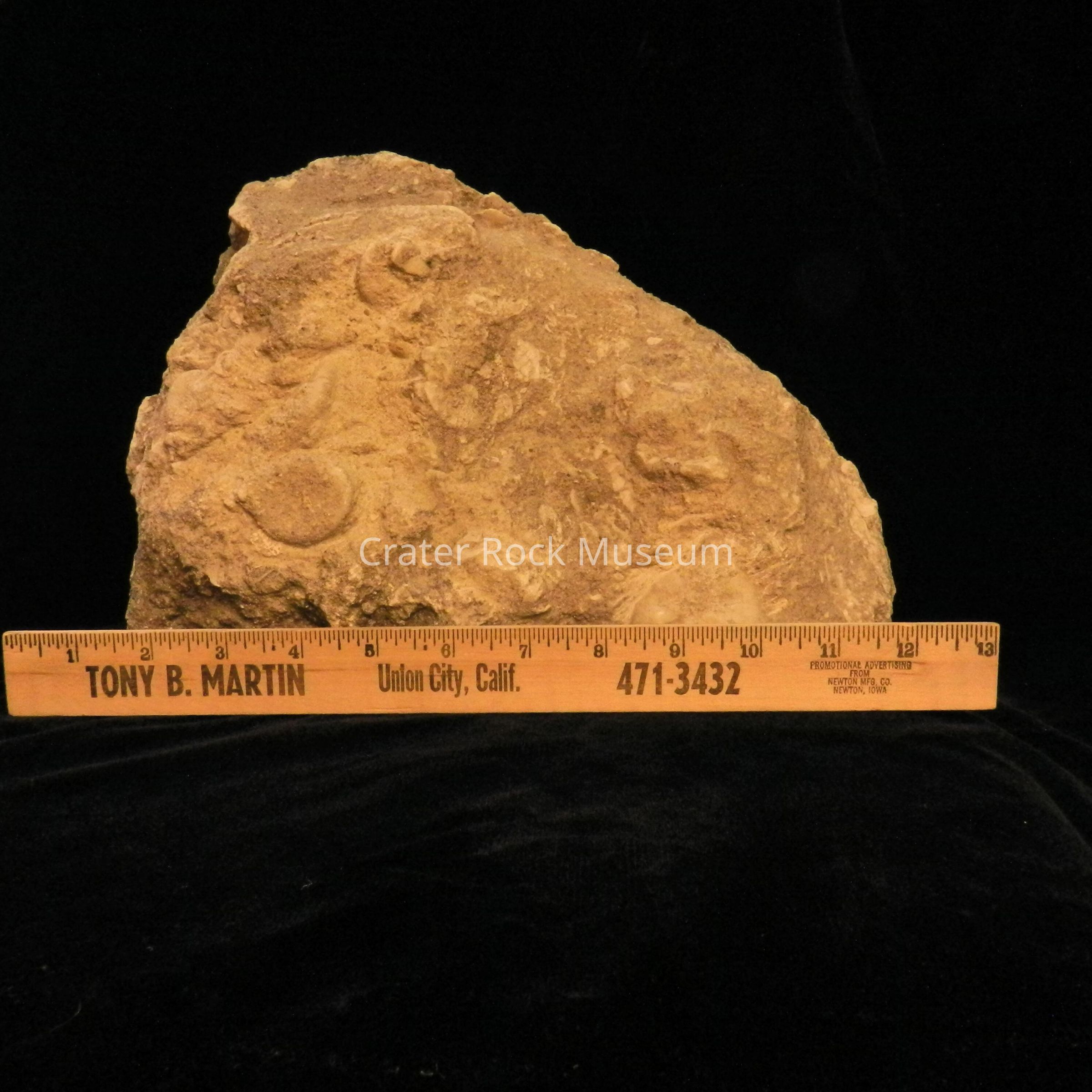 Description: A large conglomerate of marine fossils in a sandstone with mostly undistinguishable species except for a small sand dollar.