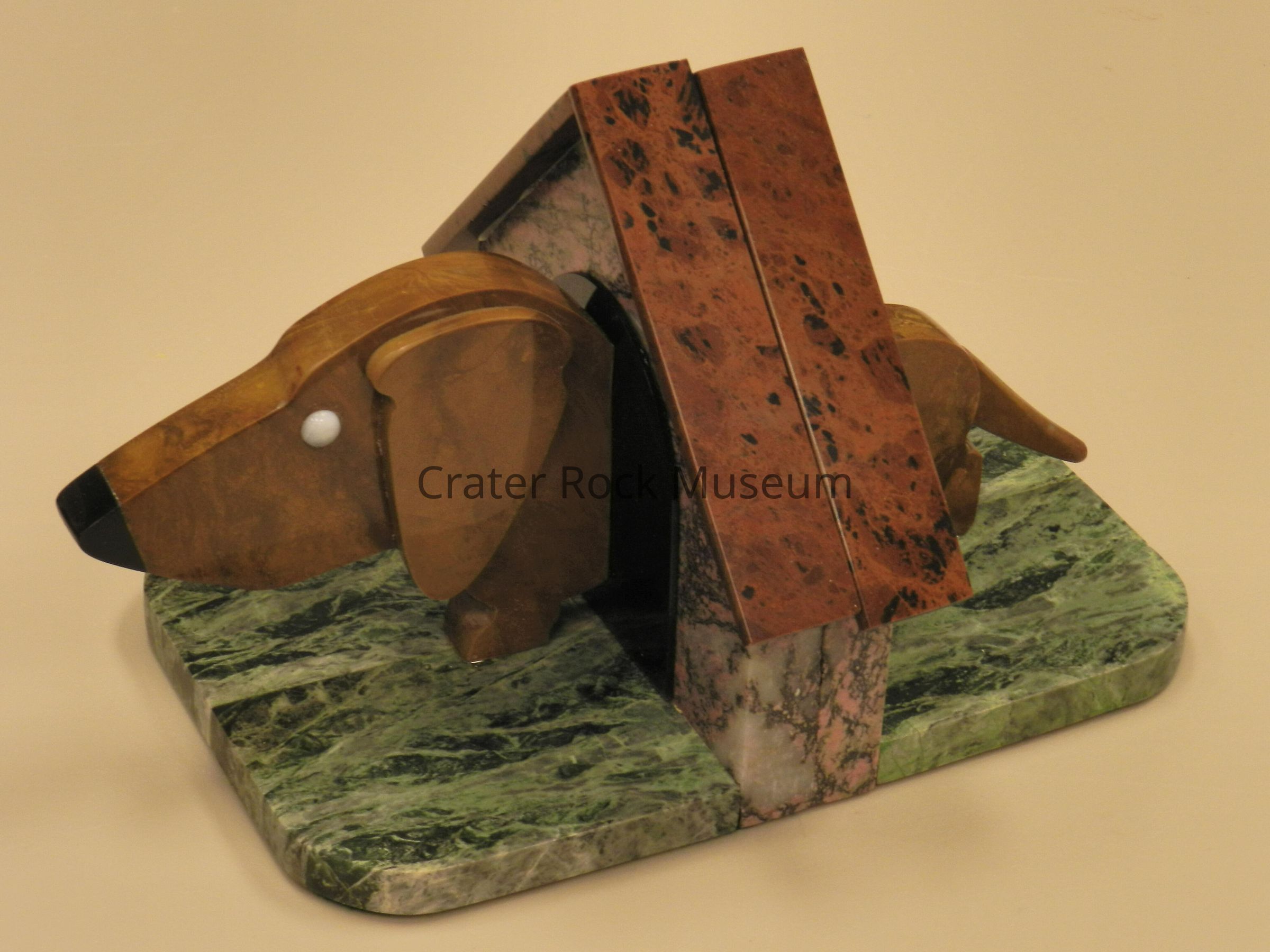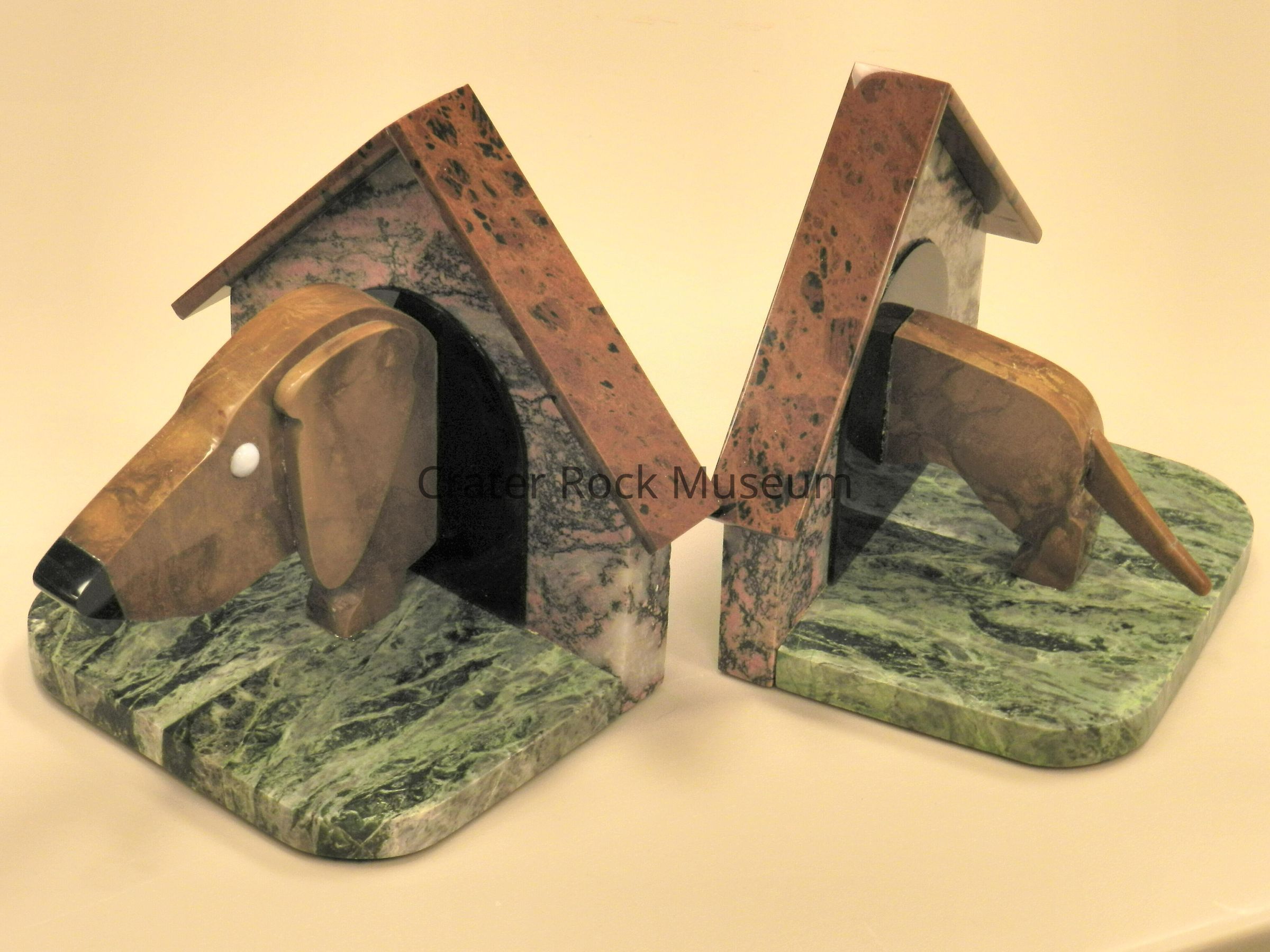 Daschund Bookends: Body is yellow-brown jasper. Nose is obsidian. Eyes are white agate. Roof of doghouse is mahogany obsidian, walls are pink-to-black rhodonite, and 'grass' is serpentine.Collection