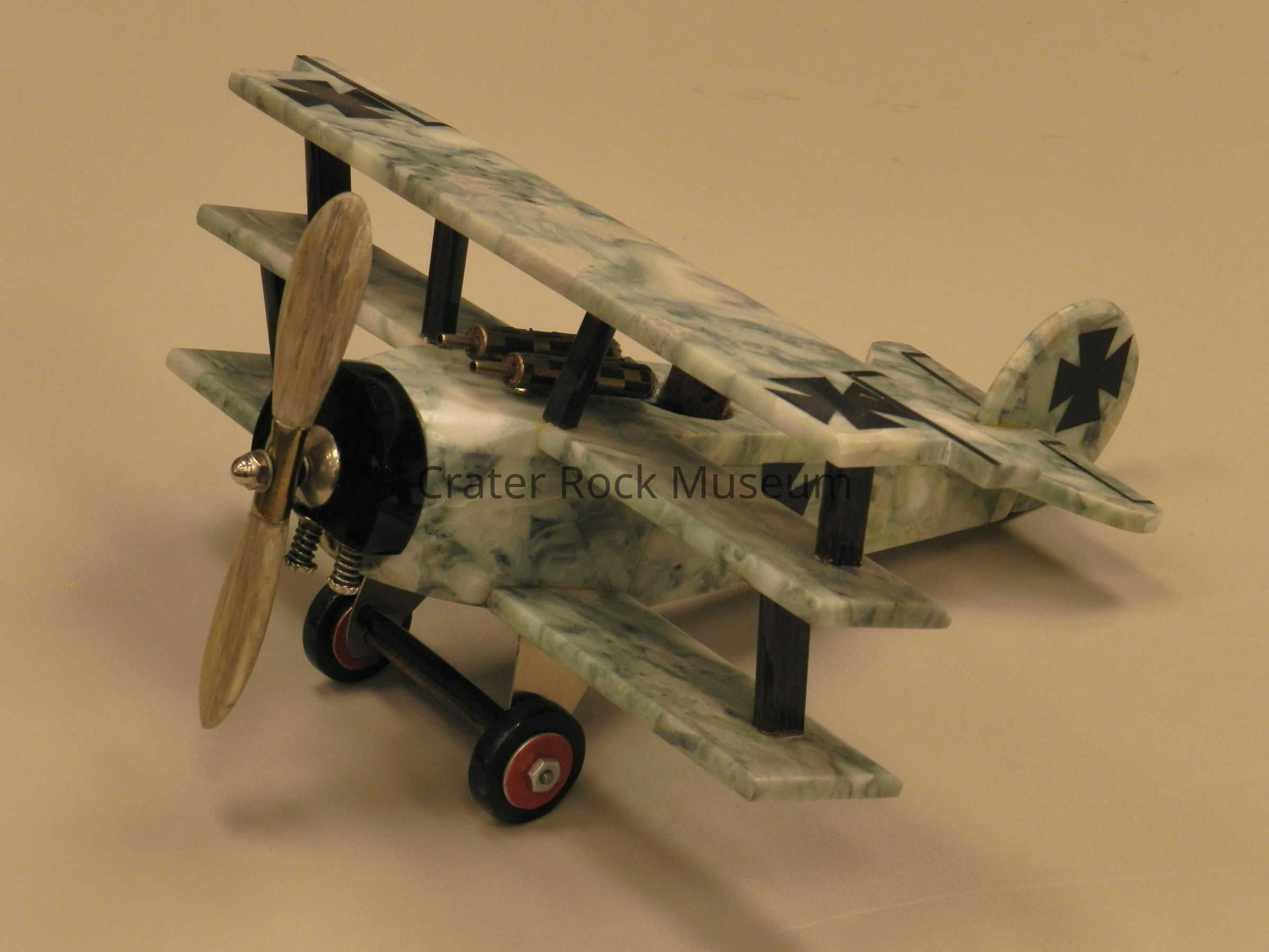 Fokker Tri-Plane: Most of the aircraft is light green, mottled jade. Engine cowling, between-wheel strut, and tires are obsidian. Between-wing braces and pilot's seat are mahogany obsidian. Propellor is petrified wood. Landing gear legs, machine guns, etc., are metal. German 'cross' decals are on wings, tail, and fuselage. As received, top wing was detached and was re-glued.Collection