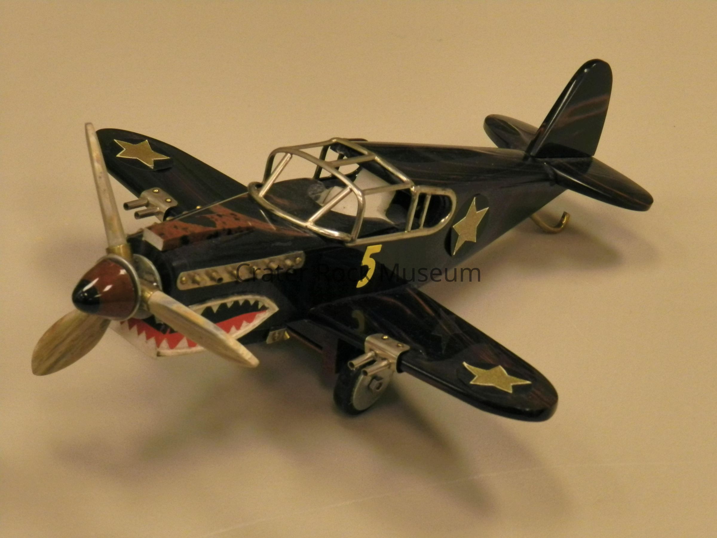P-40 "Flying Tiger": Most of aircraft is mahogany & tri-flow obsidian. Pilot's seat is onyx. Tires are obsidian. Propellor is petrified wood. There is varied metal trim. Star-on-circle decals are on the wings and fuselage. American Volunteer Group (AVG) 'sharks teeth' decal is on cowling. The number "5" is below the cockpit.Collection