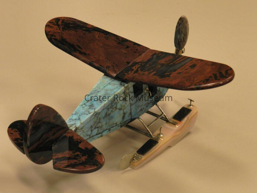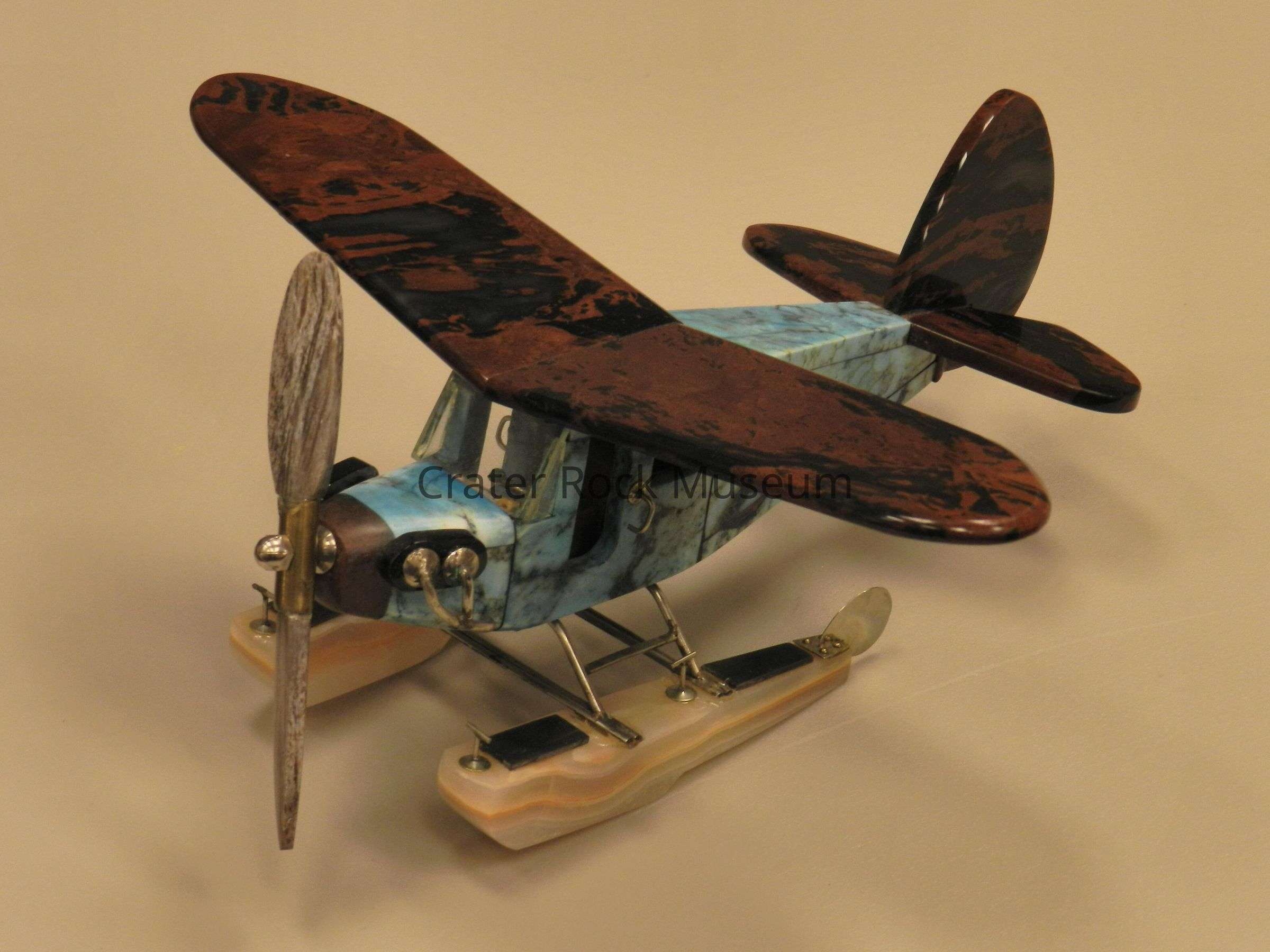 Float Plane: Wings and tailplane are mahogany obsidian. Fuselage is dyed howlite (light blue). Floats are of onyx. Propellor is petrified wood. There is varied metal trim.Collection