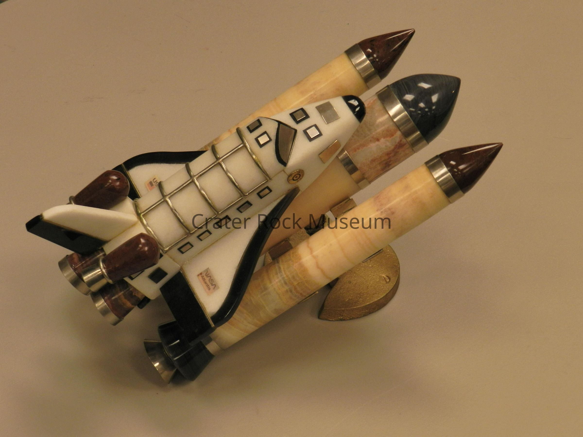 Space Shuttle "Stack": Stack is orbiter, tank, and two solid boosters on stand. Orbiter is white onyx with nose cap, wing leading edges, and control surfaces of obsidian. Auxilliary engines are mahogany obsidian. Orbiter "main engines" (which the real US orbiter did not have - Soviet 'Buran' orbiter did) are of banded onyx. Tank and booster bodies are onyx, with tank nose cap of obsidian and booster nose caps of mahogany obsidian. Booster nozzle bells are tri-flow obsidian. There is varied metal trim. As received, tank and booster had detached from stand and were re-glued.Collection