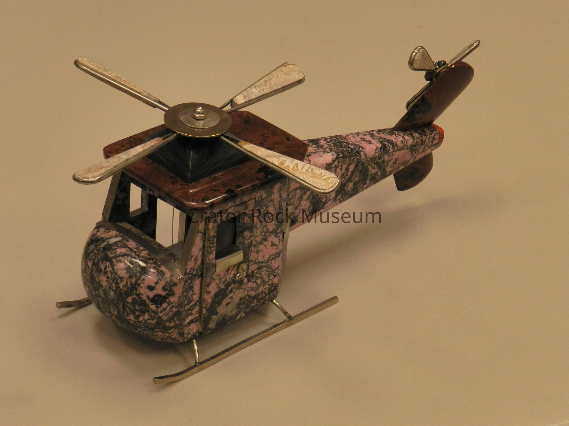 Helicopter: Body is pink and dark-gray rhodonite. Roof and stabilizer is mahogany obsidian. Main and tail rotor blades are plume agate. Obsidian motor mount. There is varied metal trim.Collection