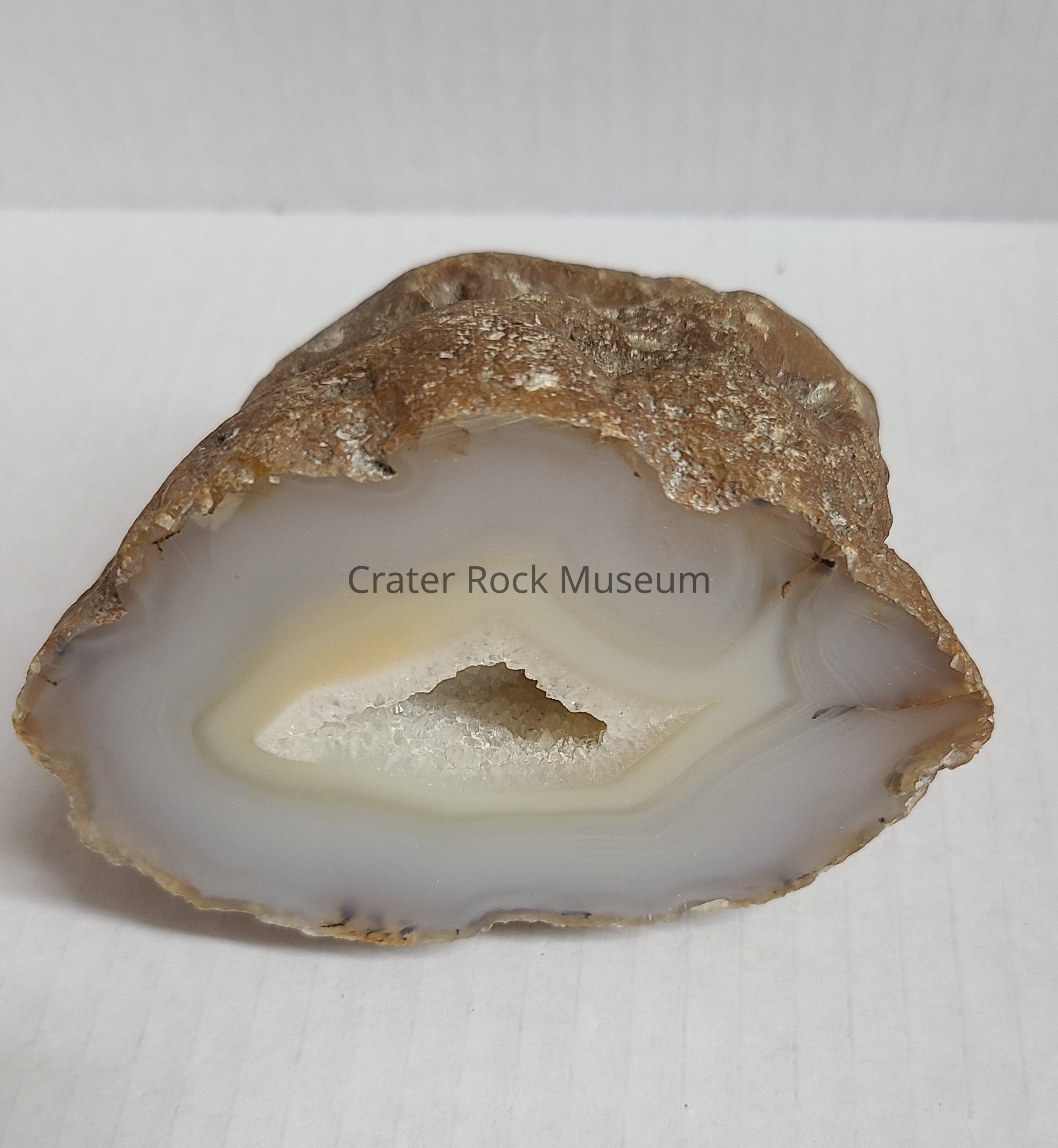 An Agate Nodule from Bear Creek, Jackson County, OR. Cut side shows an open Crystalline center in White with surrounding fortified Agate in Cream to Greys. Infiltration hole is present. A Brown crack extends from edge inward to edge of central zone.Dimensions