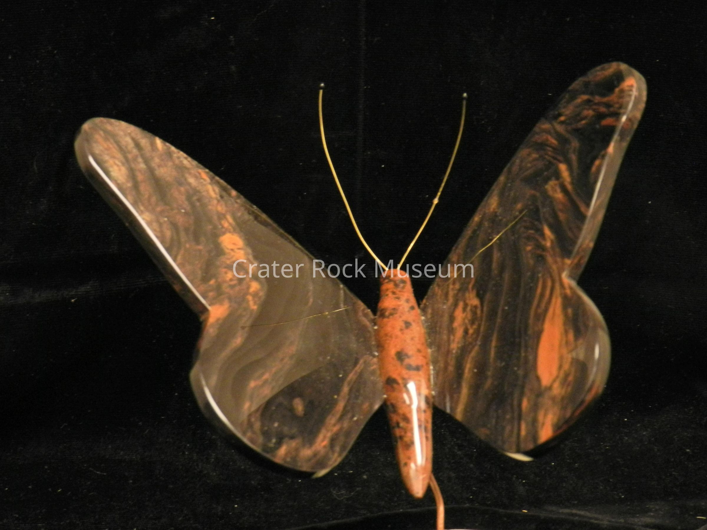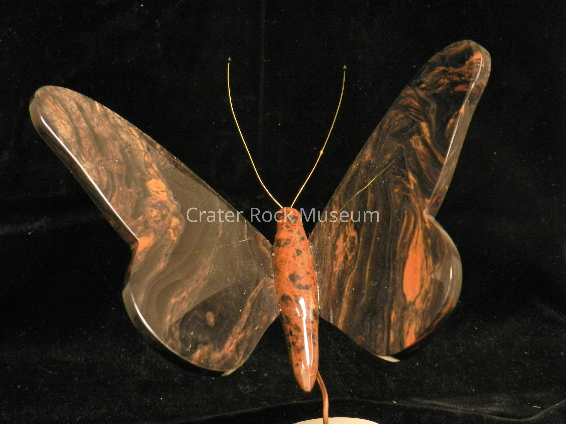 Butterfly (large): Body is mottled obsidian. Wings are streaked mahogany obsidian. Metal stand.Collection