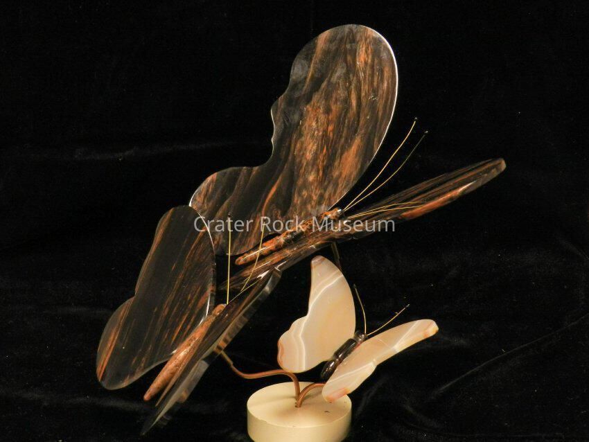 Butterfly Trio: (one large, one medium, one small) Large and medium butterfly bodies are mottled obsidian; wings are streaked mahogany obsidian. Small butterfly body is agate; wings are agate. Metal stand.Collection