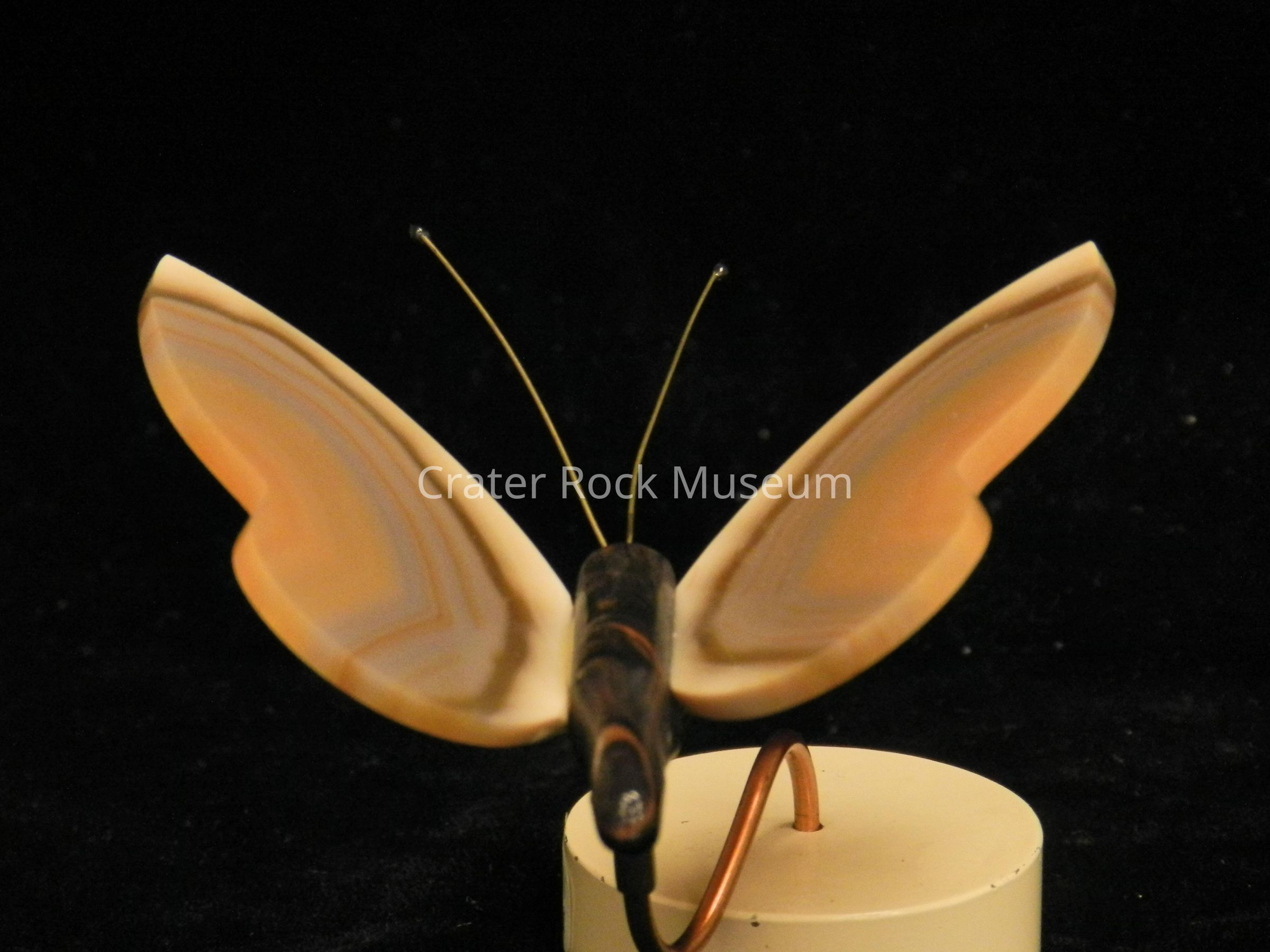 Butterfly (small): Body is mahogany obsidian. Wings are light yellow to brown, banded agate. Metal stand.Collection
