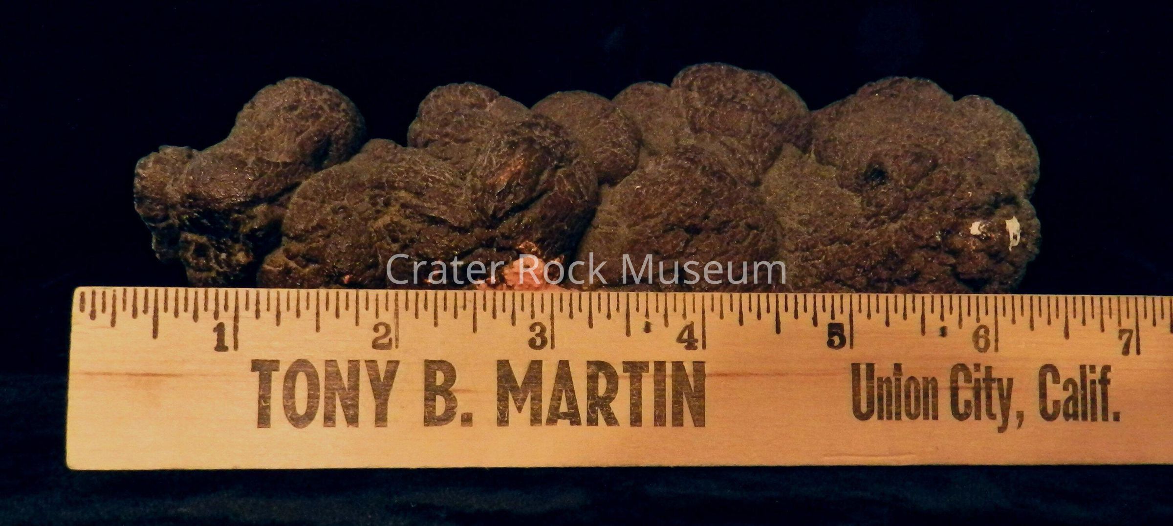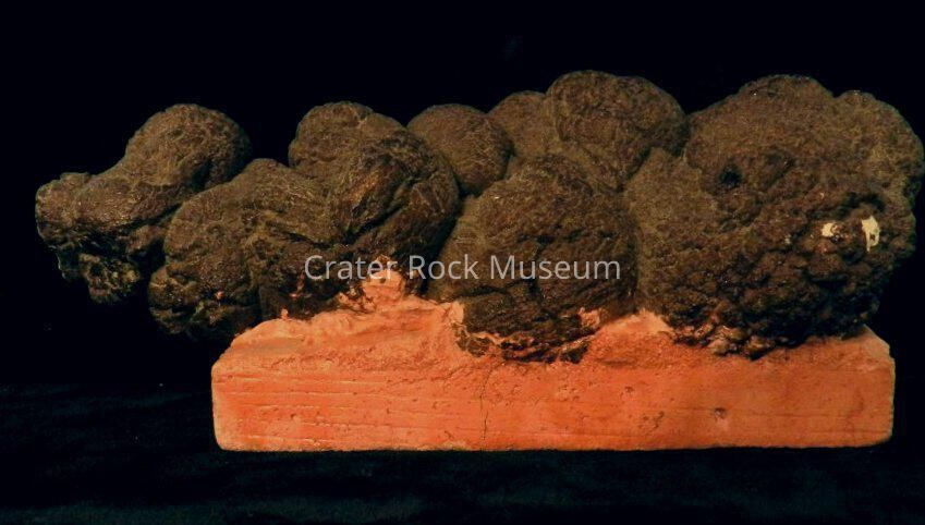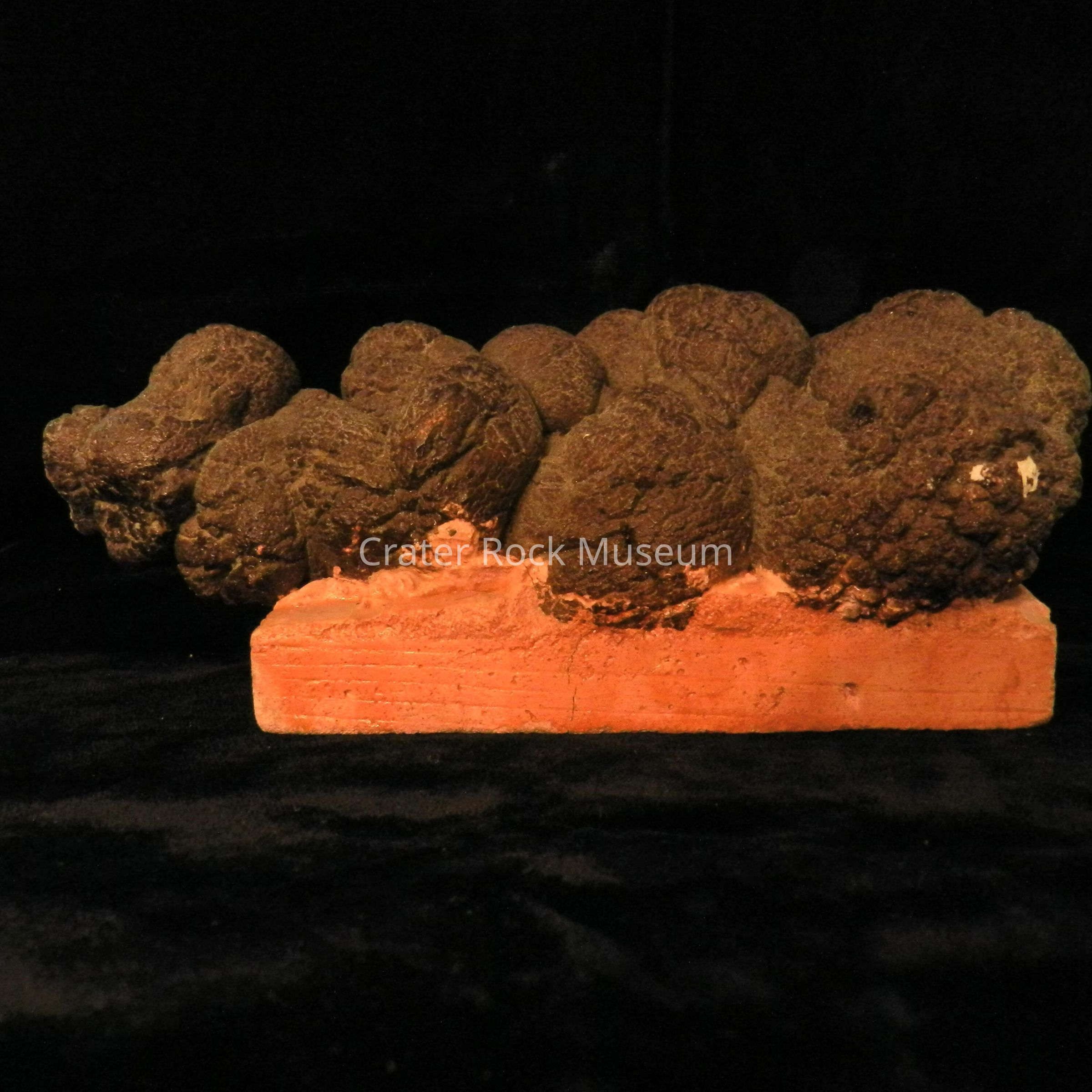 Description: Exuded texture. Mounted on cement-like slab. Dark brown-red color.