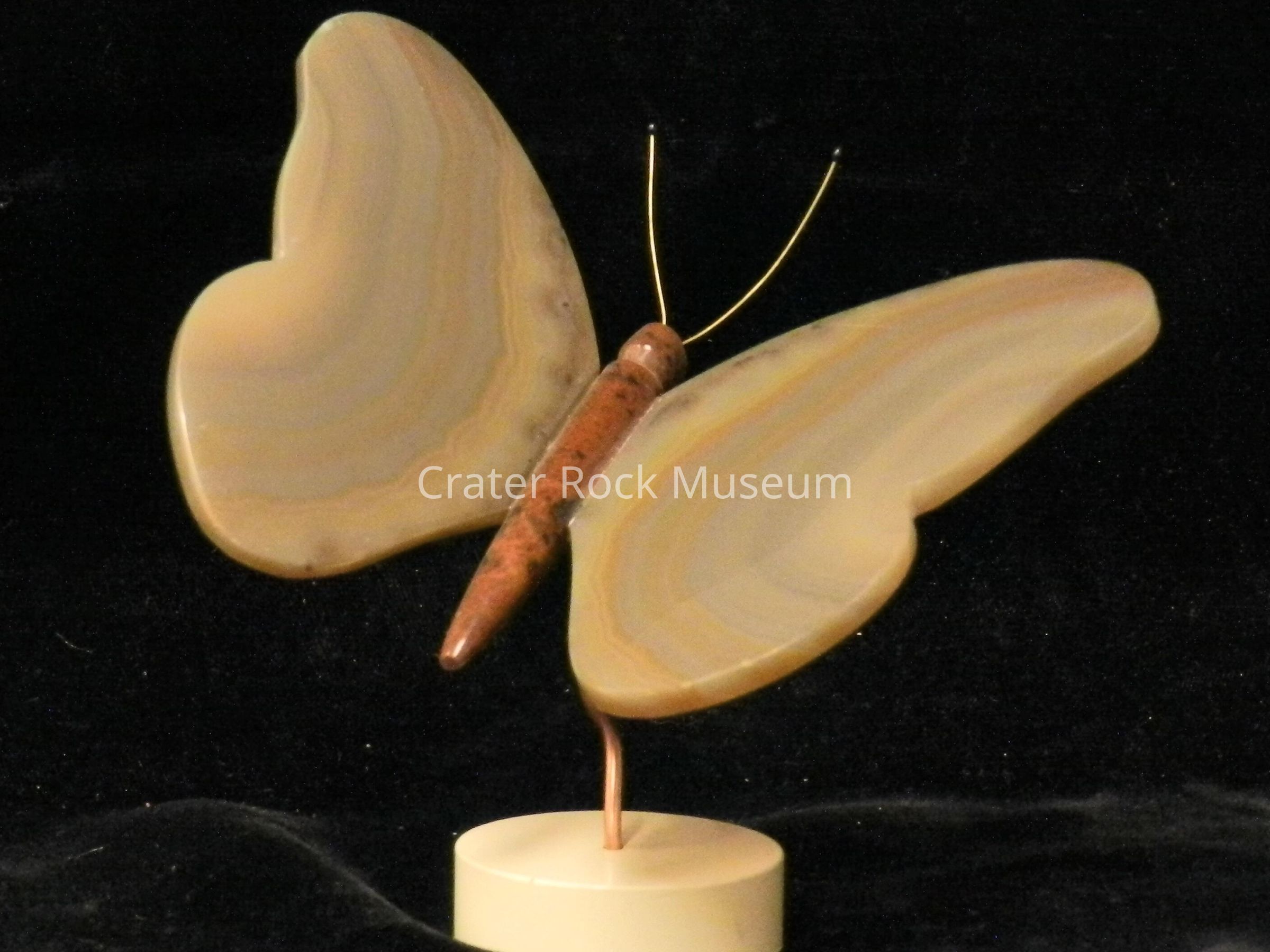 Butterfly (small): Body is golden sheen obsidian. Wings are tan-to-gray, banded agate. Metal stand.Collection