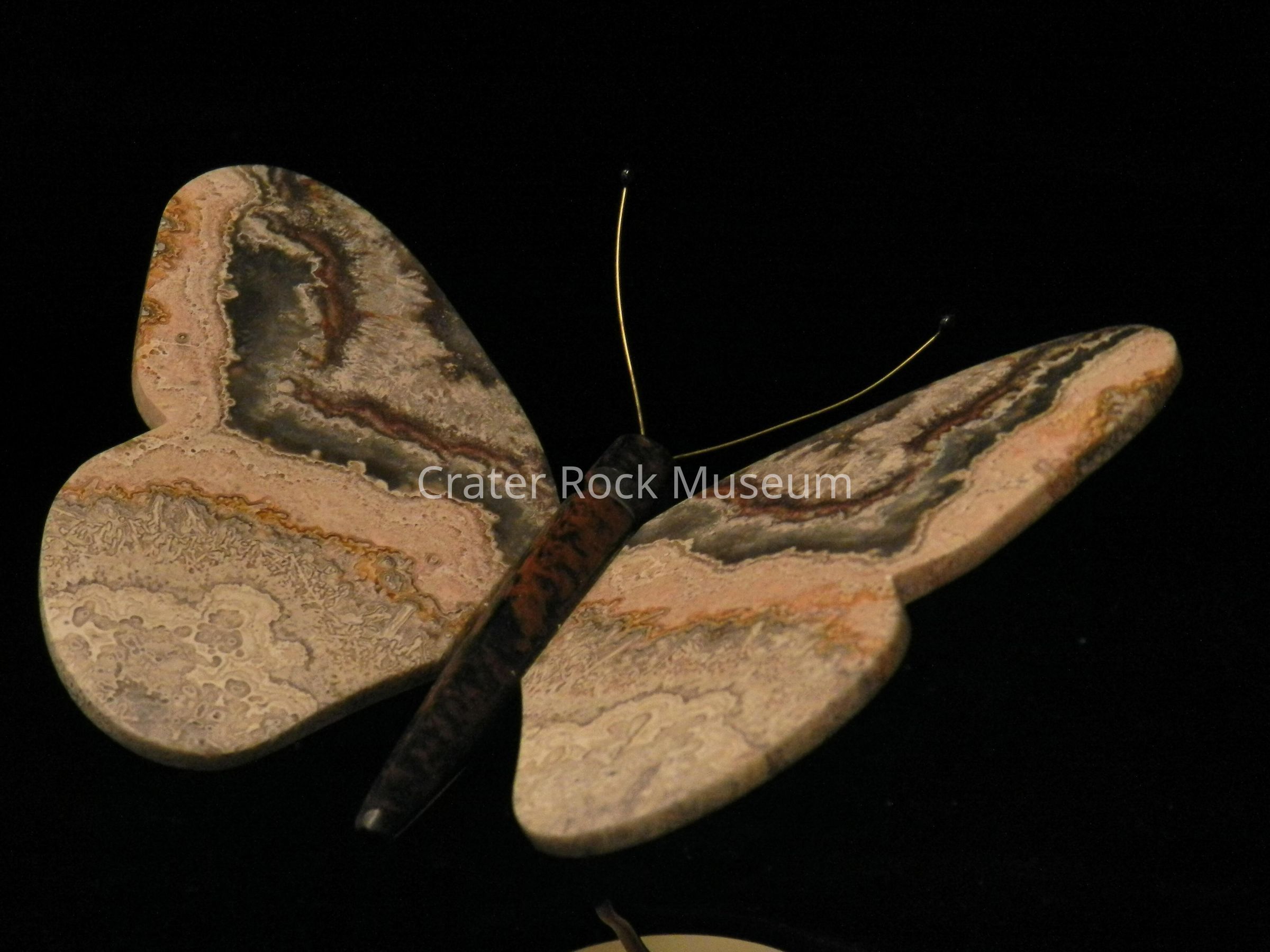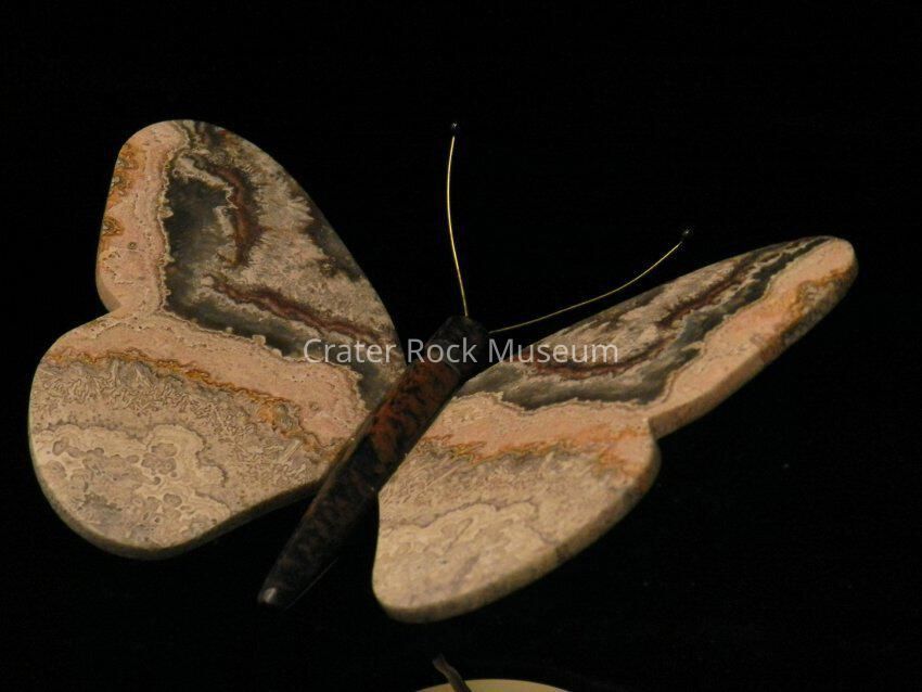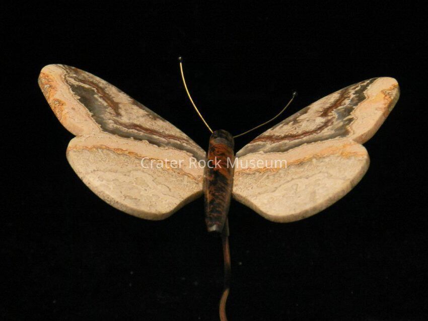 Butterfly (small): Body is golden sheen obsidian. Wings are crazy lace agate. Metal stand.Collection