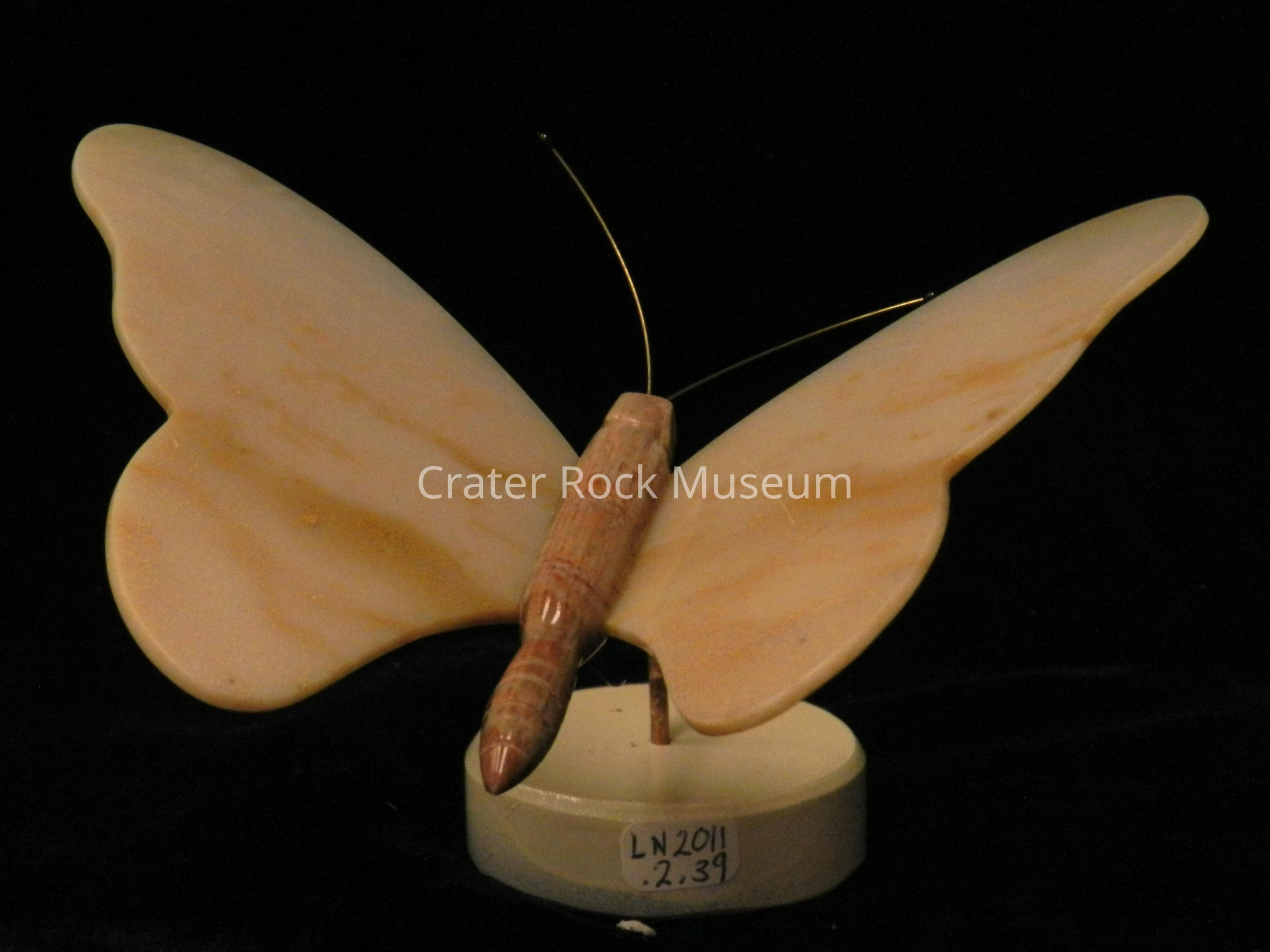 Butterfly (small): Body is Mexican agate. Wings are creamy-white to tan, banded agate. Metal stand.Collection