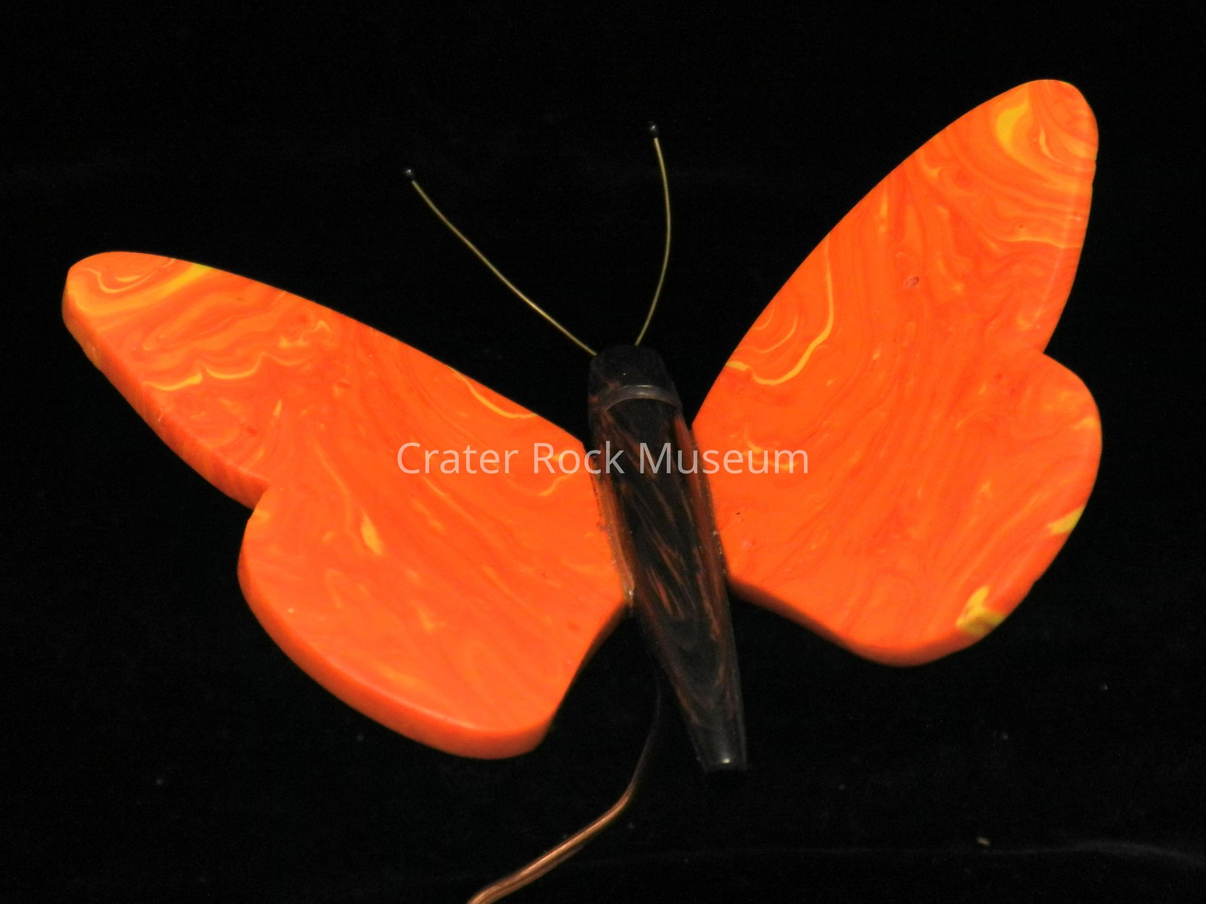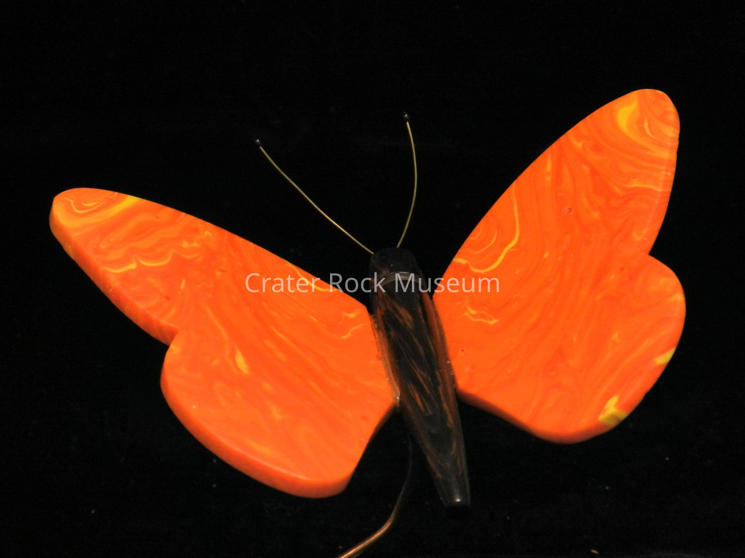 Butterfly (small): Body is golden sheen obsidian. Wings are yellow-to-orange 'slag glass'. Metal stand.Collection