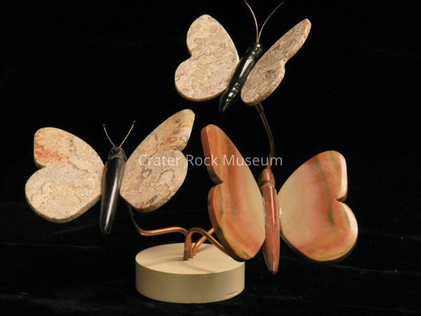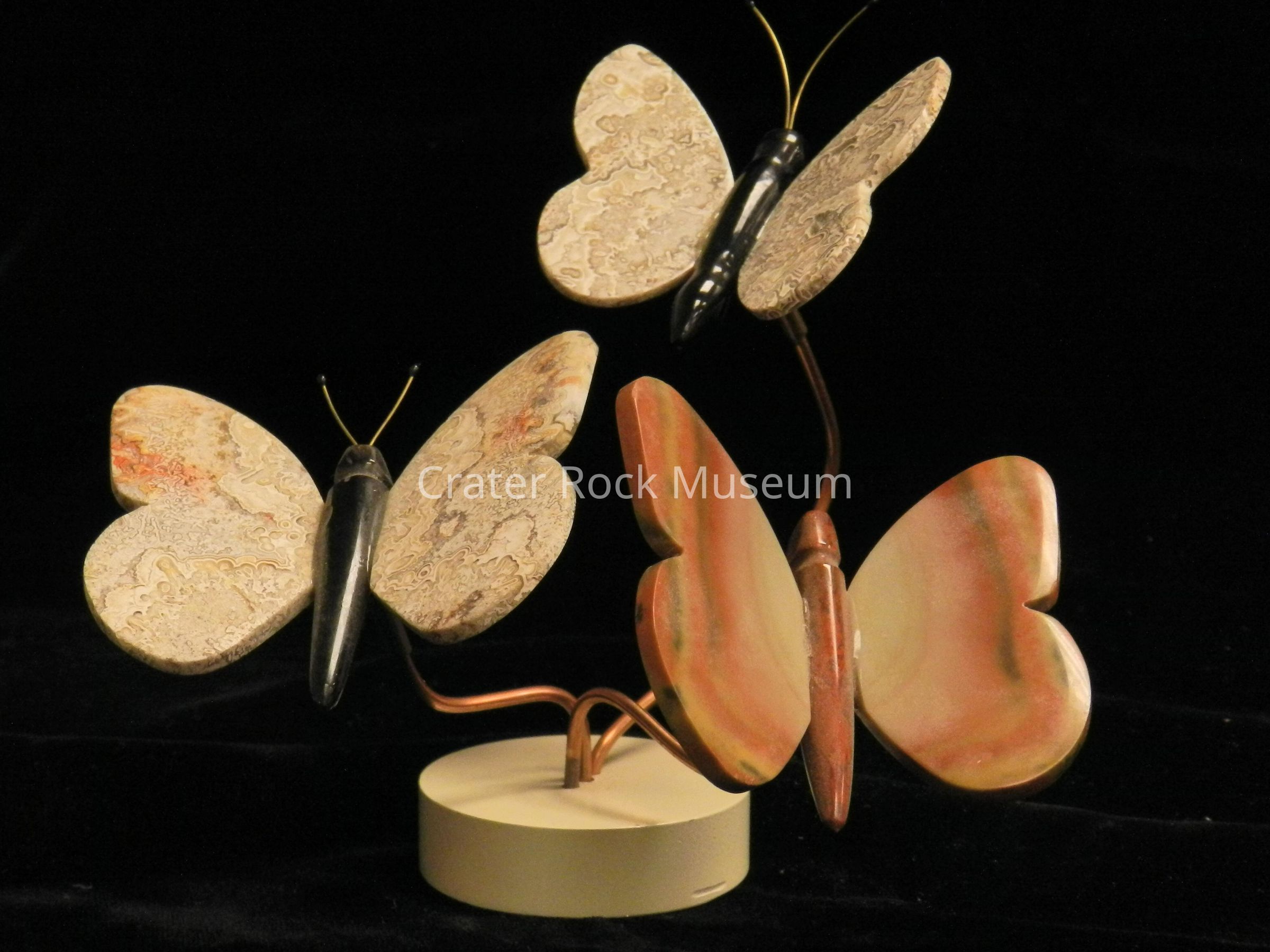 Butterfly Trio: (all small) Two butterflies have obsidian bodies and crazy lace agate wings. One butterfly has reddish-purple jasper body and wings of off-white, reds, and yellow-greens banded agate. Metal stand.Collection