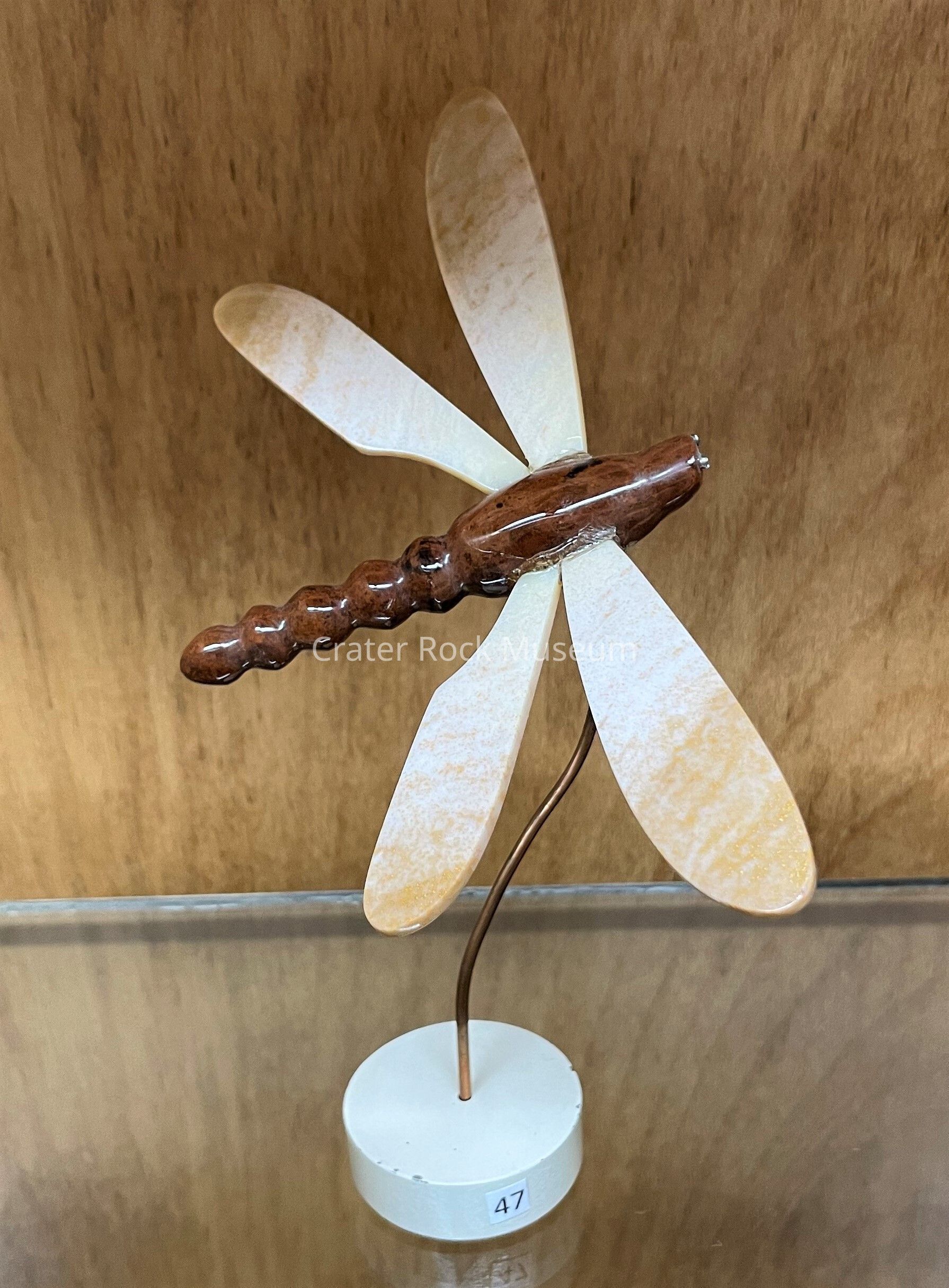 Dragonfly: Body is golden sheen obsidian. Wings are white-to-tan agate. Metal stand.Collection