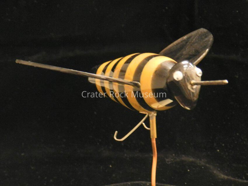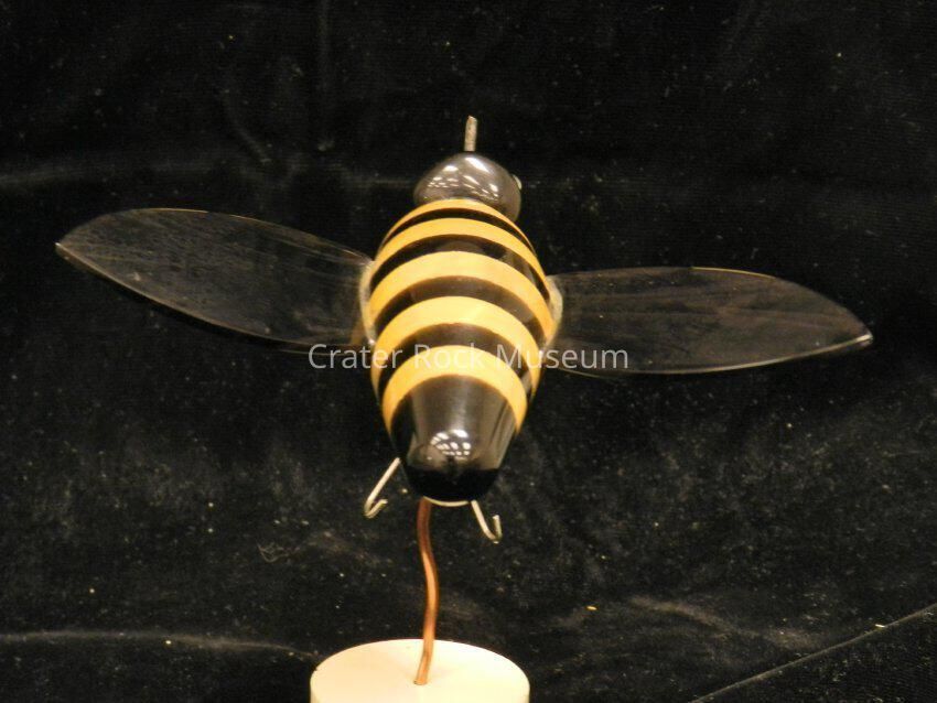 Bee (large): Body is alternating sections of obsidian and mustard-yellow jasper. Wings are clear-to-black, banded obsidian. Metal stand.Collection