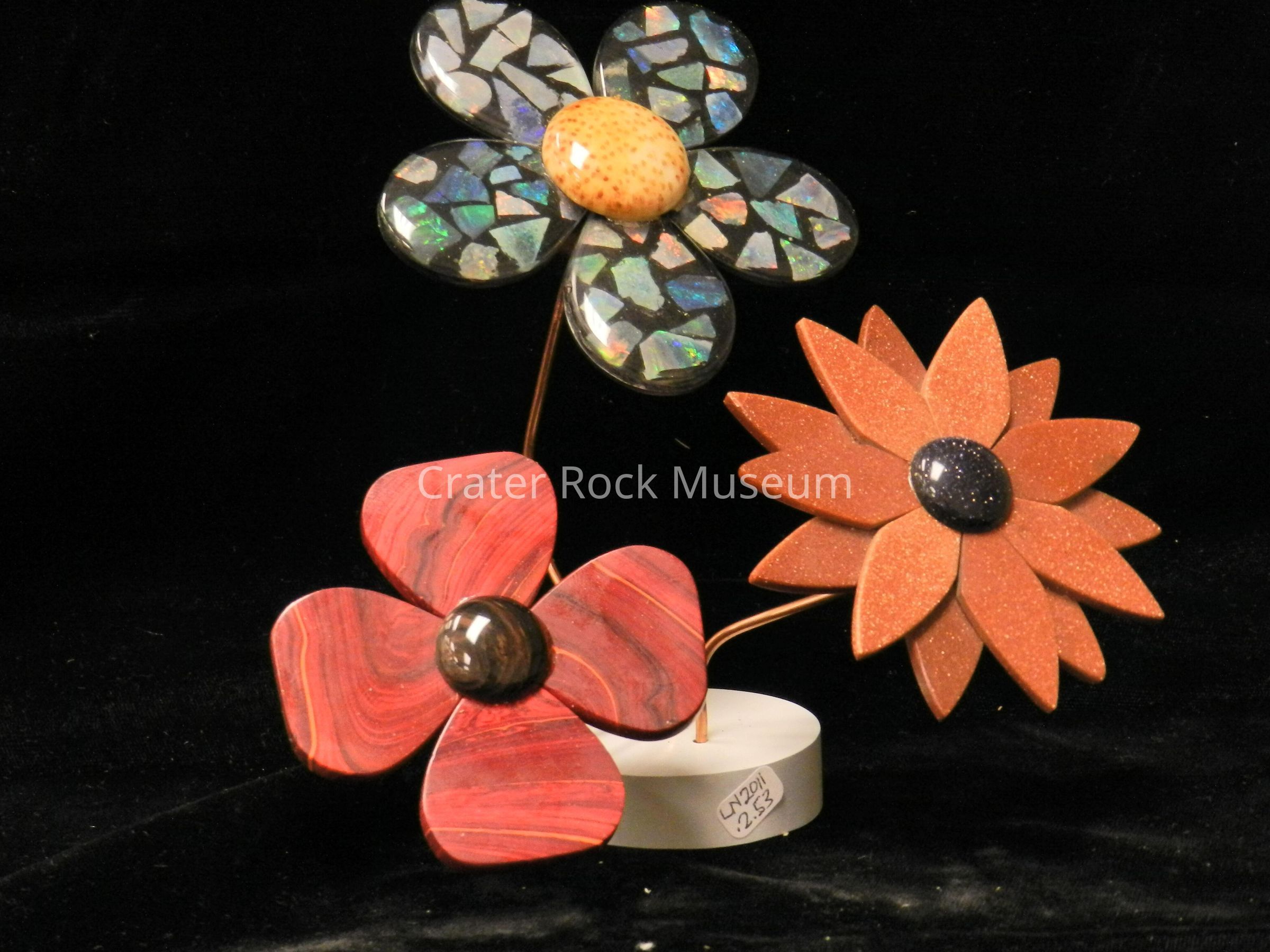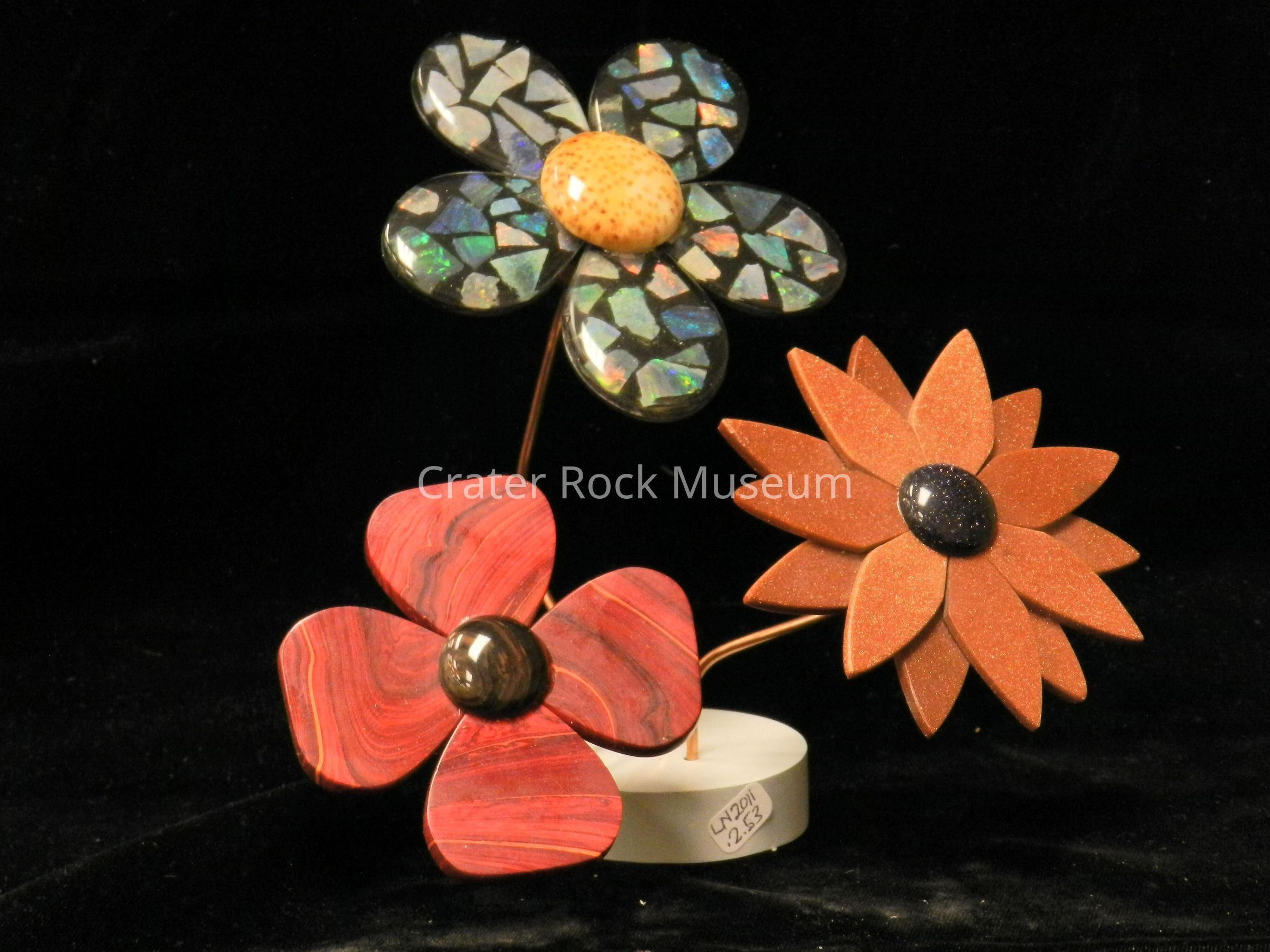 Flower Trio: Largest has petals made of fragments of opal embedded in clear resin with black obsidian backing; center is cream-colored with tan dots. Second has petals spray-painted with irridescent copper; center is black plastic. Third has petals of 'slag glass' in shades of red; center is golden sheen obsidian. Metal stand.Collection