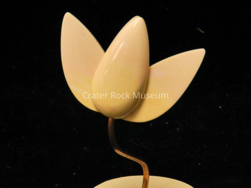 Flower (small): Side-view of flower made up of four petals. Petals are creamy white to light green onyx. Metal stand.Collection
