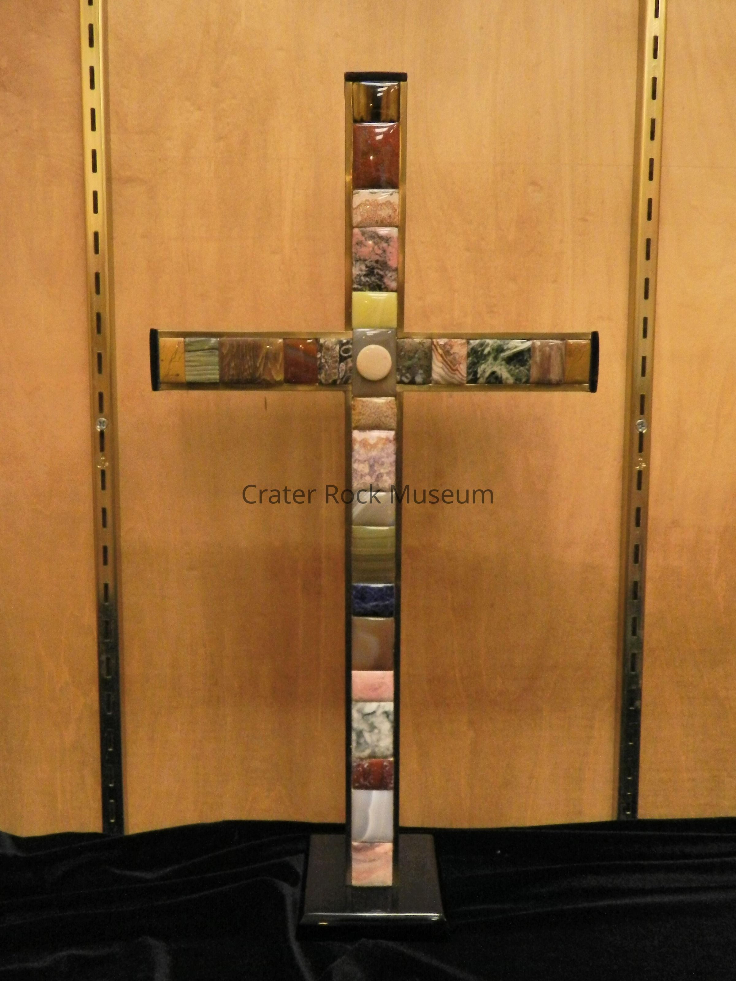 Cross (large): Approximately 27 varied stones laminated to front of wooden cross. Golden sheen obsidian end caps. Obsidian base.Collection