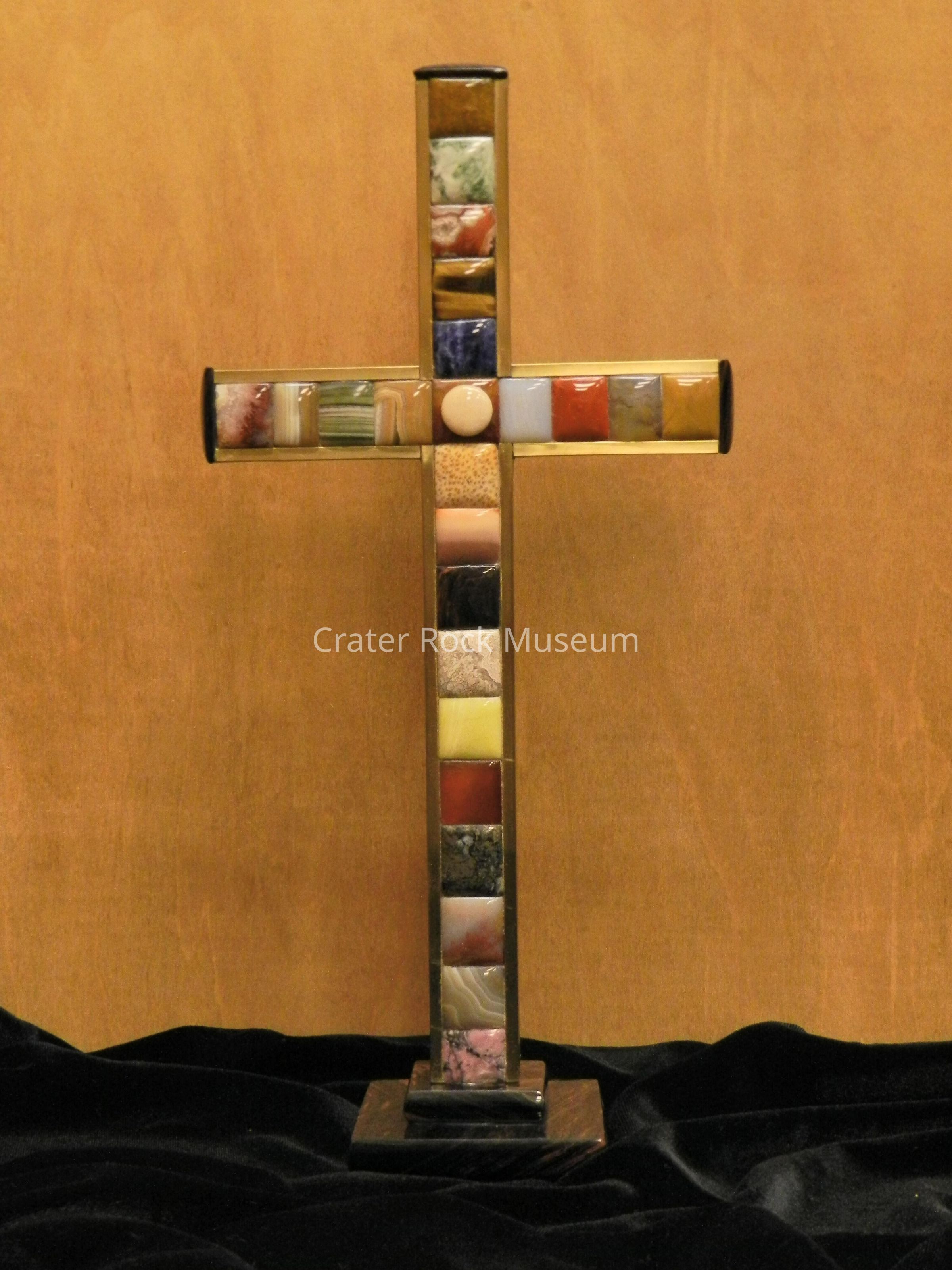 Cross (small): (number 1 of 2) Approximately 24 varied stones laminated to front of wooden cross. Golden sheen obsidian used for end caps and base.Collection