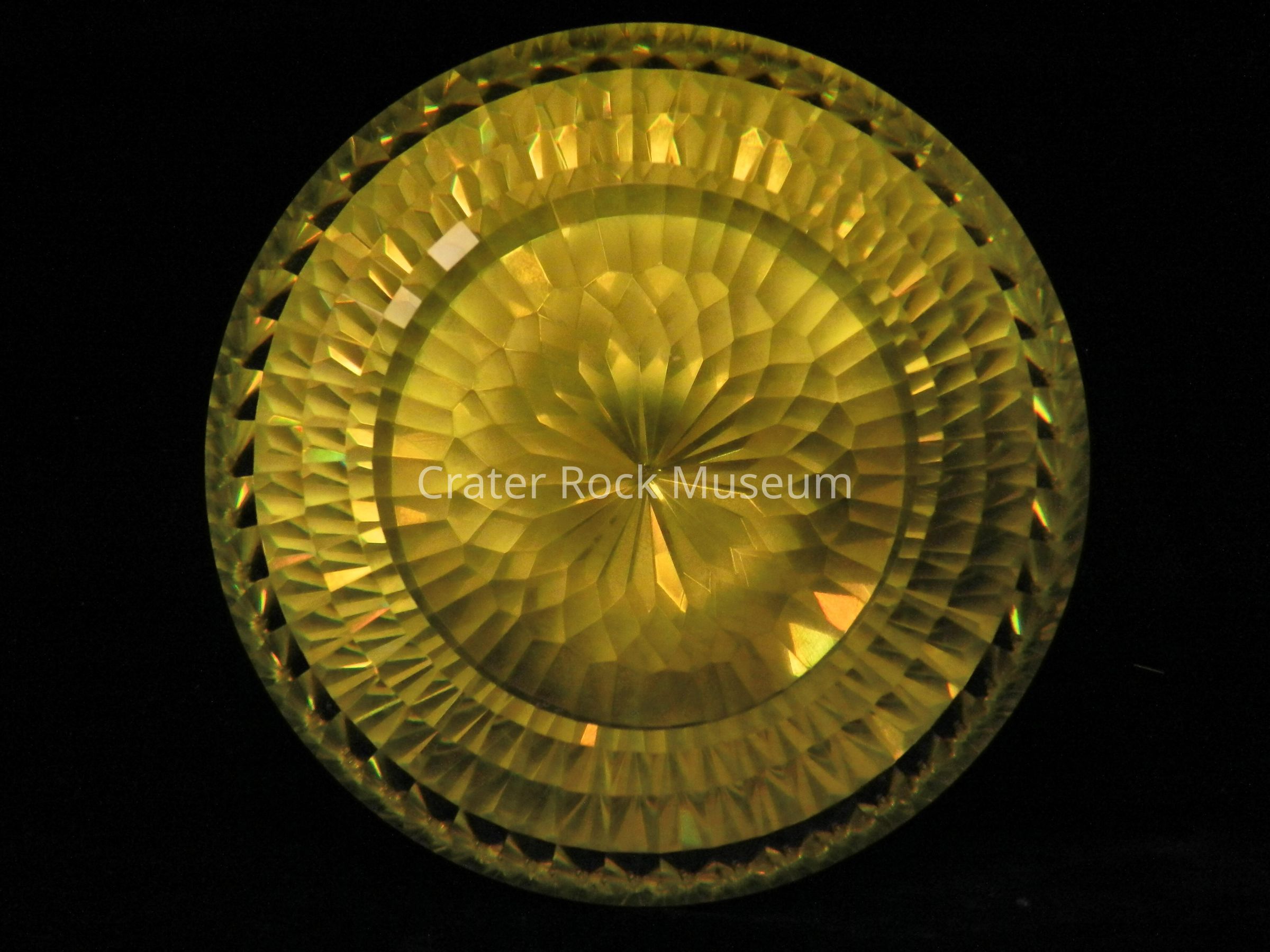Crystal (large, yellow): Synthetic glass (SynG) cut in "Scotch Cut". Yellow. Circular face.Collection