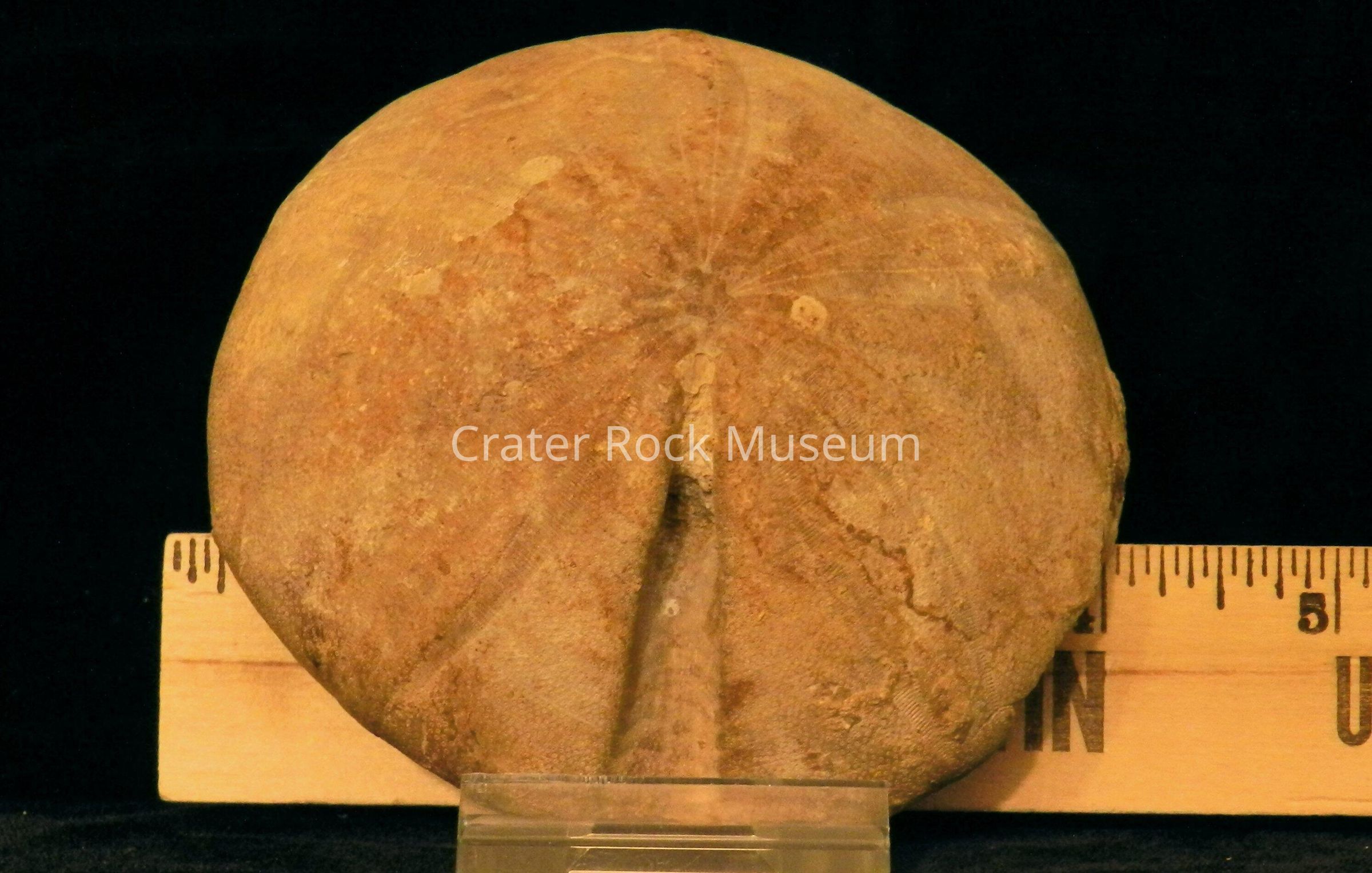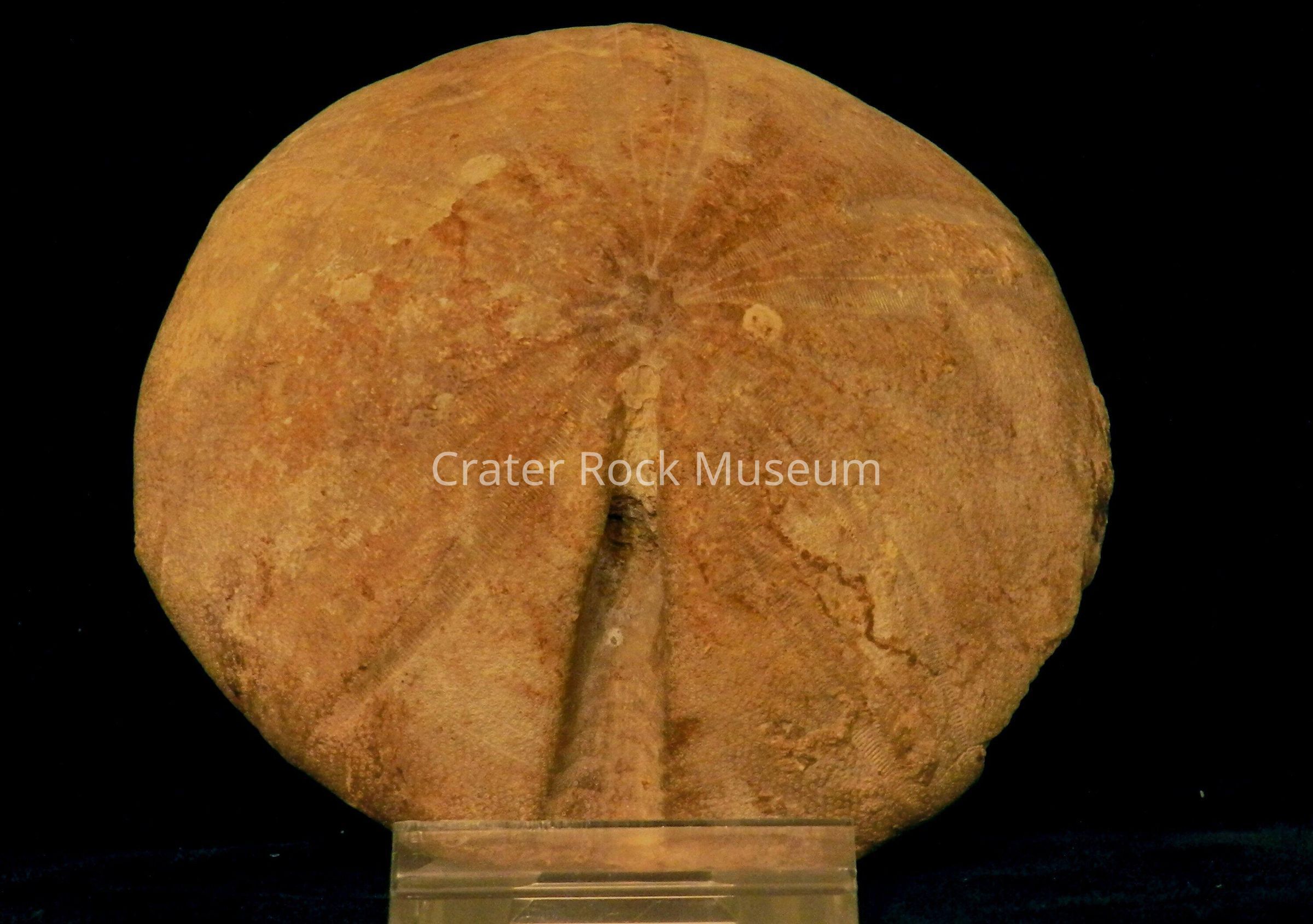 Description: One irregular echinoid with a petaloid ambulacral area and bilateral symmetry, showing the characteristic five-star pattern on shell with an oblong indentation in the shell. Color is light orange to beige.