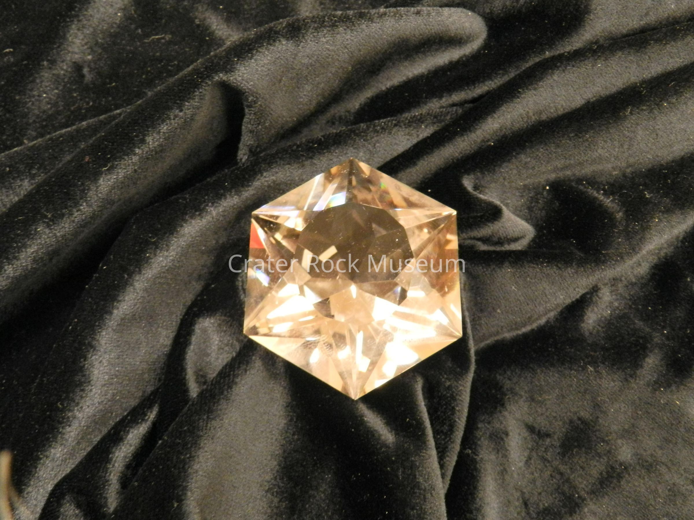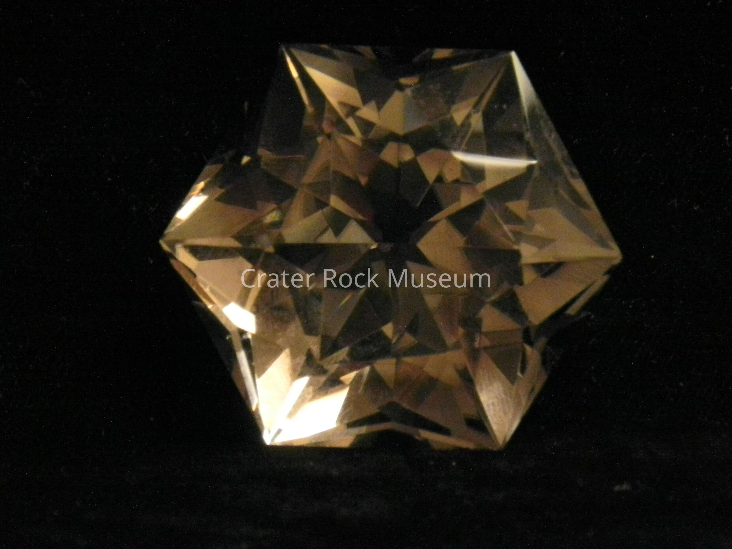 Crystal (small, tan): Smokey quartz cut in "Trophy Cut". Light tan. 218 cts. 67 facets. Hexagonal face.Collection