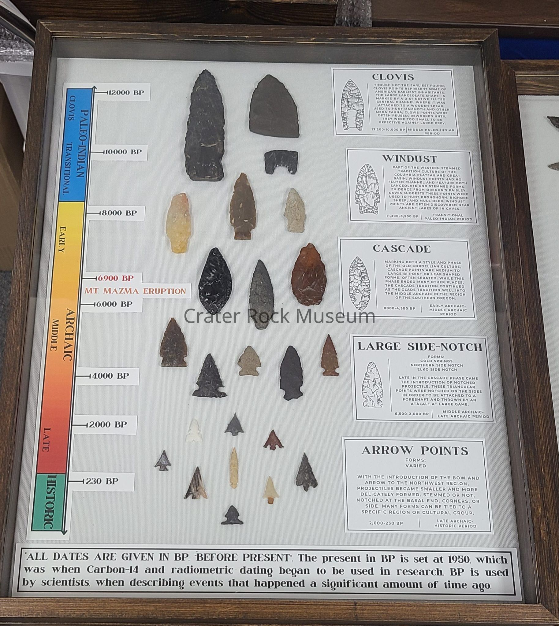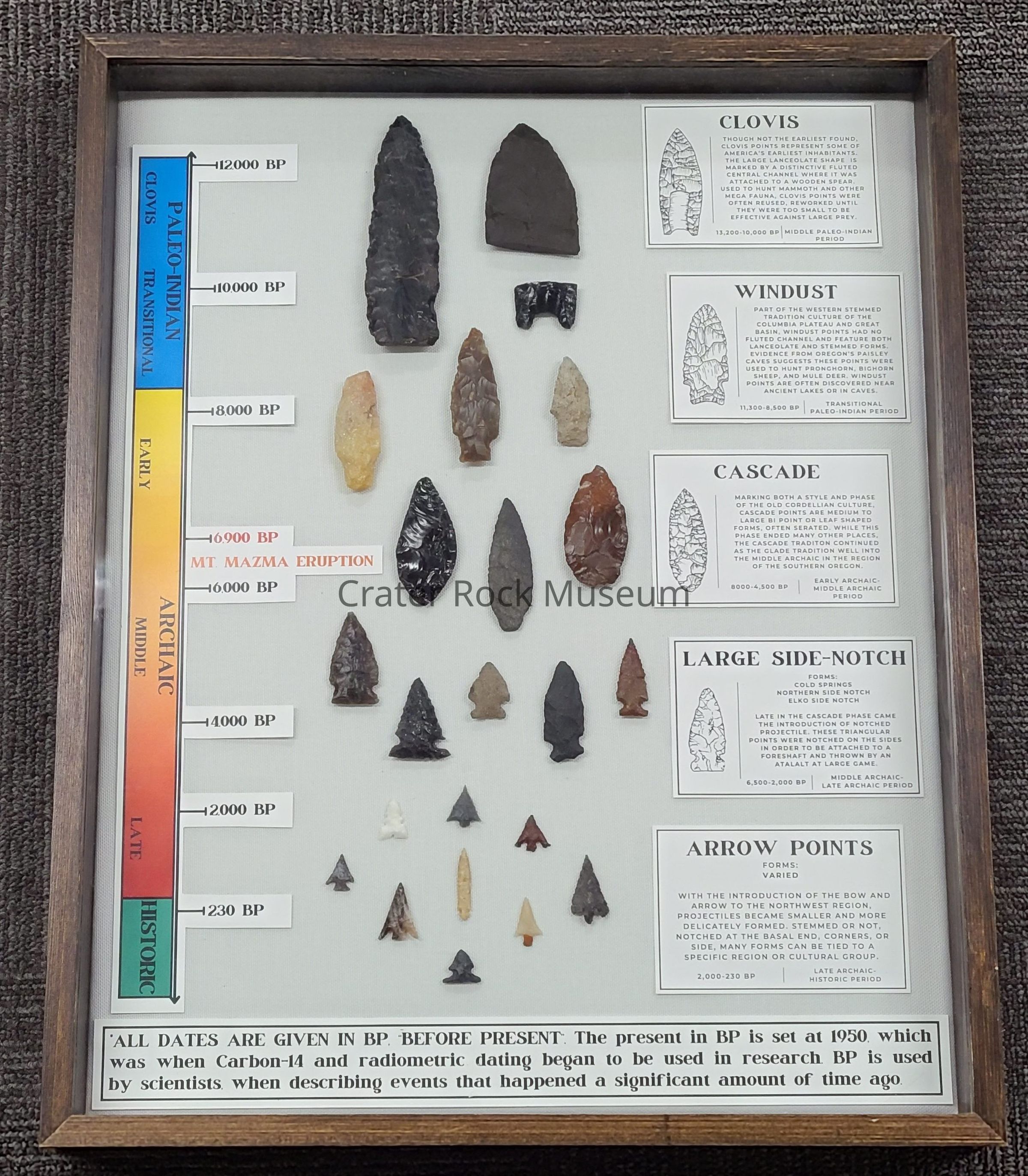 A collection of 23 projectile points in a shadow box representing the changing forms throughout the era, assembled as part of the 2024 Oregon Heritage Grant
