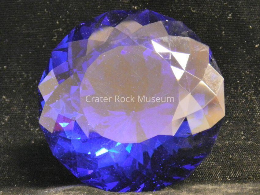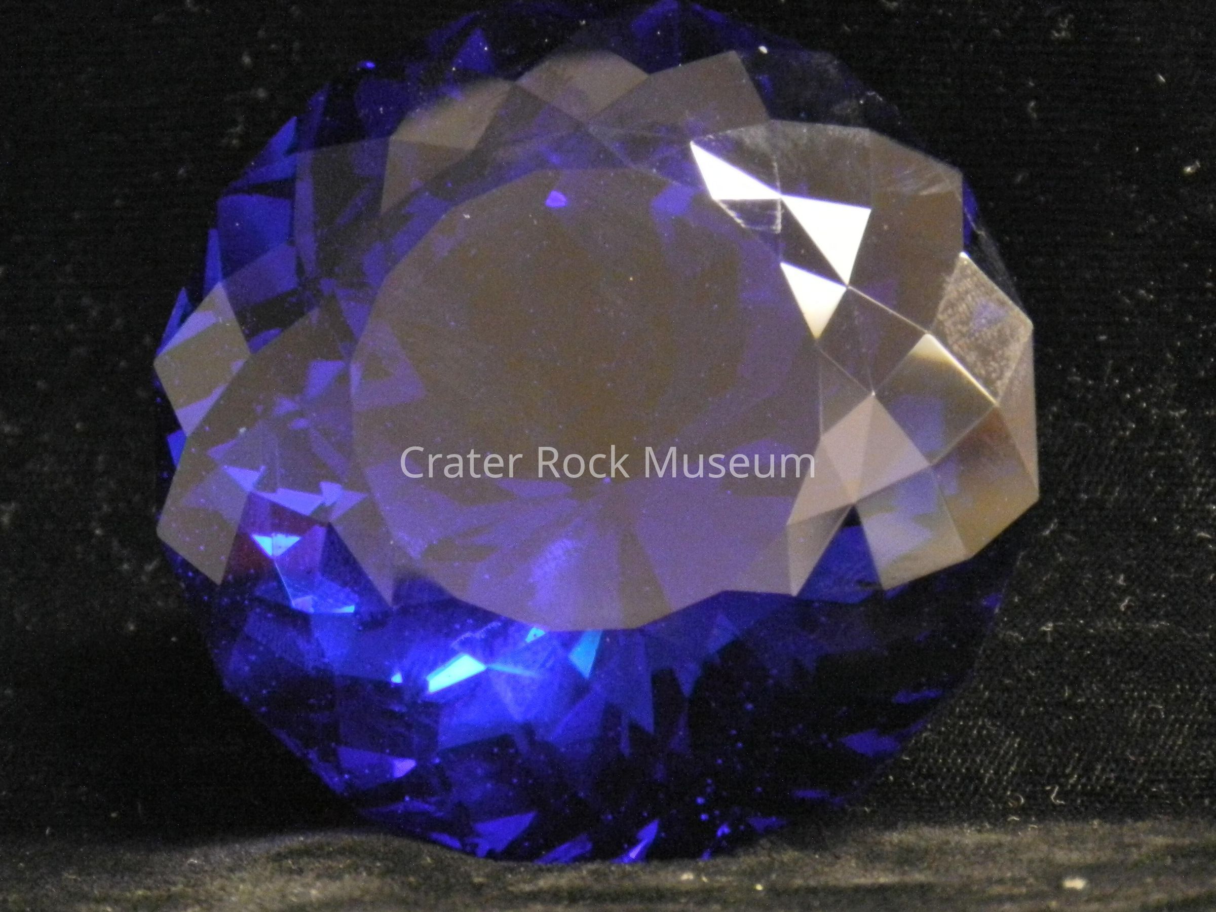 Crystal (medium, dark blue): Synthetic glass (SynG) cut in "Portuguese Cut". Dark blue. 807 cts. 209 facets. Circular face.Collection