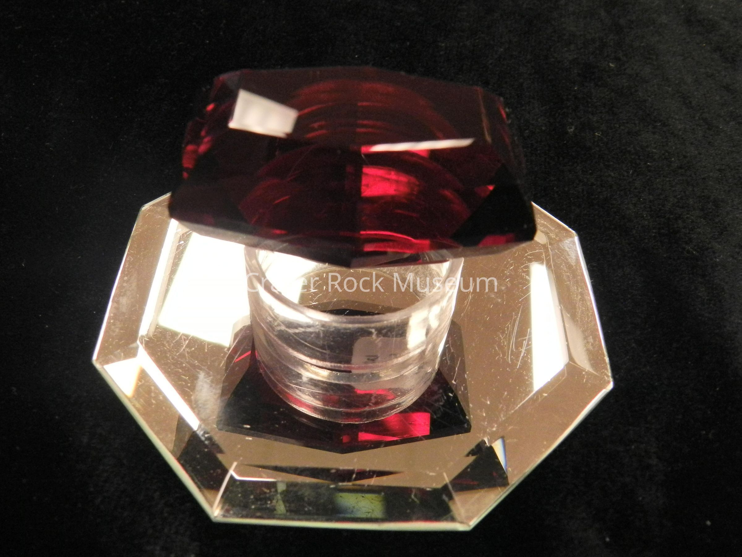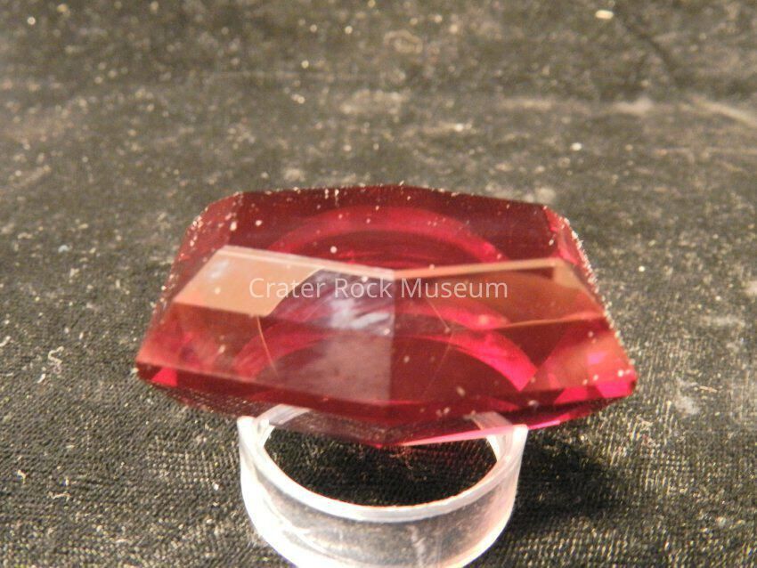 Crystal (small,red): Synthetic glass (SynG) cut in "Oblong Hex Cut". Deep red. 245 cts. 43 facets. Oblong hexagon face.Collection