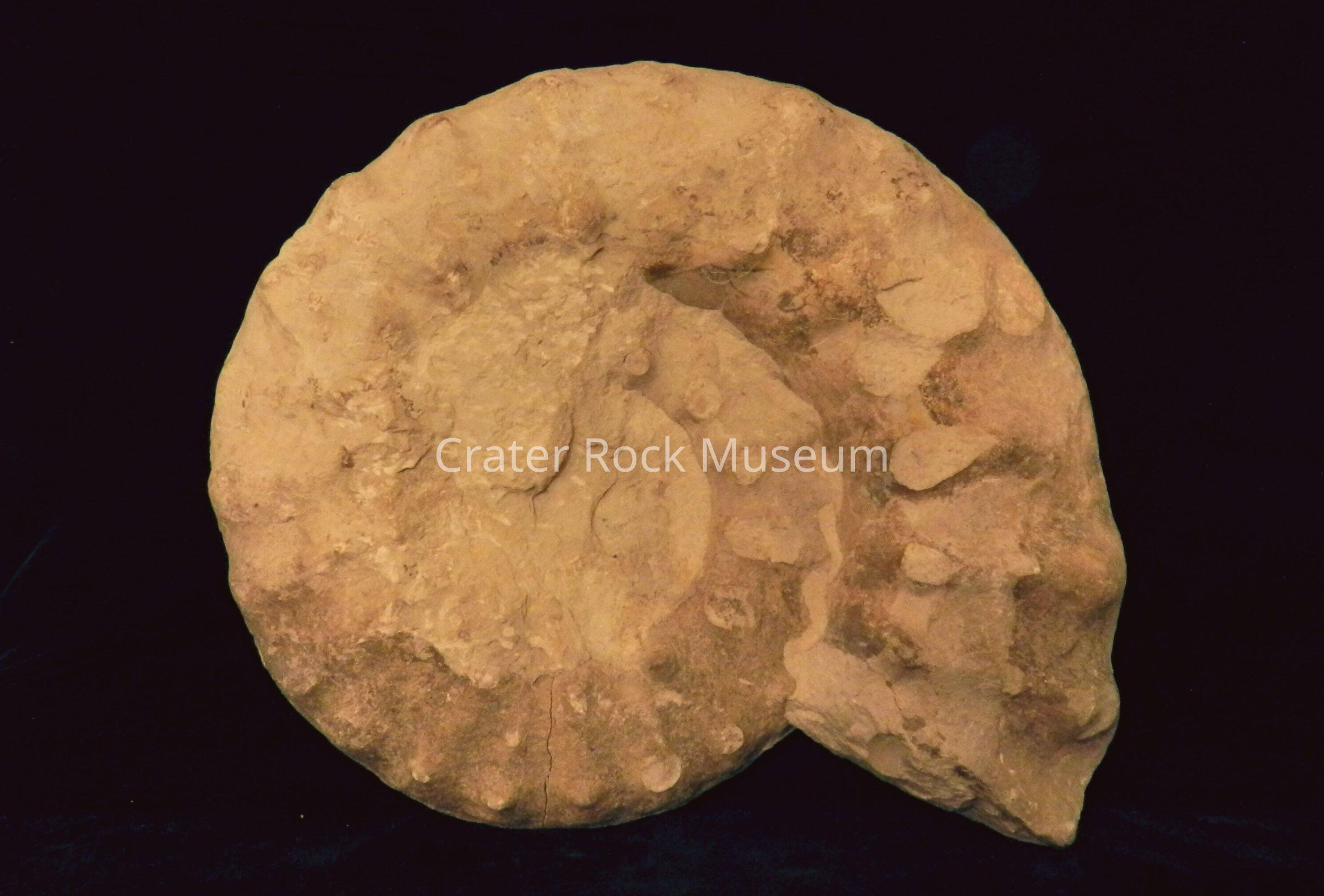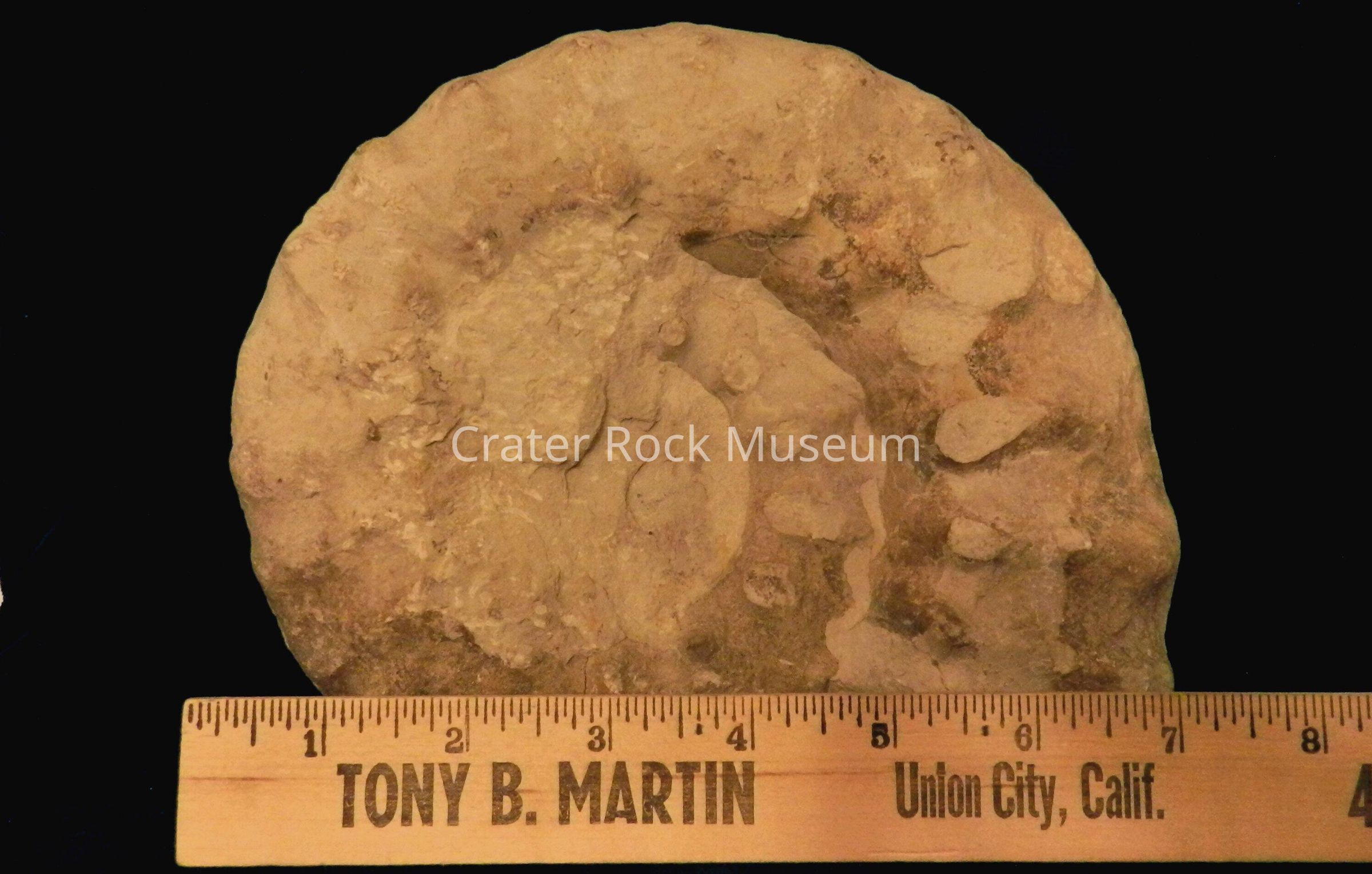 Description: One cast of an ammonite. Tightly coiled and has ridges. Color is light beige to pale green.