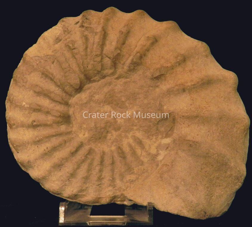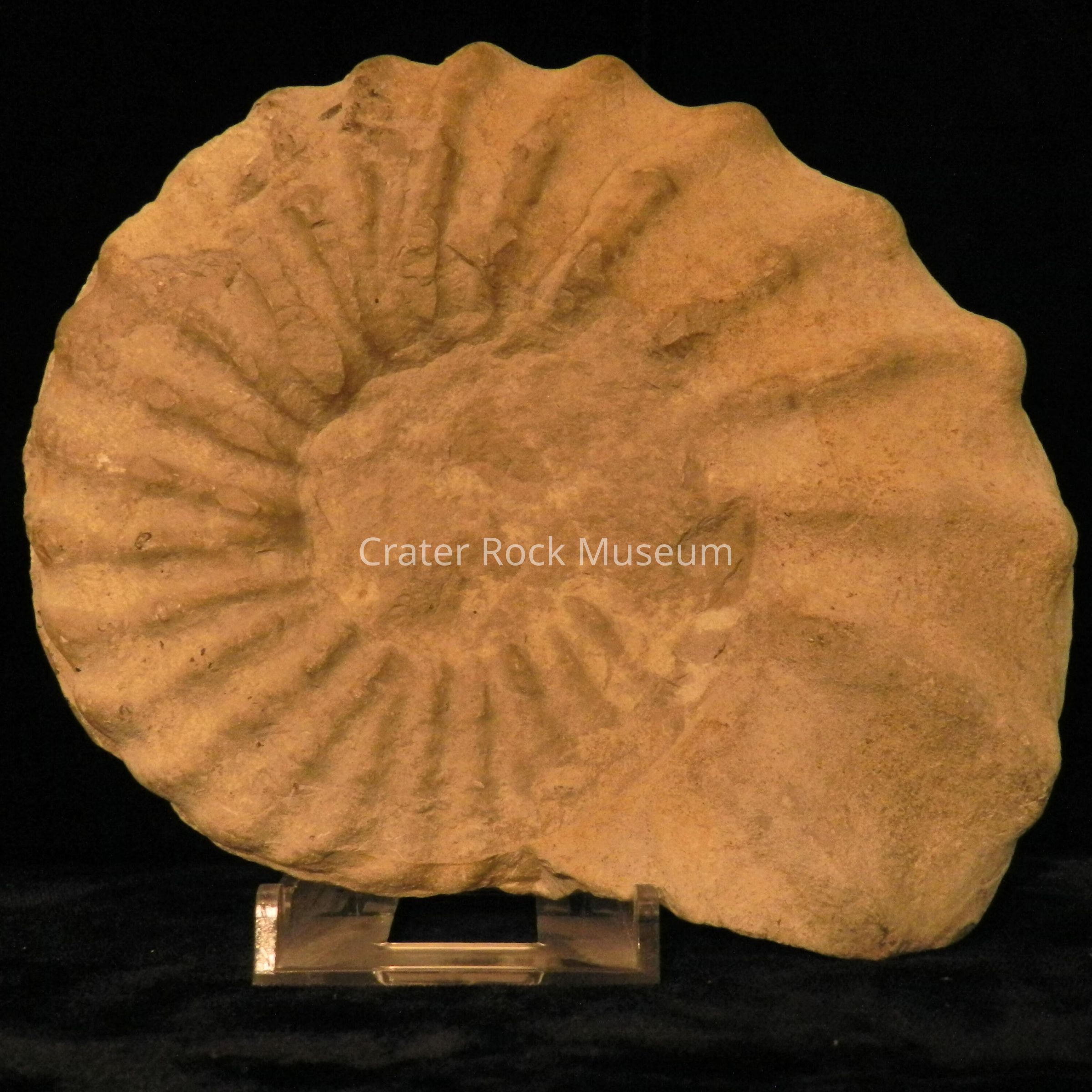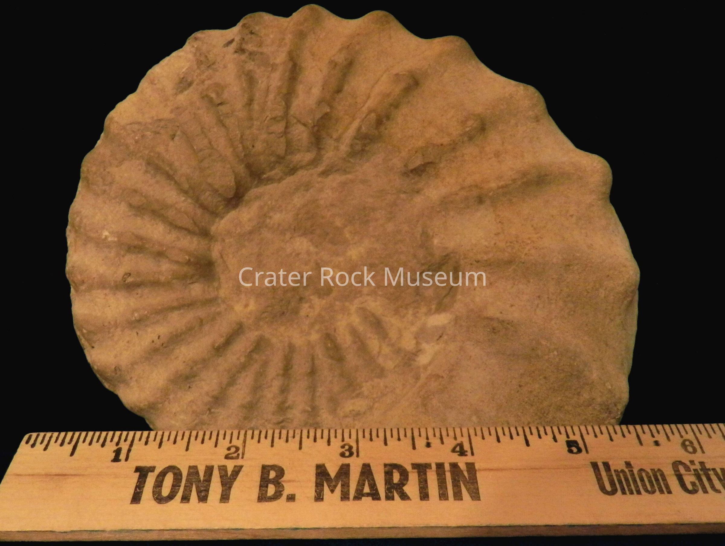Description: One cast of an ammonite. Tightly coiled and has ridges. Color is light beige to pale green.