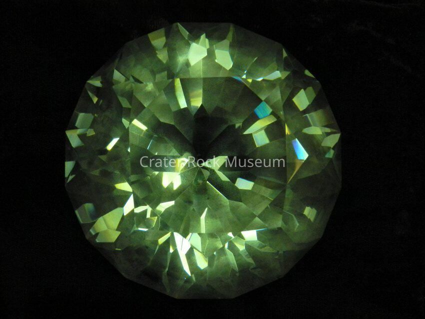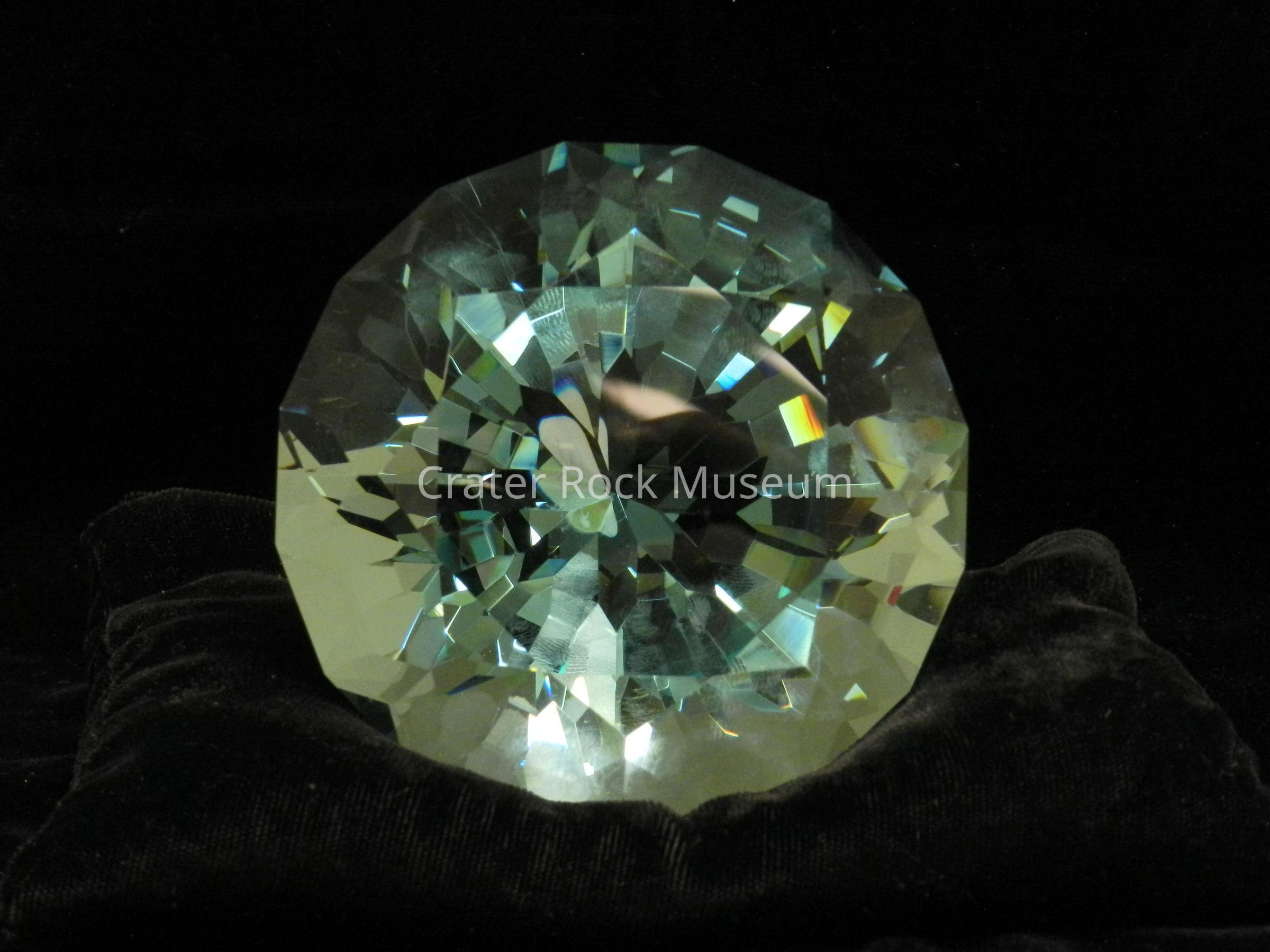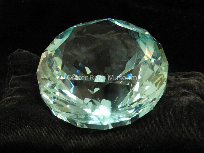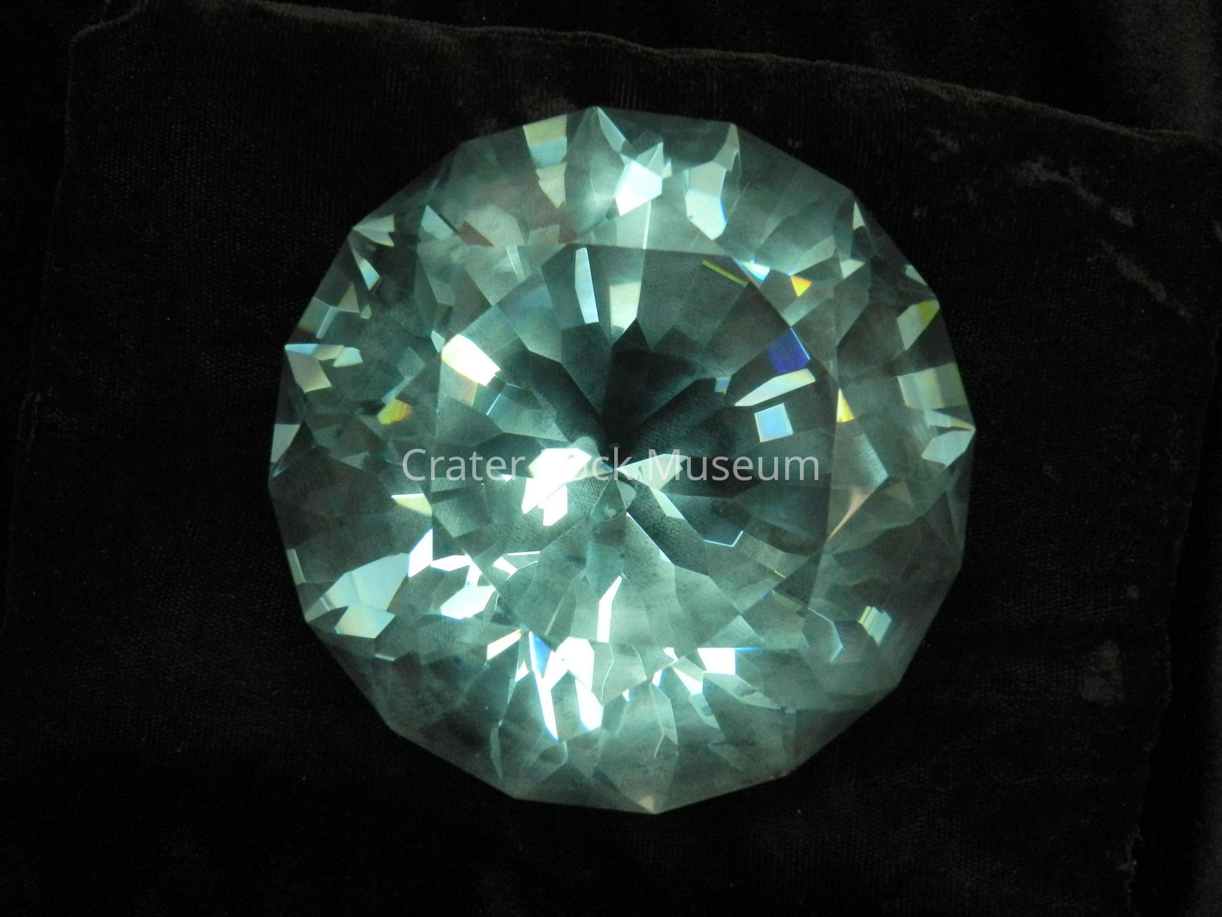 Crystal (large, blue): Synthetic glass (SynG) cut in "Er - Da - How Cut". Light blue. 2887 cts. 129 facets. Circular face.Collection