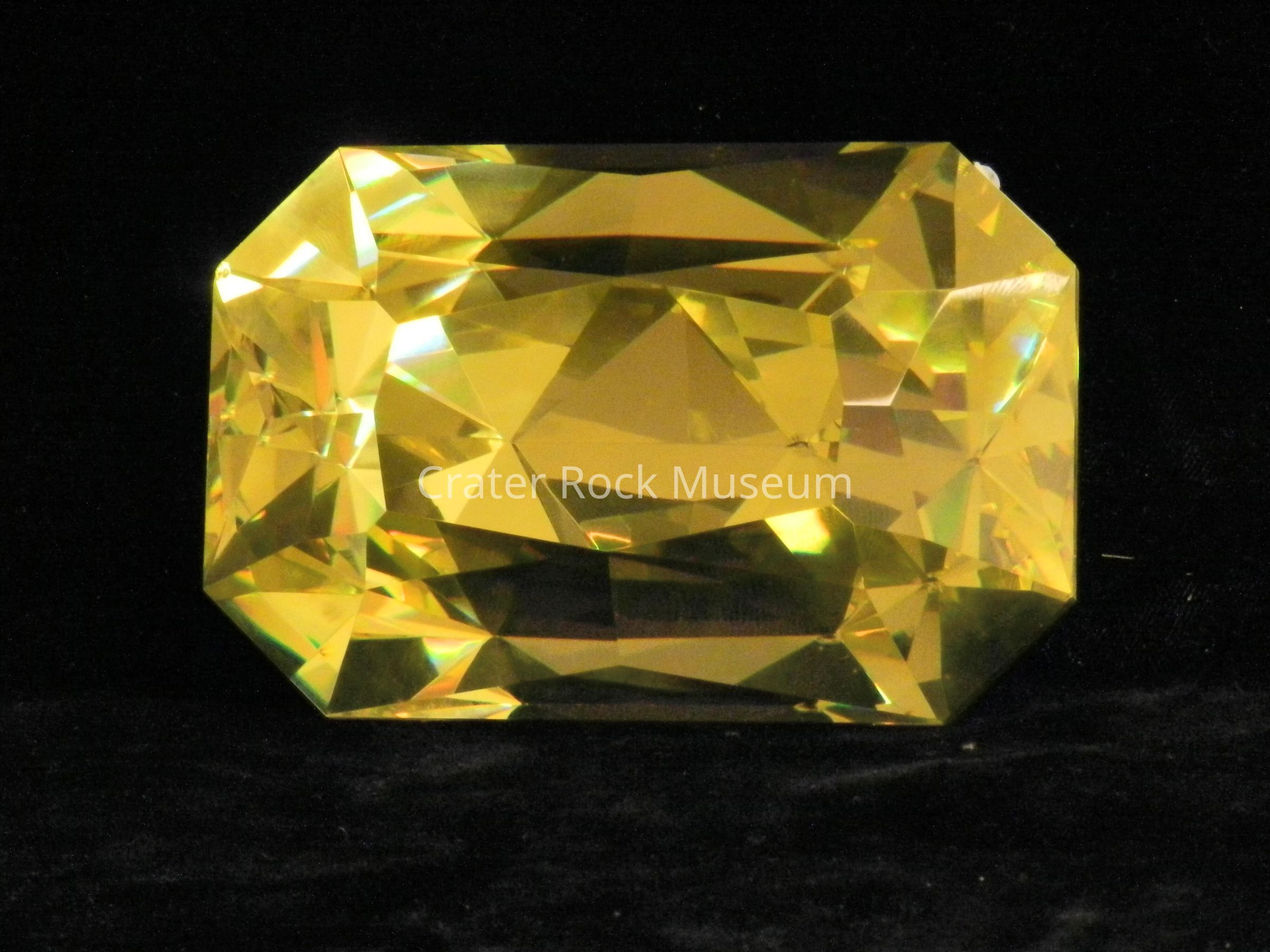 Crystal (large, yellow): Leaded glass cut in "Miser Cut". Yellow. 5375 cts. 63 facets. Semi-rectangular face.Collection