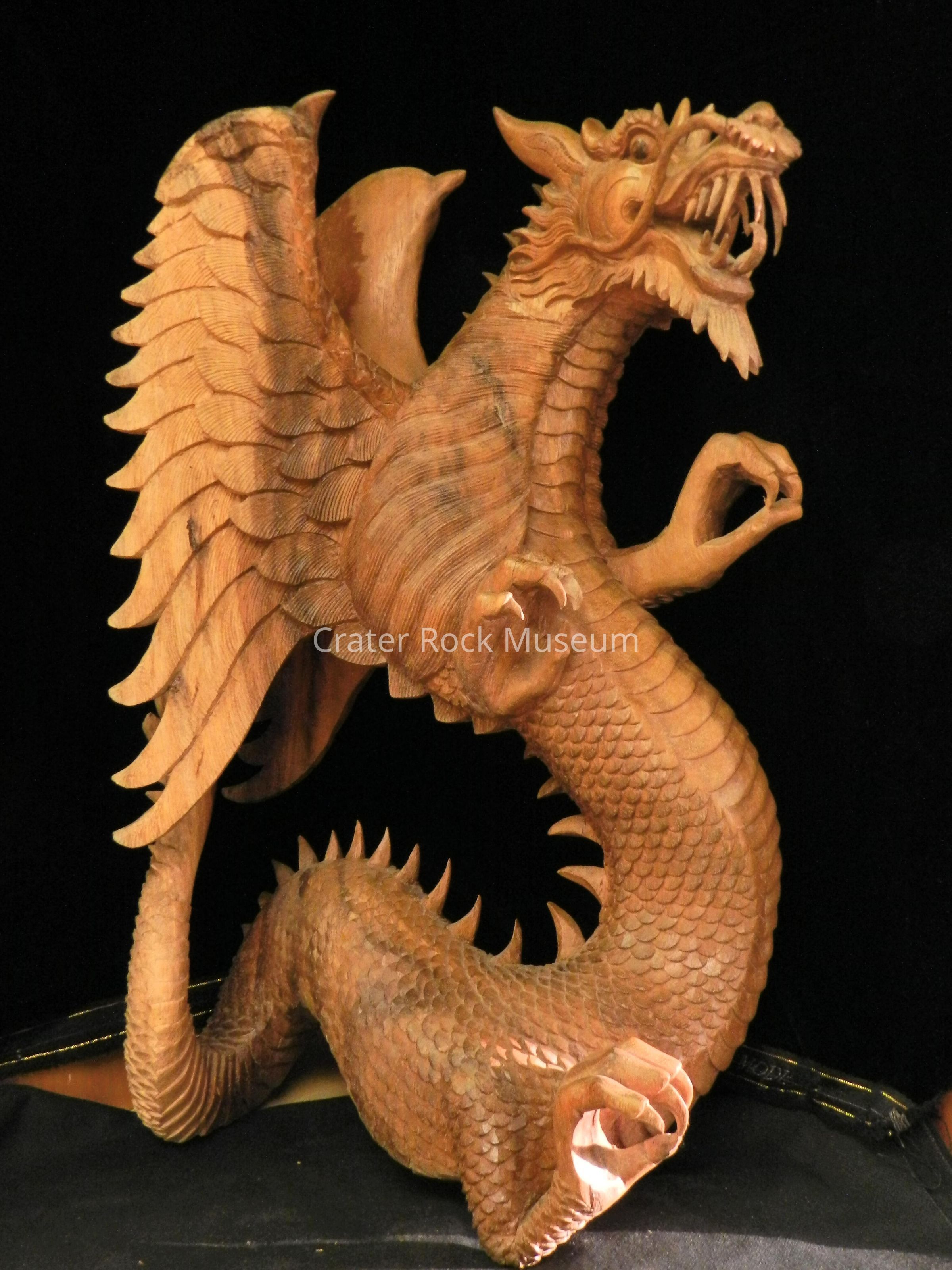 Ornate sculpture from Bali, Indonesia of a medium-sized dragon (empty upraised hand) carved from Rain Tree aka suwar.Collection
