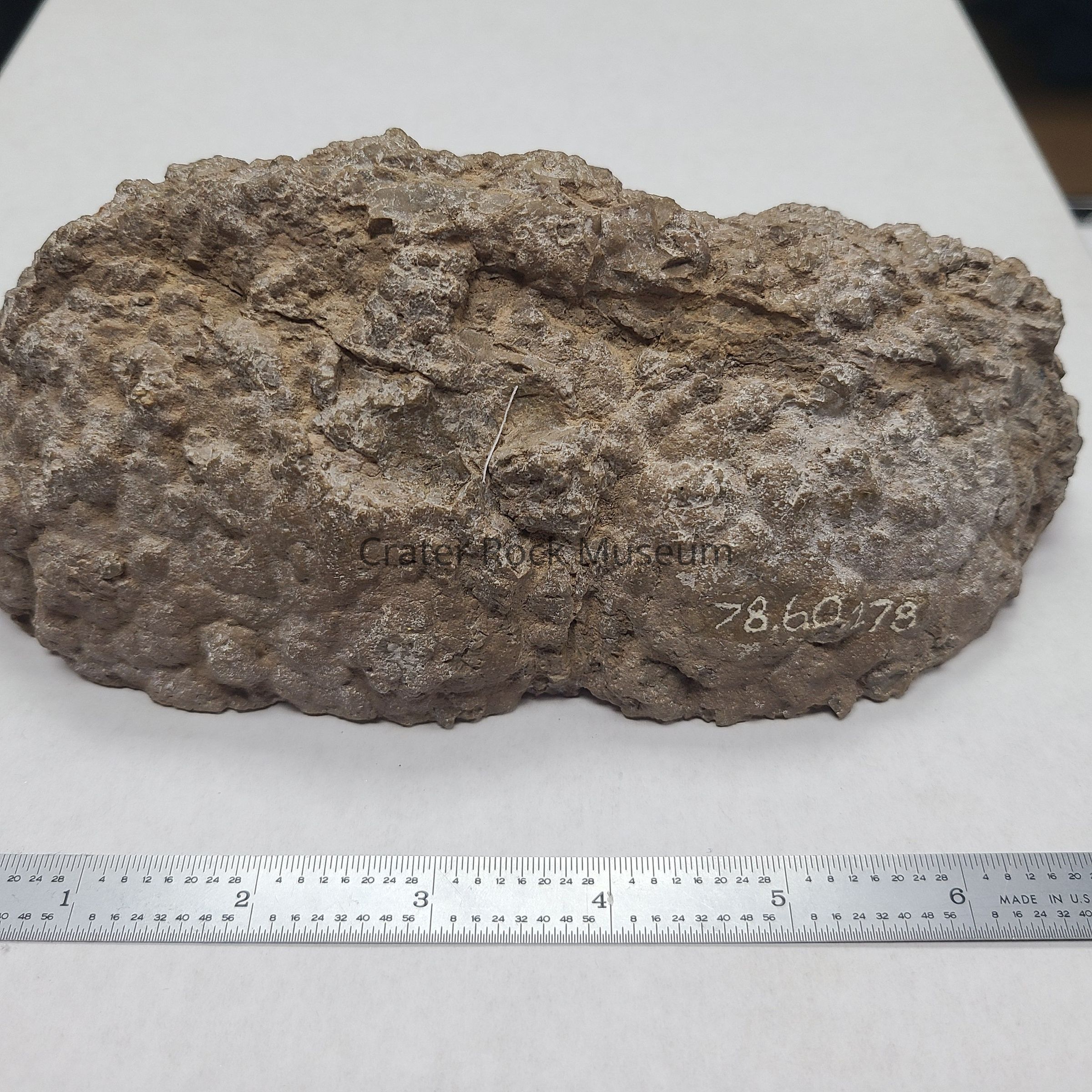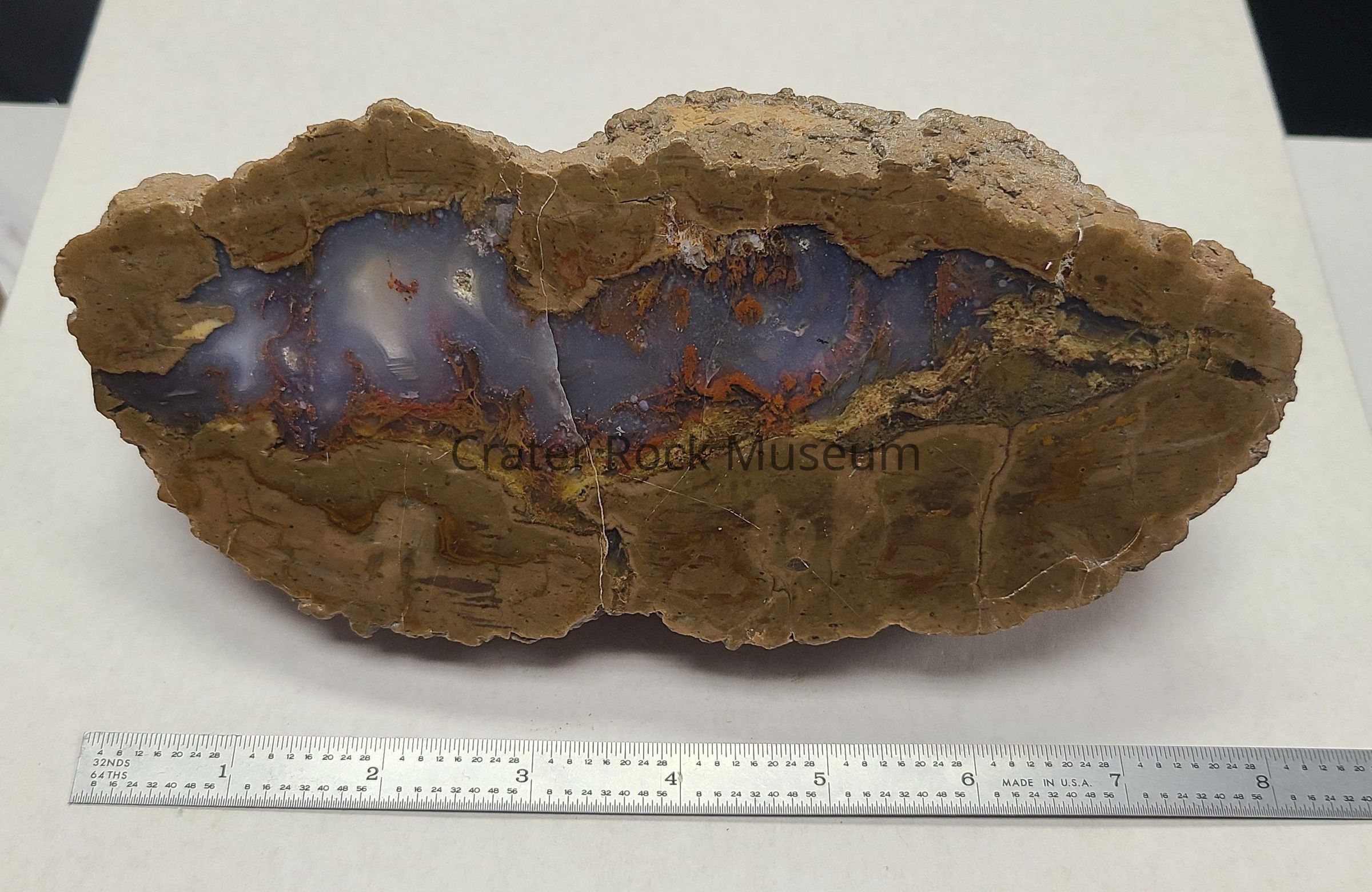 A Thunderegg from the Red Beds, Priday Ranch, Madras, OR (Northern OR). Cut side shows elongated Agate center in Blue Grey with some Crystalline and little bedding and fortified Agate containing Red and Olive colored Moss. Surrounding rock is in Pinkish Olive, Olive and Green with some Orange. Few surface cracks.Dimensions