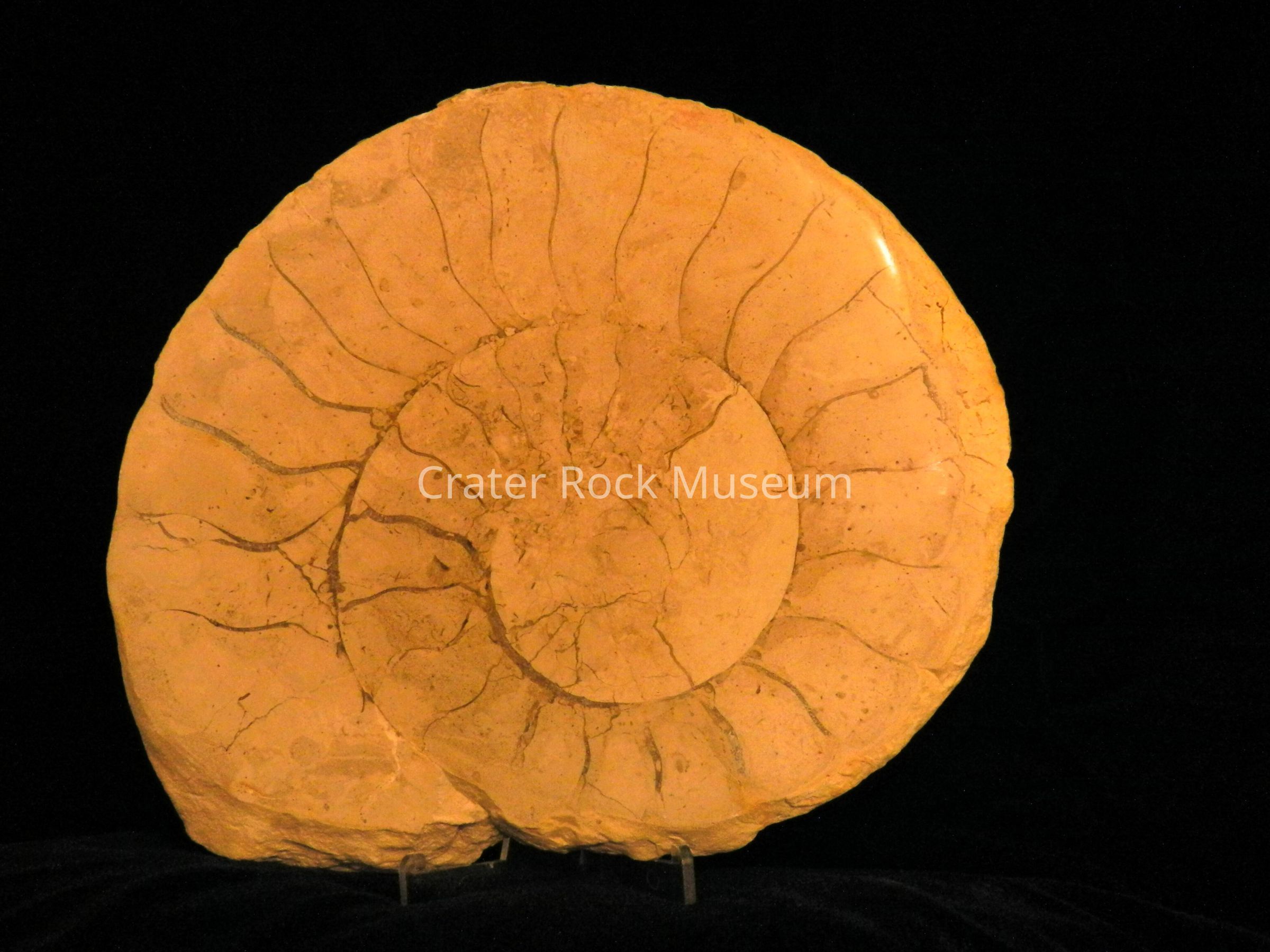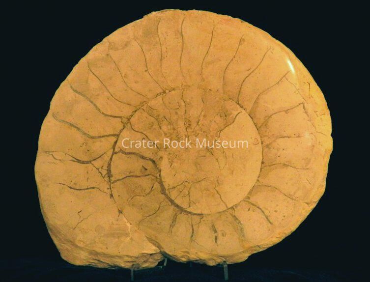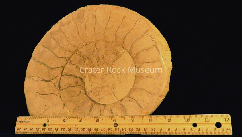 Description: One tightly-coiled cast of an ammonite, showing ridges and some suture pattern. Color is light beige to pale green.