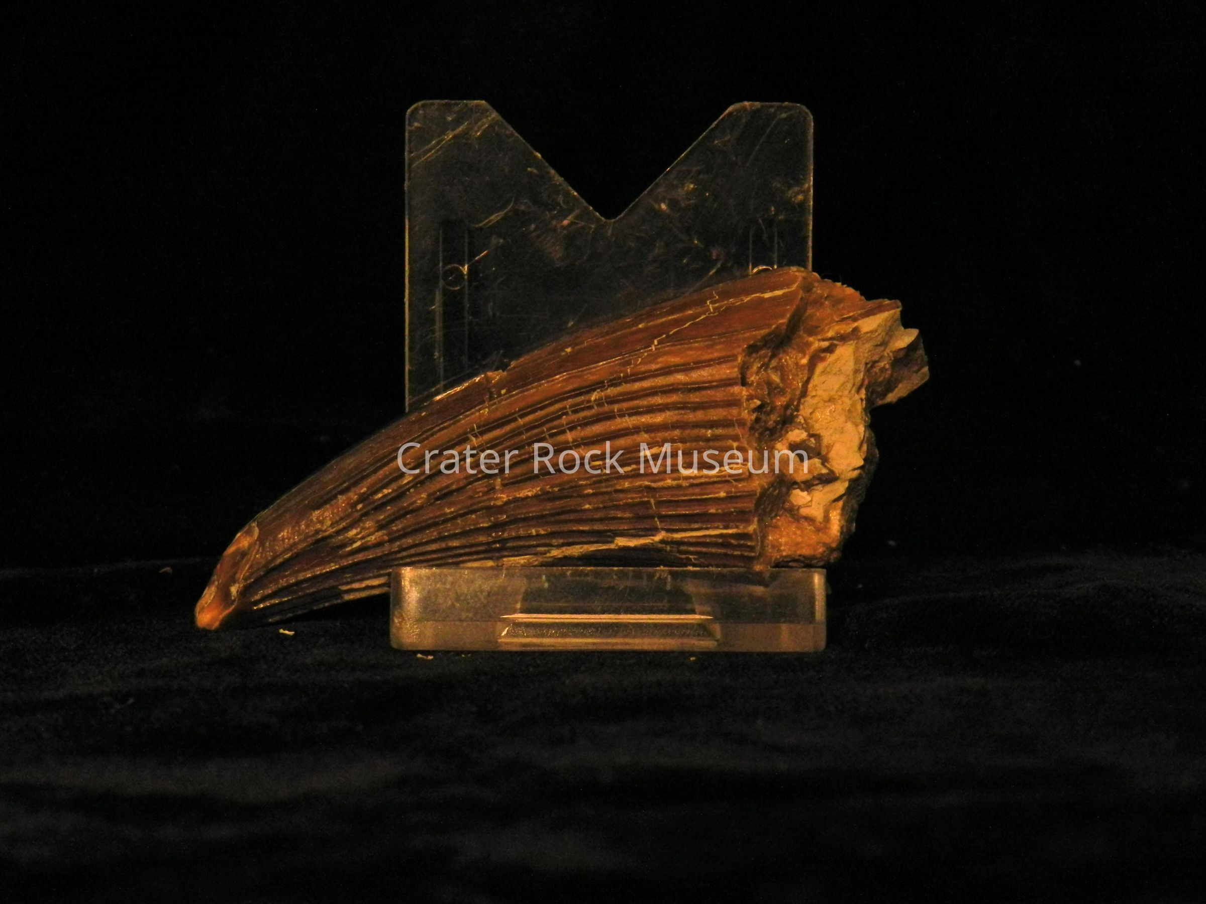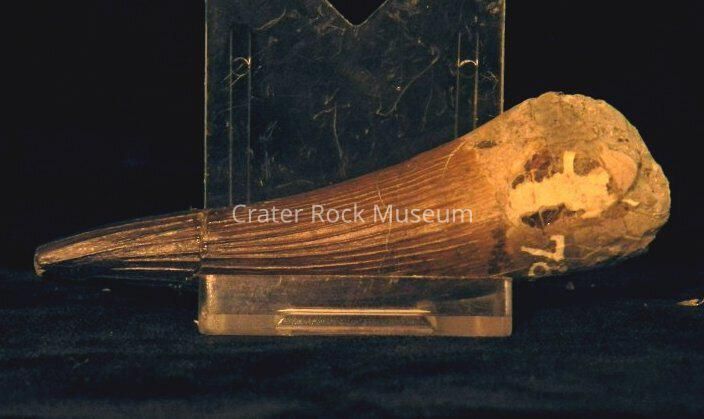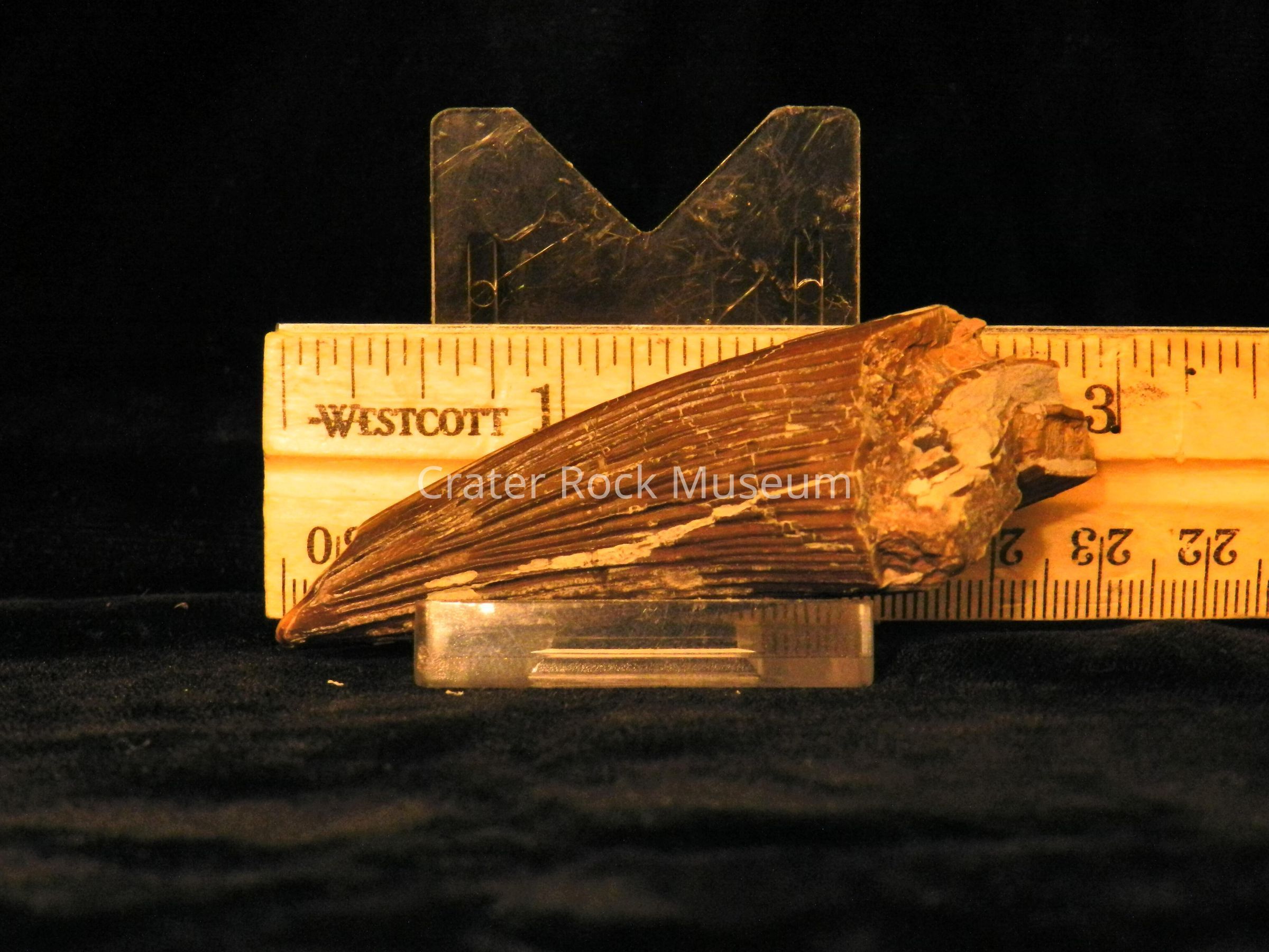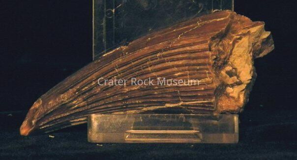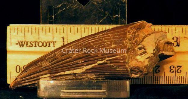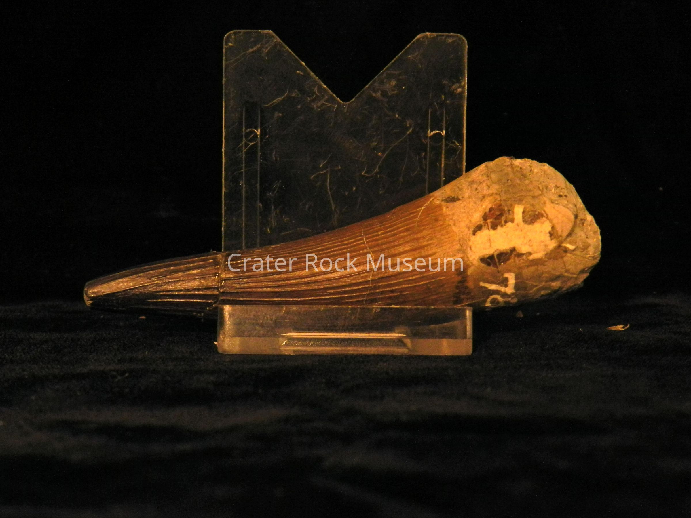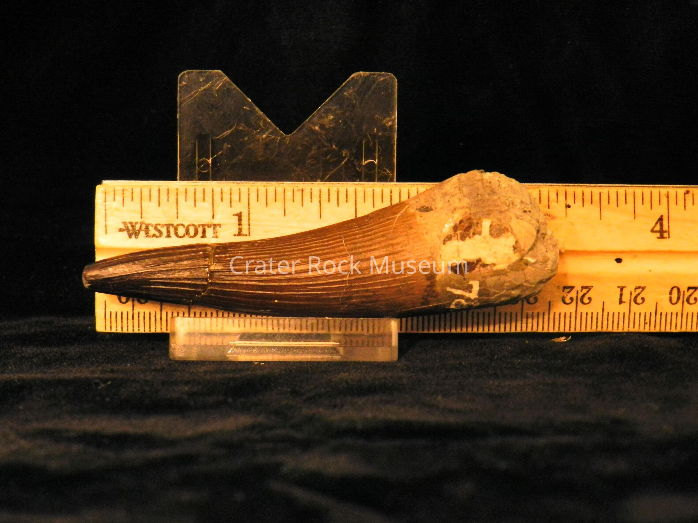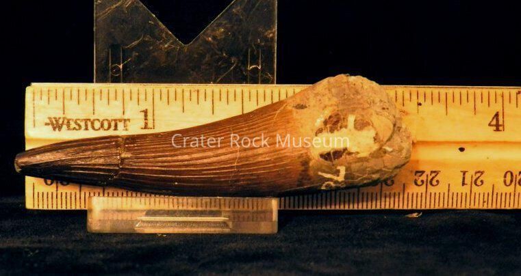 One group of two similar teeth belonging to a giant marine reptile. Both teeth are conical and pointed (resembling large canine teeth).