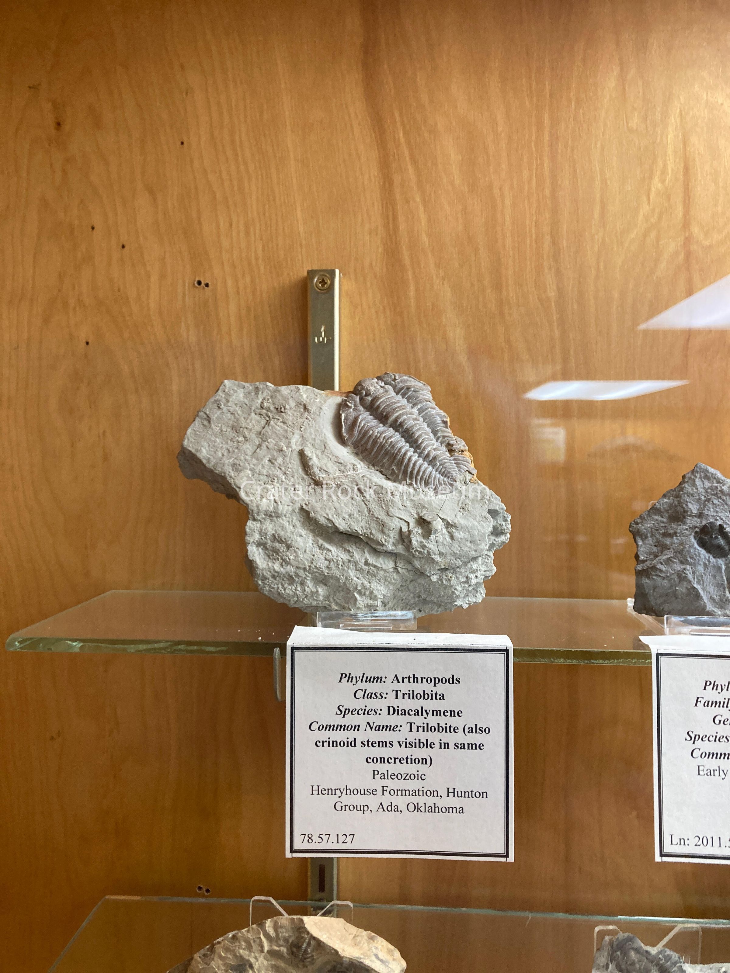 Description: Large, very finely detailed complete fossil covering entire specimen. Matrix is light and dark gray. The fossil is a rusty brown with some lighter patches. Note that two ammonite specimens each have the 78.57.127 accession number 'painted' on them. The second one is in Case #51, Right Side, Bottom / Front Row, Left. (4.6" x 4.3" x 1.2")