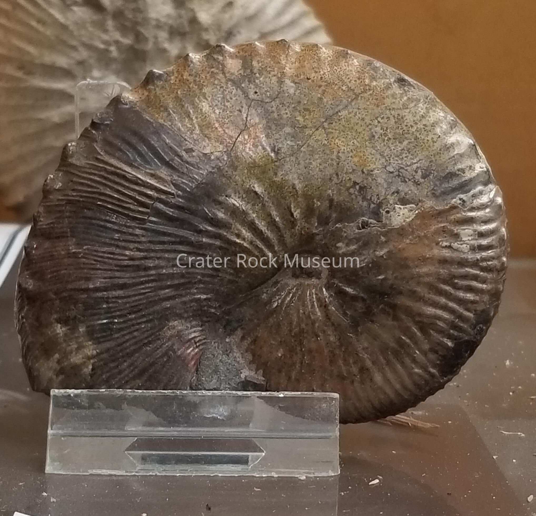 One Ammonite, tightly coiled with ridges. Mother-of-Pearl coating.