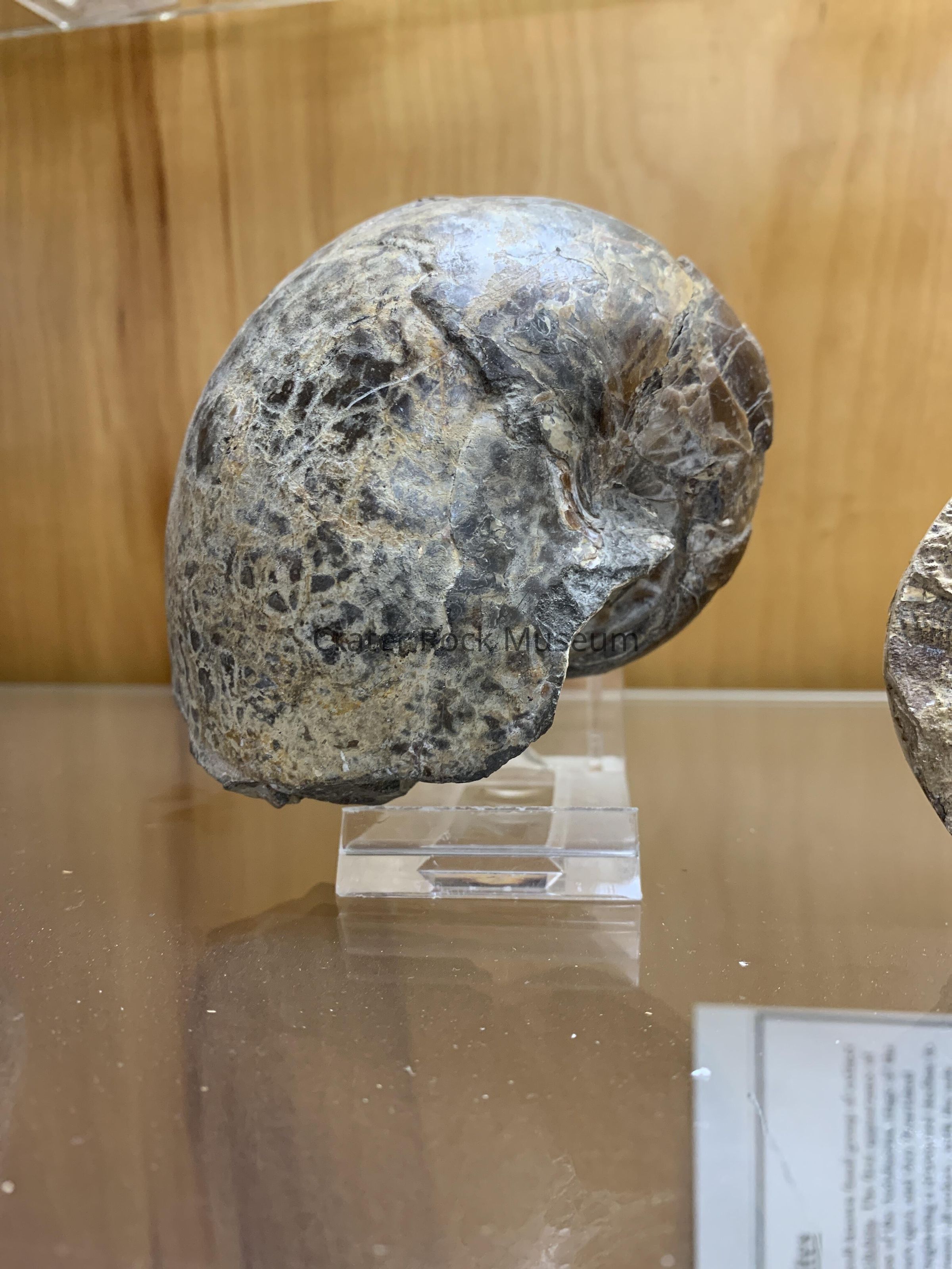 Description: One Nautiloid which is the oldest of the cephalopods, showing coiled, chambered shell.