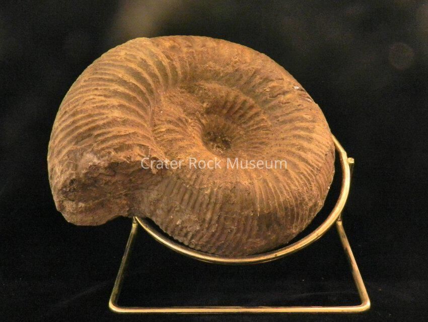 One tightly coiled, evolute, ammonitic ammonite, of the genus Stephanoceras, showing characteristic ridges, ribbing, and suture pattern.
