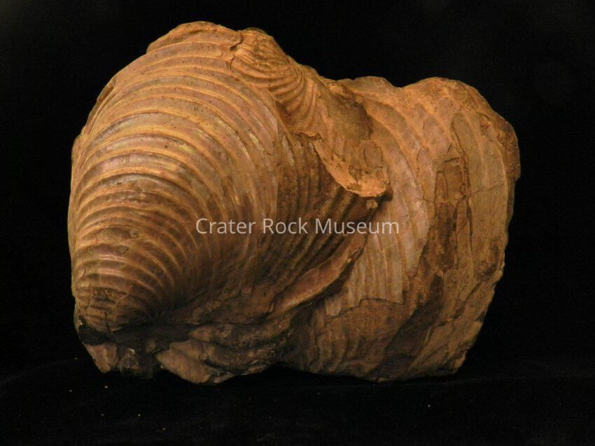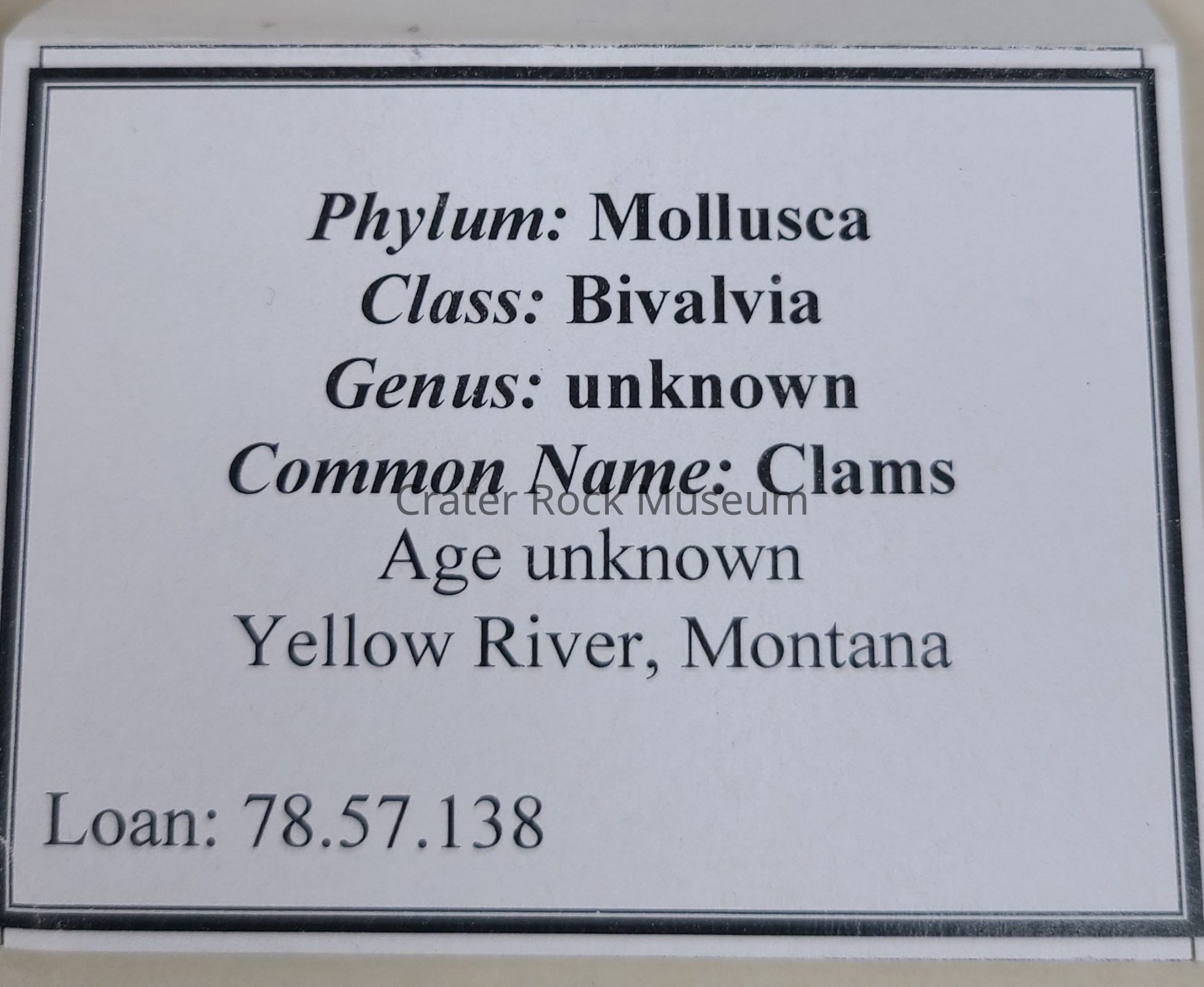 Description:One group of bi-valved shells in concretion. Coated with mother of pearl showing concentric ridges.