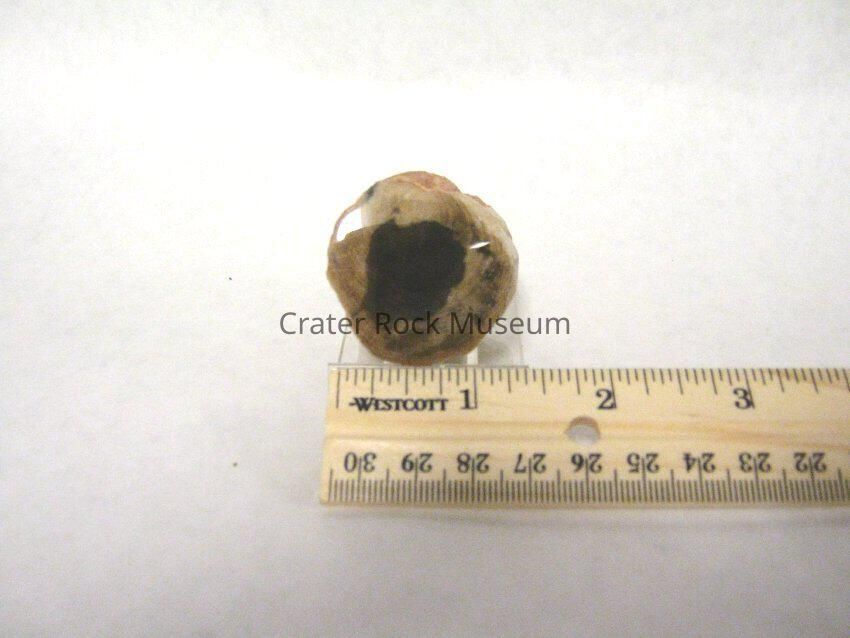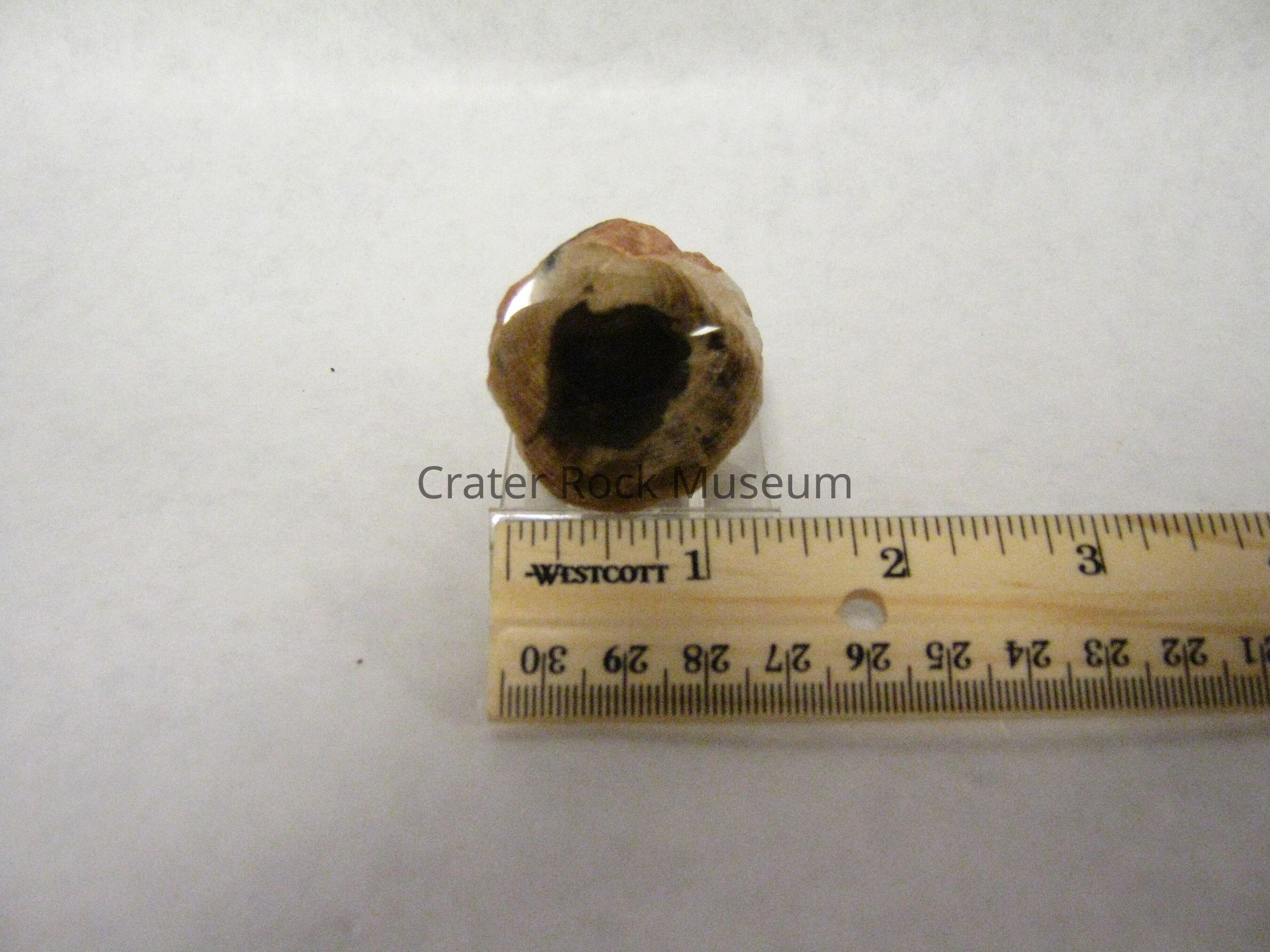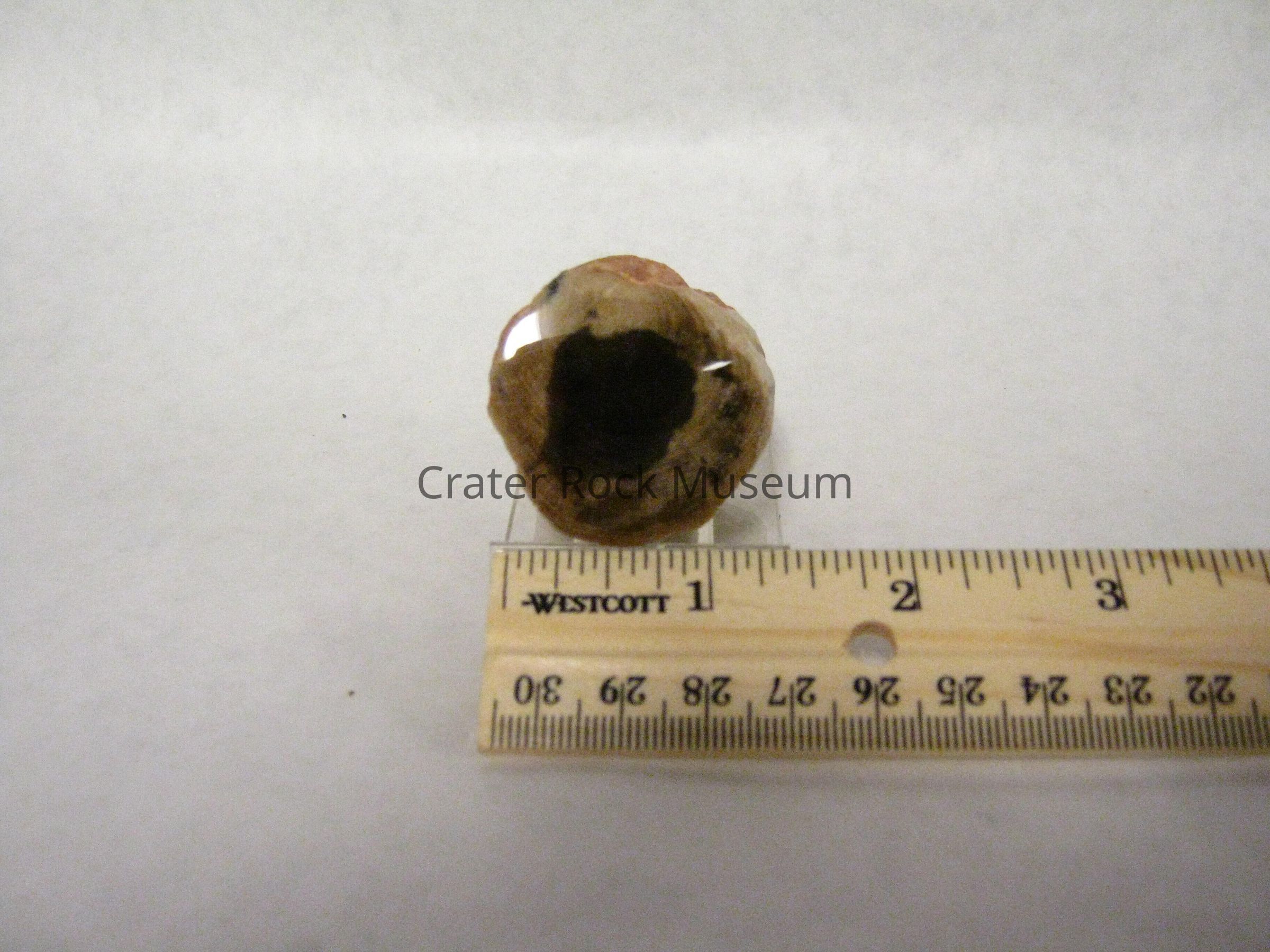 Description: Small, short branch, reddish-orange on the outside with tan, beige and black outer band with a dark spot in the center. Growth rings are visible on outer band.