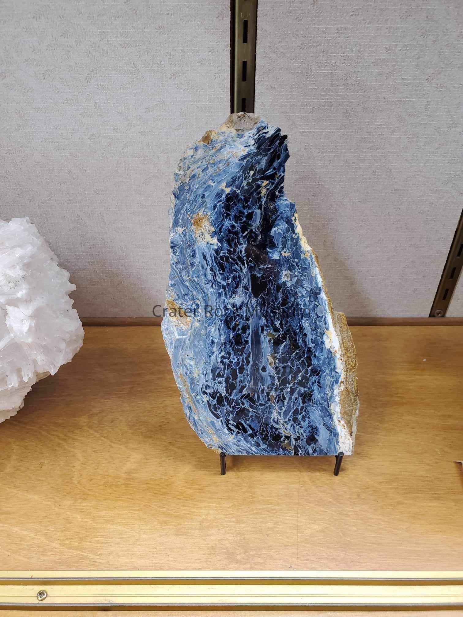 Blue-gray, brown and yellow colors. The fibers cause a chatoyancy similar to that seen in tiger's eye, but tiger's eye is not made of chalcedony, it is macrocrystalline quartz.Location